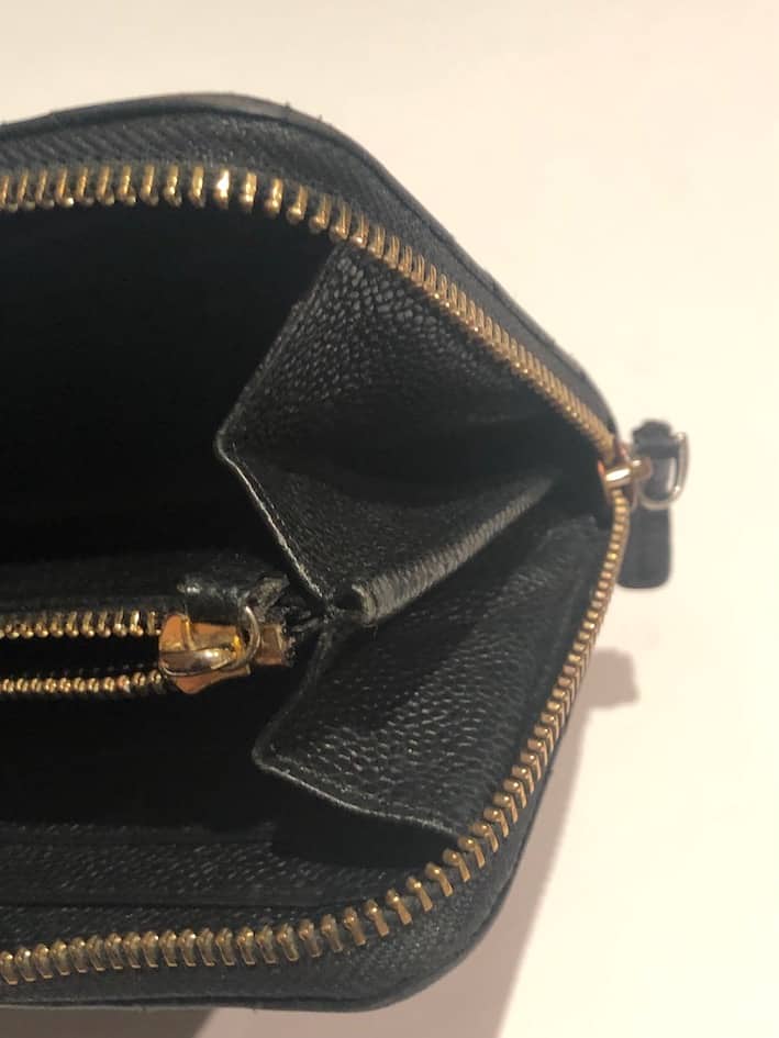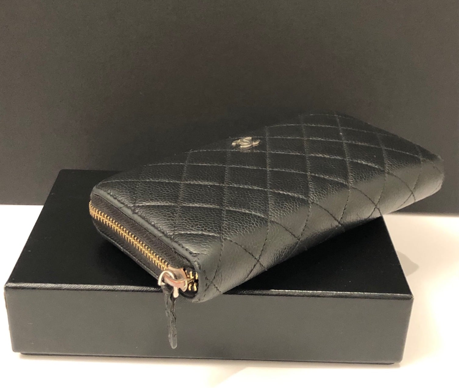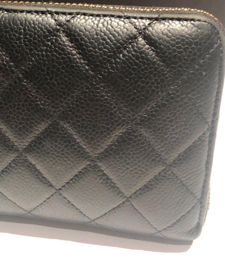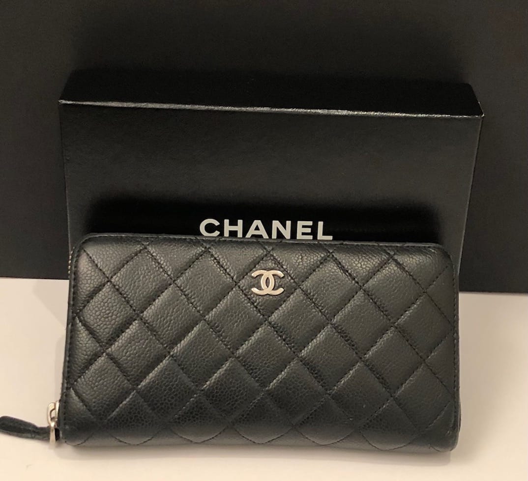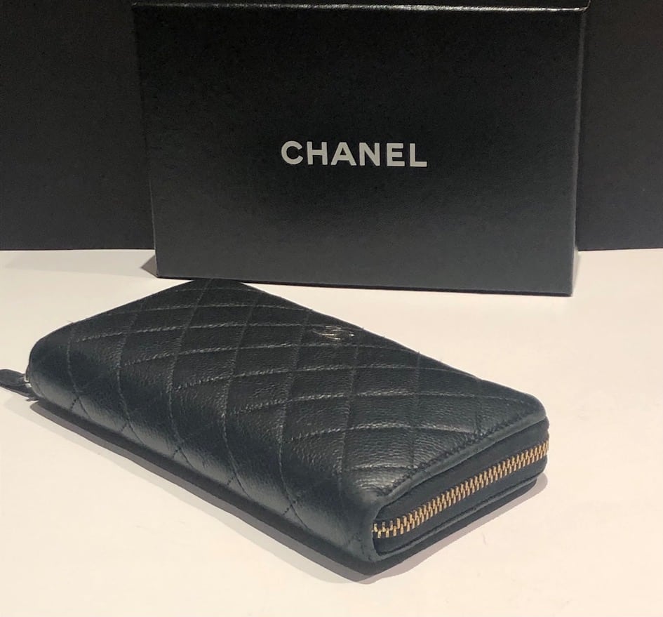 A long quilted caviar leather Chanel CC logo wallet with zip. A central full length zipped pocket and on each side four card slots and a full length bank note holder with larger central holding space on each side of the central zipped pocket. All in caviar leather. Leather tag with stirrup to close the full length exterior zip. Could be carried as a clutch bag.