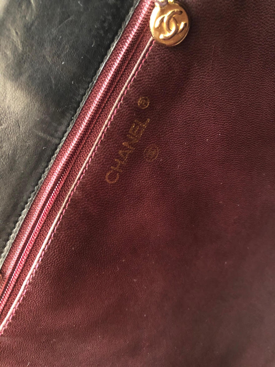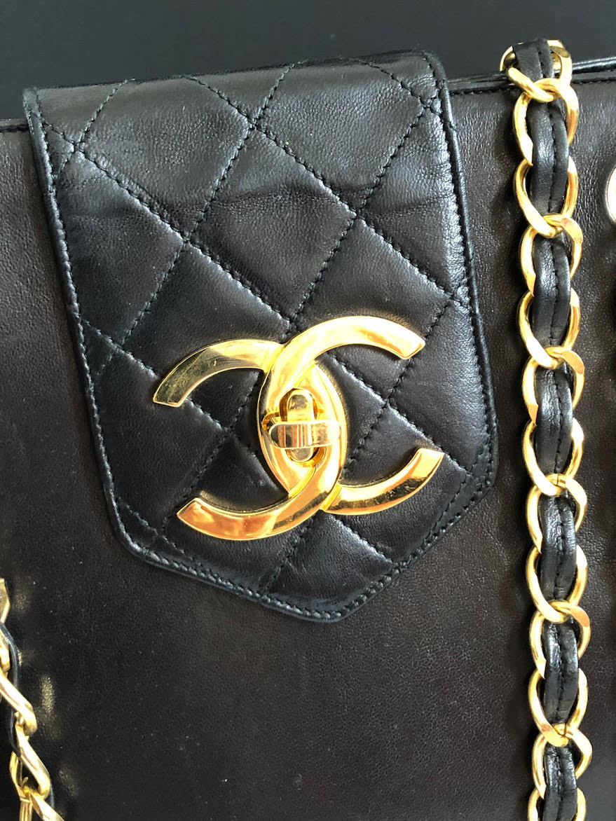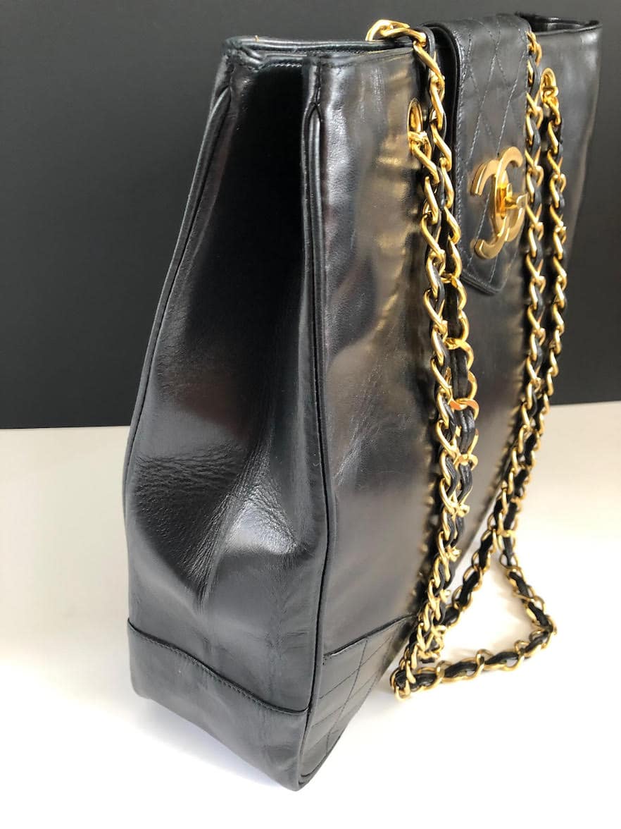 A rare CHANEL leather CC logo tote shopping bag from end 1980s early 1990s. Double gold tone long chain interlaced leather shoulder strap. The gold hardware is amazing. Closing with a large quilted flap with a large CC logo twist lock clasp (6 cm x 4.5 cm). Decorated on each side of the bag, front and back with a diamond quilted square patch on each corner for an elegant design. The interior is lined in burgundy leather, one large zipped pocket with cc logo push tag. Very functional and elegant.