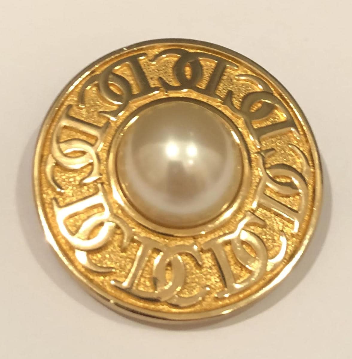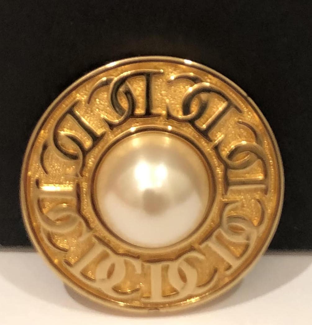 CHRISTIAN DIOR 1980s Vintage Gold Tone Faux Pearl CD Logo Round Brooch Pin
