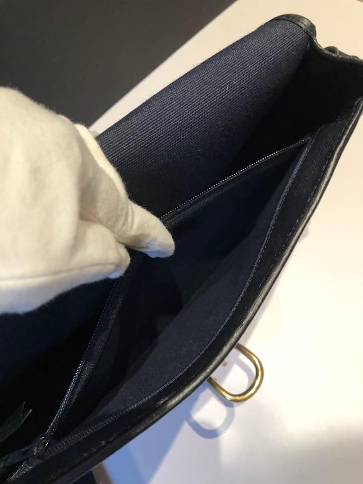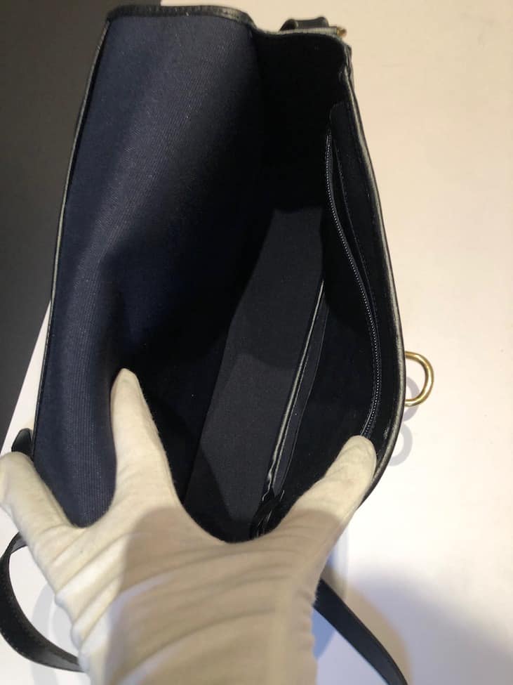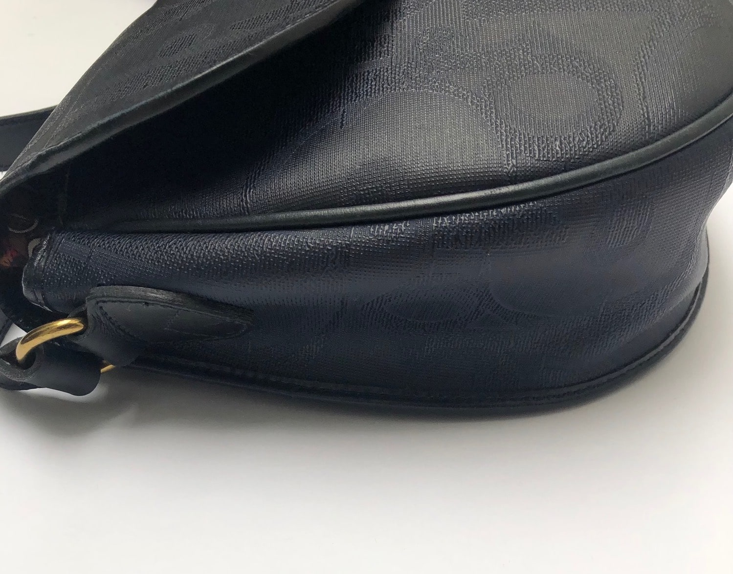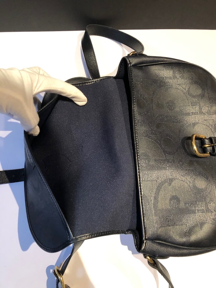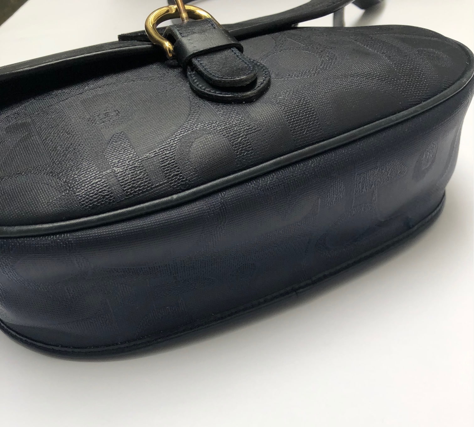 A stylish and a very rare Christian Dior 1990s Bobby trotter-messenger bag 28 cm navy with Dior logo monogram. This beautiful bag is named after Monsieur Christian Dior’s beloved dog, Bobby. It is handcrafted in deep navy blue (close to black) vinyl canvas embossed with Dior monogram with navy blue leather trims. Adjustable leather shoulder crossbody strap with gold tone buckle hardware. The interior is lined with navy blue Corduroy canvas and leather, one zipped pocket with OPTI DMC zip and a leather pull tag and, one interior slip pocket on the interior of the flap (to hold note/letters) with CHRISTIAN DIOR, made in France signature. A beautiful rounded shape, a crescent with a comfortable shoulder strap. This bag is conceived to be a faithful companion in everyday life. Also very easy to maintain and to keep clean. ‘Dior j’Adore’, Must-Have! a Rare Christian piece.