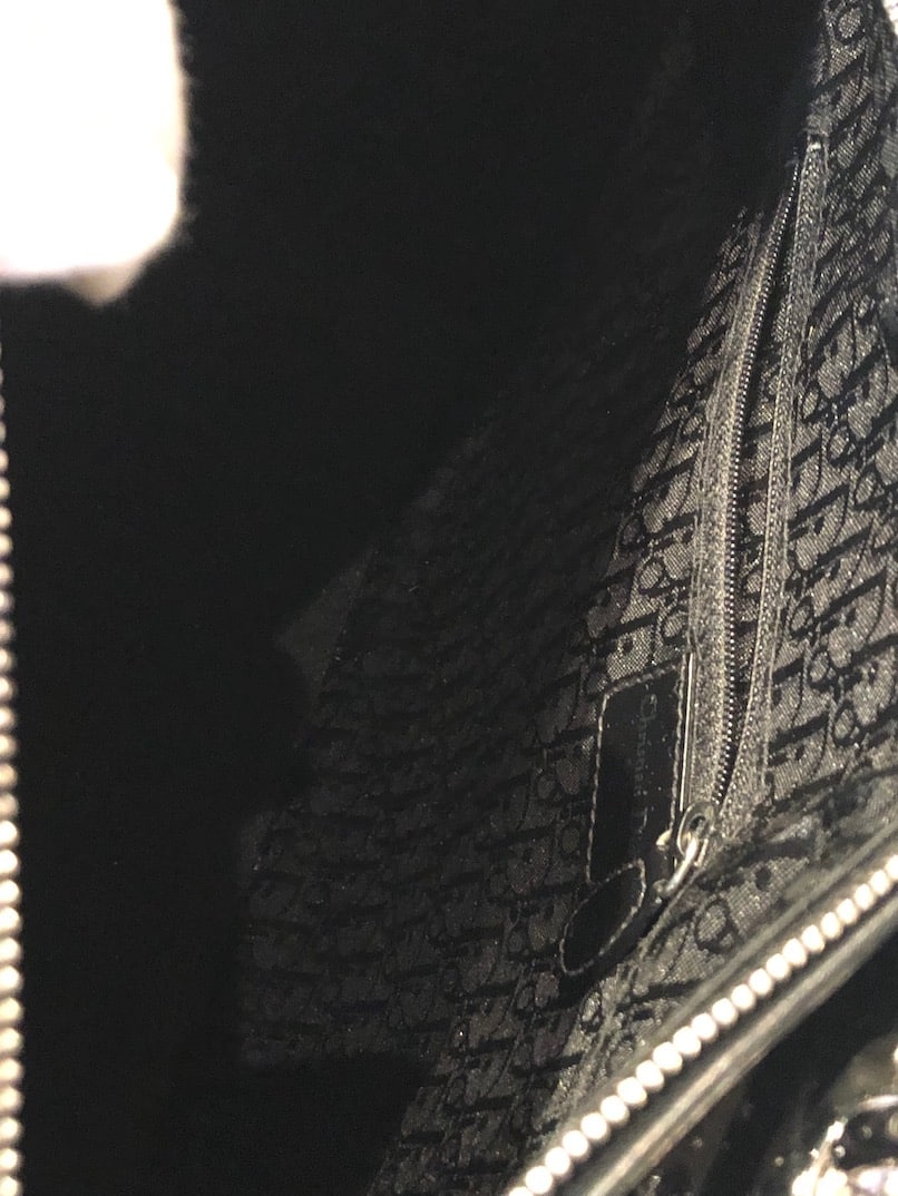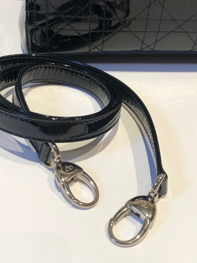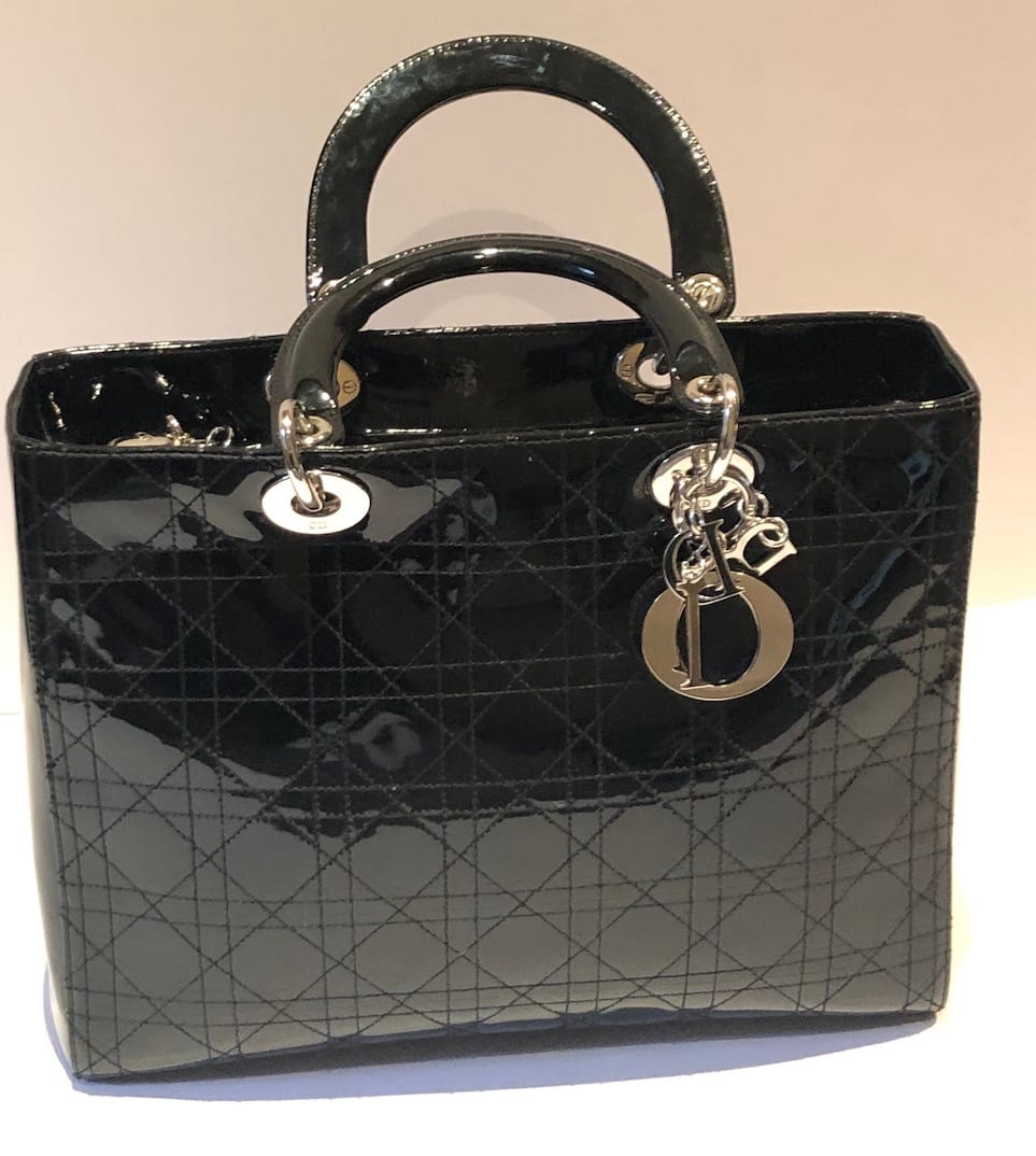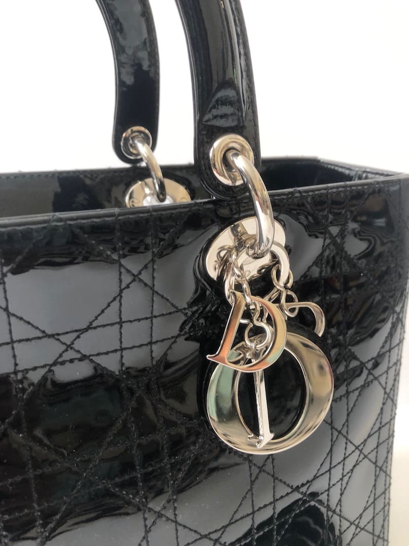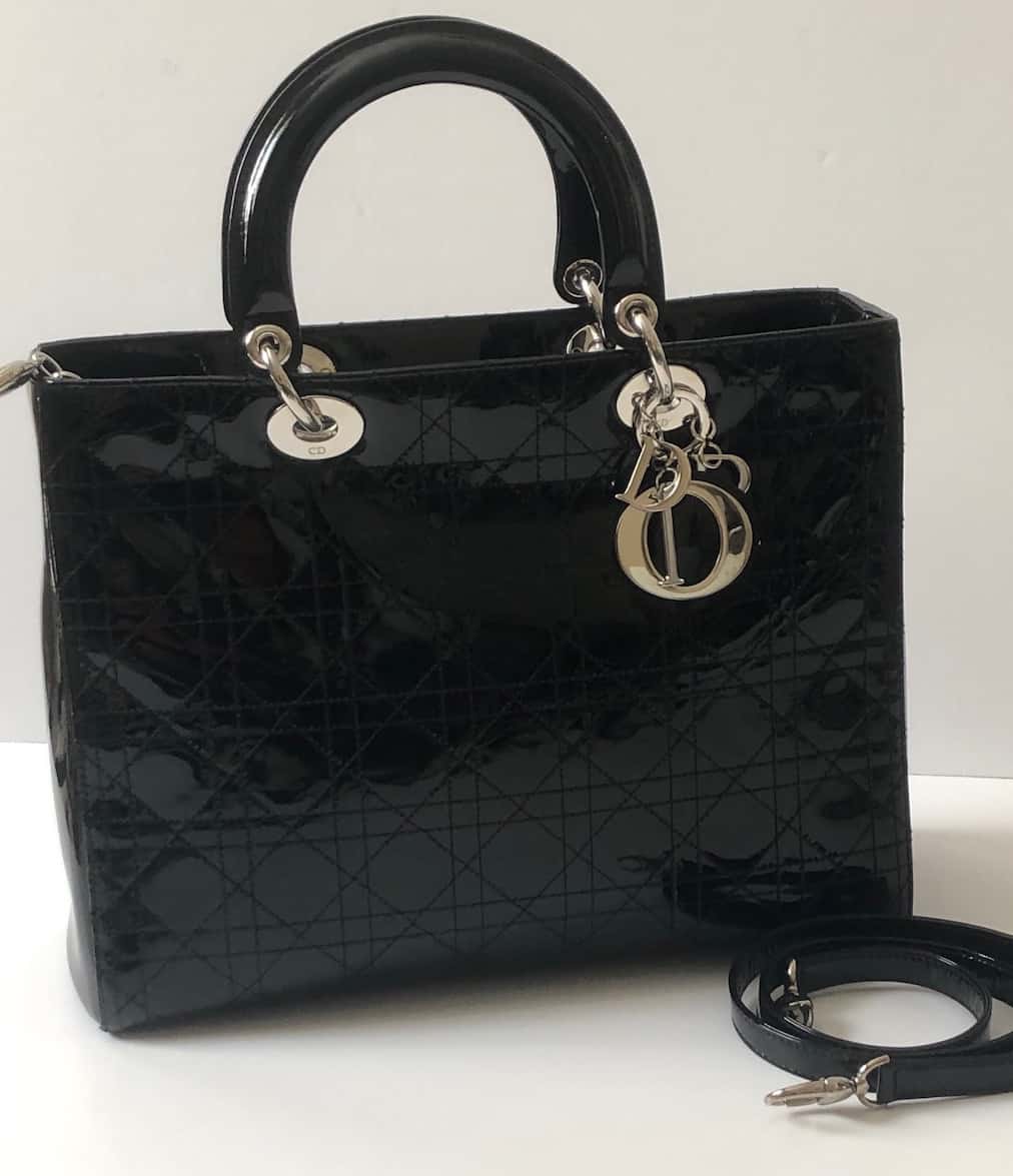 A classic Christian Dior, Lady Dior large bag 32 cm in patent leather from 1990s early 2000. This lady Dior bag represents elegance and beauty and is in perfect condition, never worn. Crafted in black patent calfskin leather with the iconic ‘Cannage’ quilted stitching. Silver metal hardware with silver metal DIOR charms monogram to complete the style. Features a thin and removable leather shoulder strap with two rounded handles. This large Lady Dior bag can be carried by hand, over the shoulder or crossbody. The interior is lined with black Dior fabric, one interior zip pocket, a large patch pocket. The hardware are signed CD including the full length central zipper oval CD logo tag.