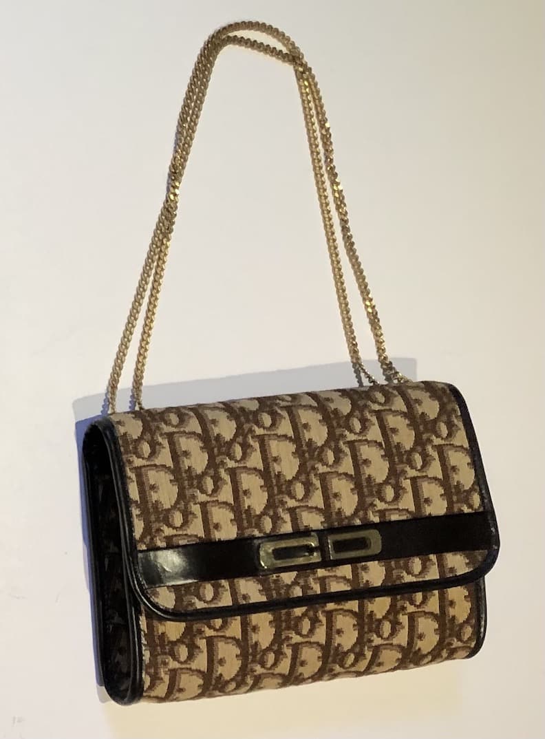 A timeless, rare mini vintage 19 cm Christian Dior shoulder chain bag Circa 70s-80s. Handcrafted in leather canvas beige-brown Dorissima Dior monogrammed with CD gold tone logo on the flap and a gold tone chain shoulder strap. Closes with a hidden interior gold gold tone magnetic push button (replaced) to close easily and firmly. Interior slit pocket on the inside of the flap interior, the interior is lined with dark brown leather. Can be held with the double chain or long single chain shoulder strap. ‘Dior j’Adore’ Must-Have! a very rare and beautiful vintage collector piece.