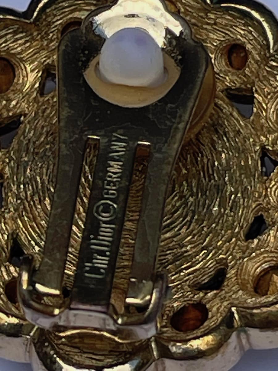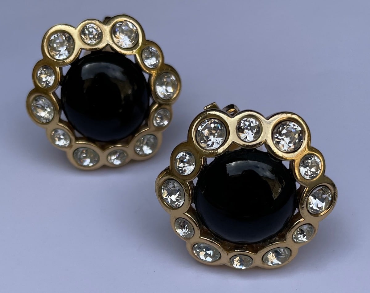CHRISTIAN DIOR Vintage Flower Crystals Onyx Gold Clip Earrings C.1980s W/Box