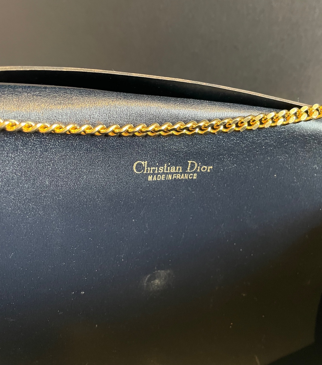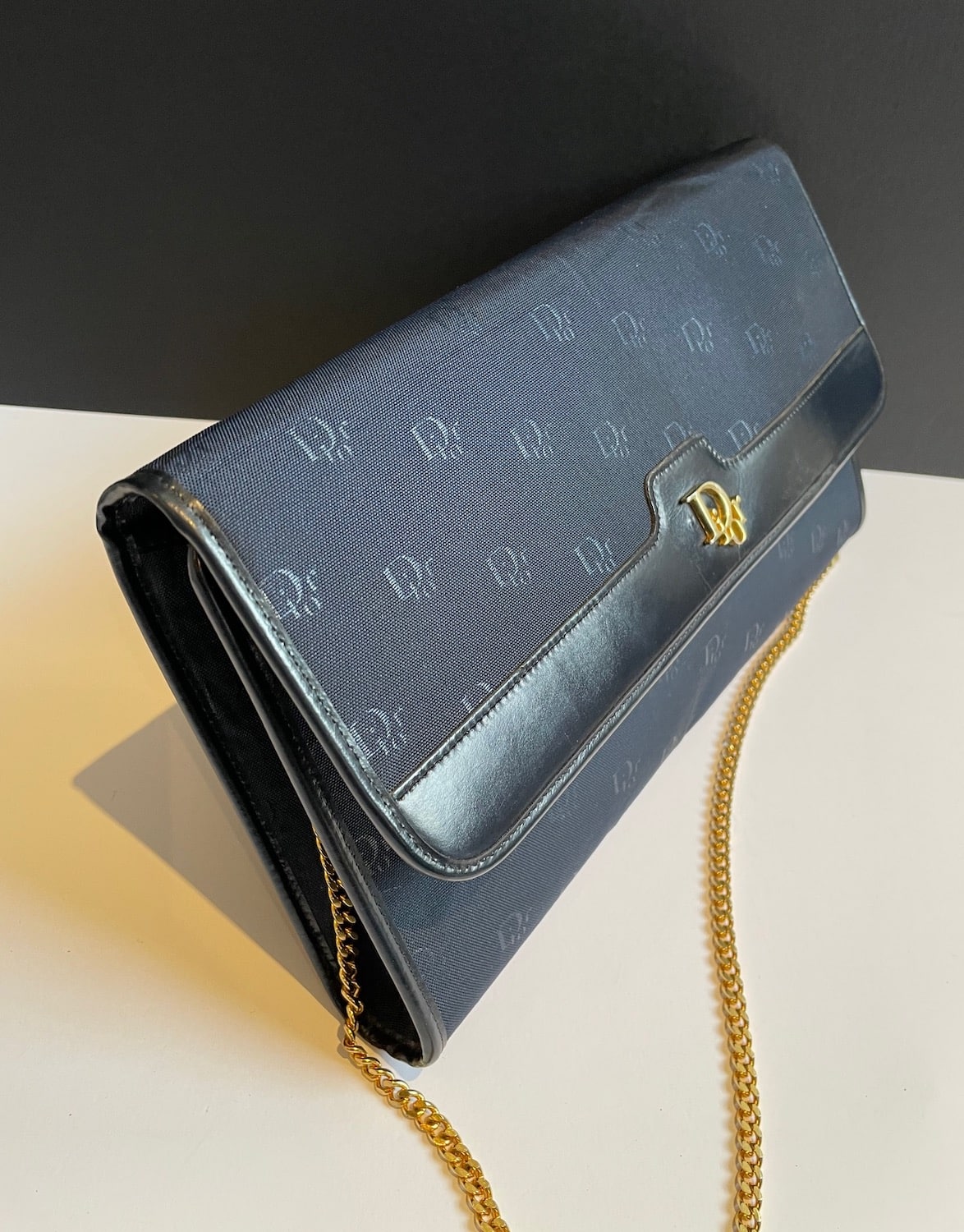 CHRISTIAN DIOR Vintage Monogram Clutch Navy Blue Gold Chain W/Box C.1970