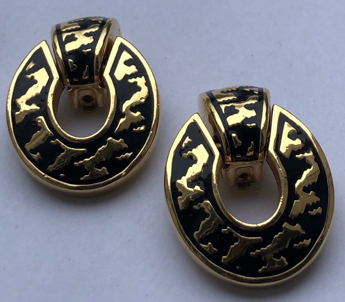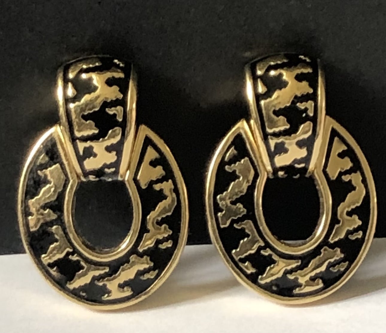 CHRISTIAN DIOR Vintage Oval Clip-On Drop Earrings Black-Gold Design 1980