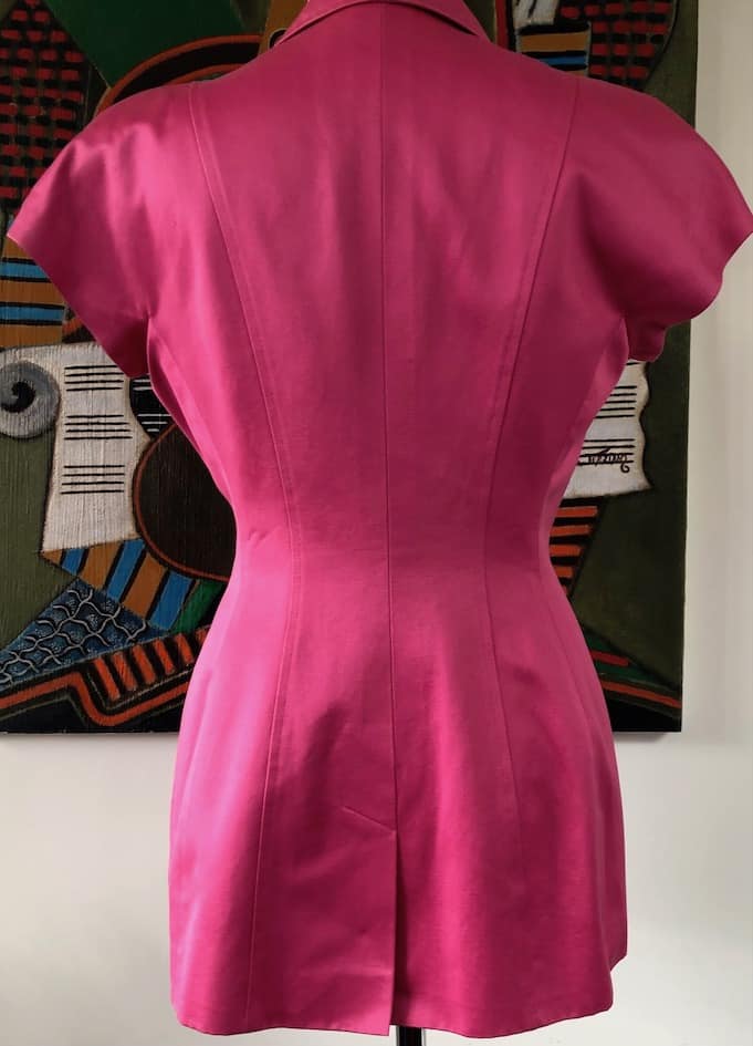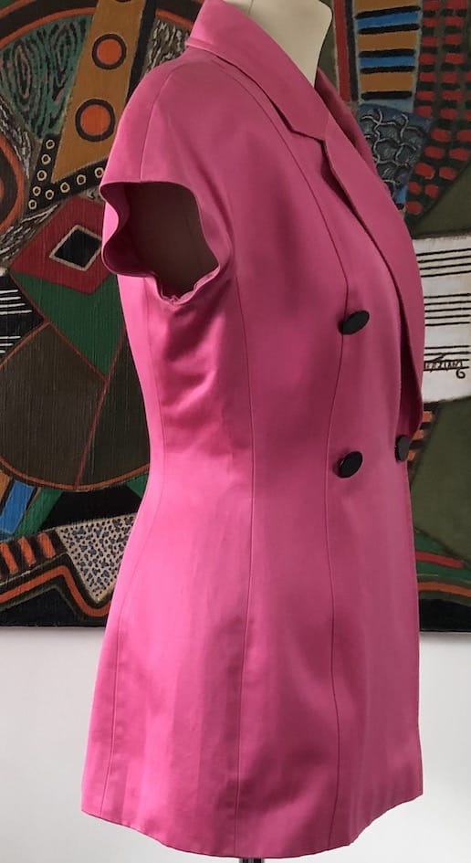 A stunning CHRISTIAN DIOR pink vintage blazer. A fitted double-breasted blazer with four black buttons and short sleeves. It is handcrafted with wool, lined with silk, it is beautifully finished. Its size small, please check the full size details below. It is so class and elegant, to wear on a daily basis.