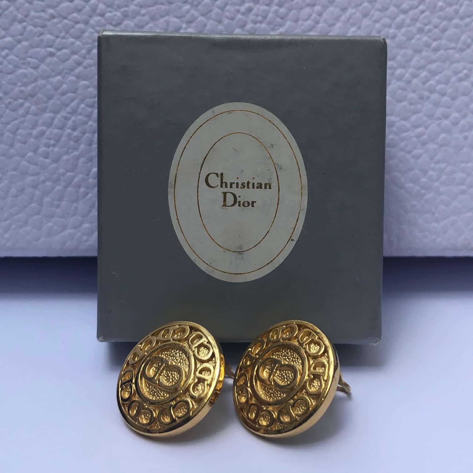 CHRISTIAN DIOR Vintage Small Round CD Monogram Gold Tone Clip-On Earrings 1980s