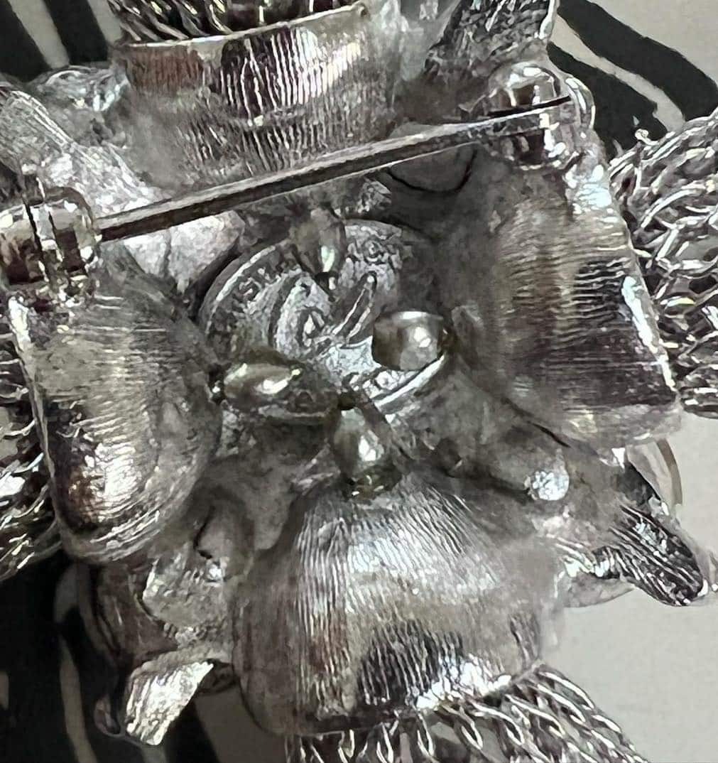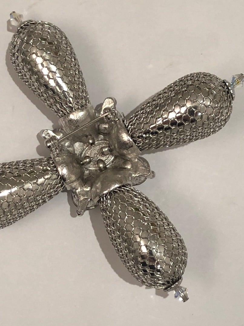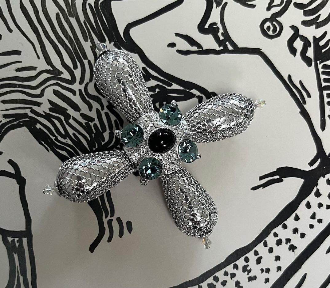 A stunning large Christian Lacroix brooch. Four star shapes in silver hammered finish with crystals pointed ends – embellished with four aquamarine stones with a central cabochon. Signed Christian Lacroix, made in France.