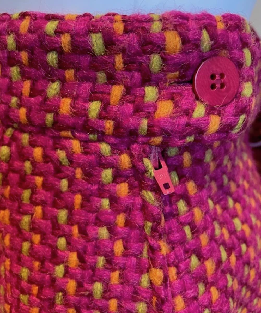 An incredible classic Christian Lacroix 90s tweed jewels suit. The tweed fabric is very rich embellished with luxury jewel buttons. A fabulous pink DARK tone and multicoloured threads fabric. A stunning shape and volume easy to wear daily, two tone notched lapel, front closure with three stunning jewel buttons, three pockets, long sleeves, fully lined. It is a short fitted skirt with a waist belt, zipper on one side, fully lined. The skirt is smaller than the jacket. A “Must-Have” a very rare stunning Christian Lacroix tweed jewel suit! Styled in the photos with a  CHANEL Vintage Pearl Necklace Twisted 24K Gold Plated Charms 1980 W/Box  and an YVES SAINT LAURENT Rive Gauche Vintage Shells & Red Medallion Necklace C.1990s  for sale separately under JEWELLERY, NECKLACES.