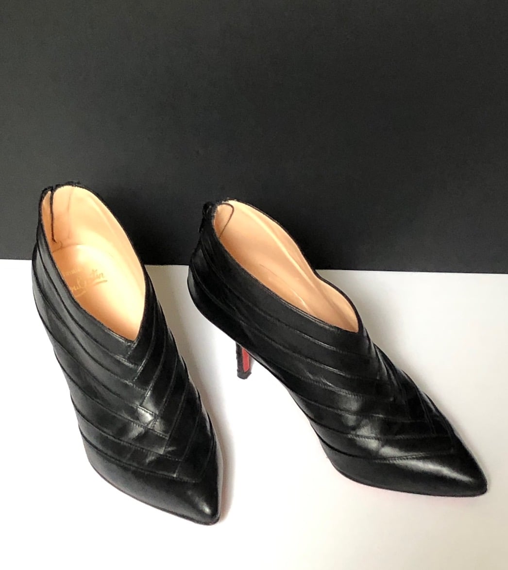 These Christian Louboutin ankle boots are a perfect fit for a beautiful silhouette. Handcrafted in black leather, pointed toes, enhanced with zippers and pleated chevrons designs. The insoles are lined with leather and the pair is complete with the signature red-lacquered soles. In very good condition except underneath. To wear at anytime with any outfit!