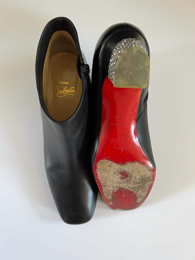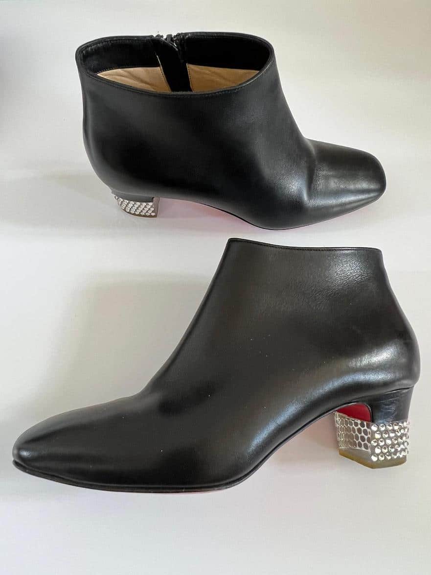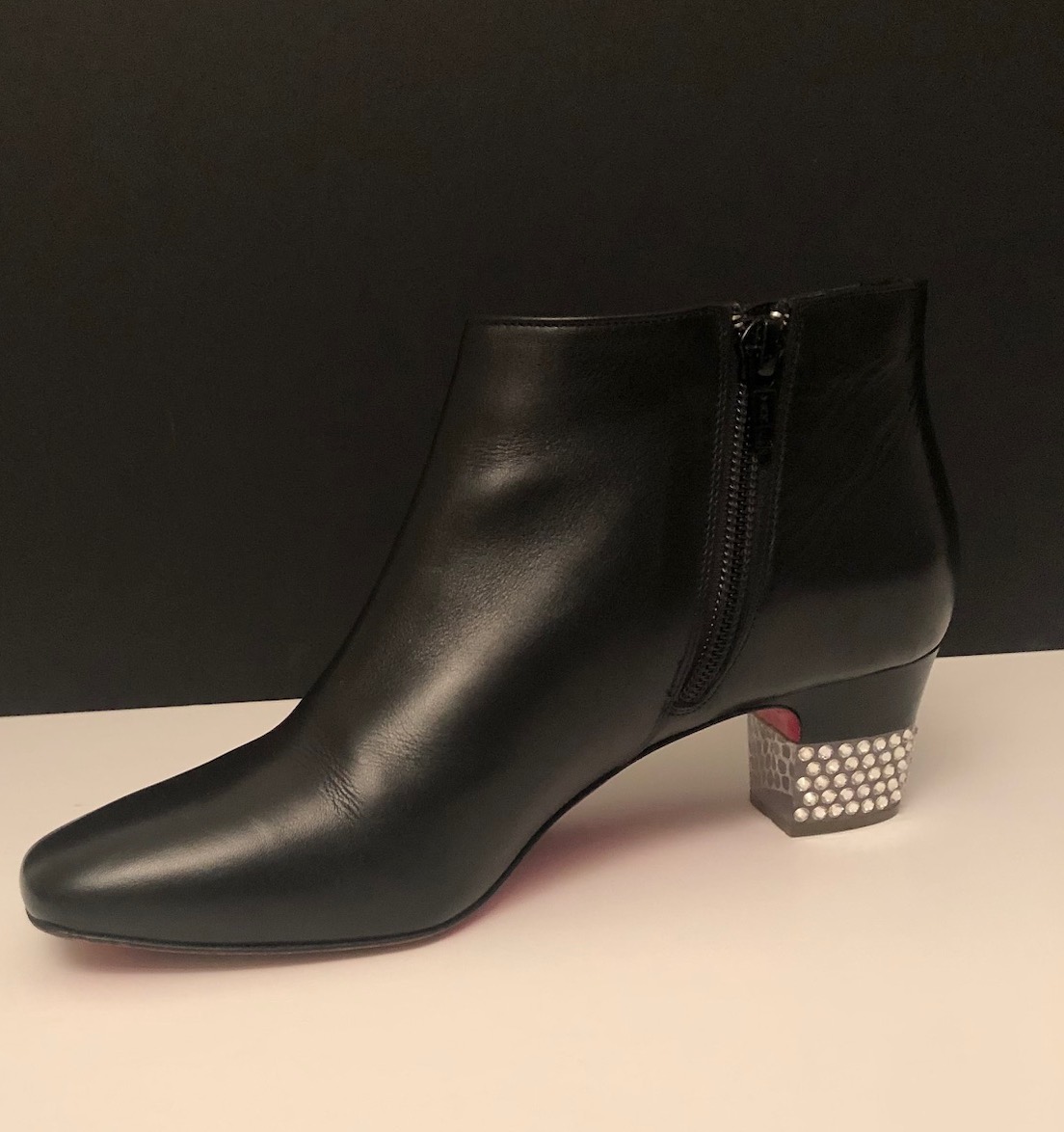 Christian Louboutin, timeless leather ankle boots in black with square crystals heels with Signature red sole. In very good condition 4.7 cm heel. Elegant and very comfortable to wear all day long.