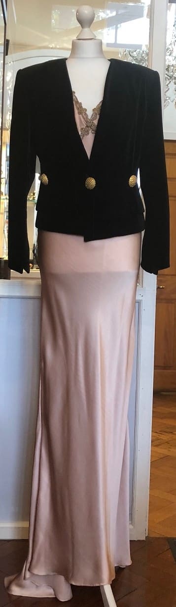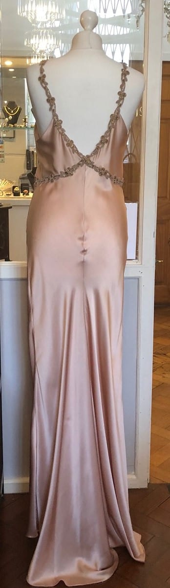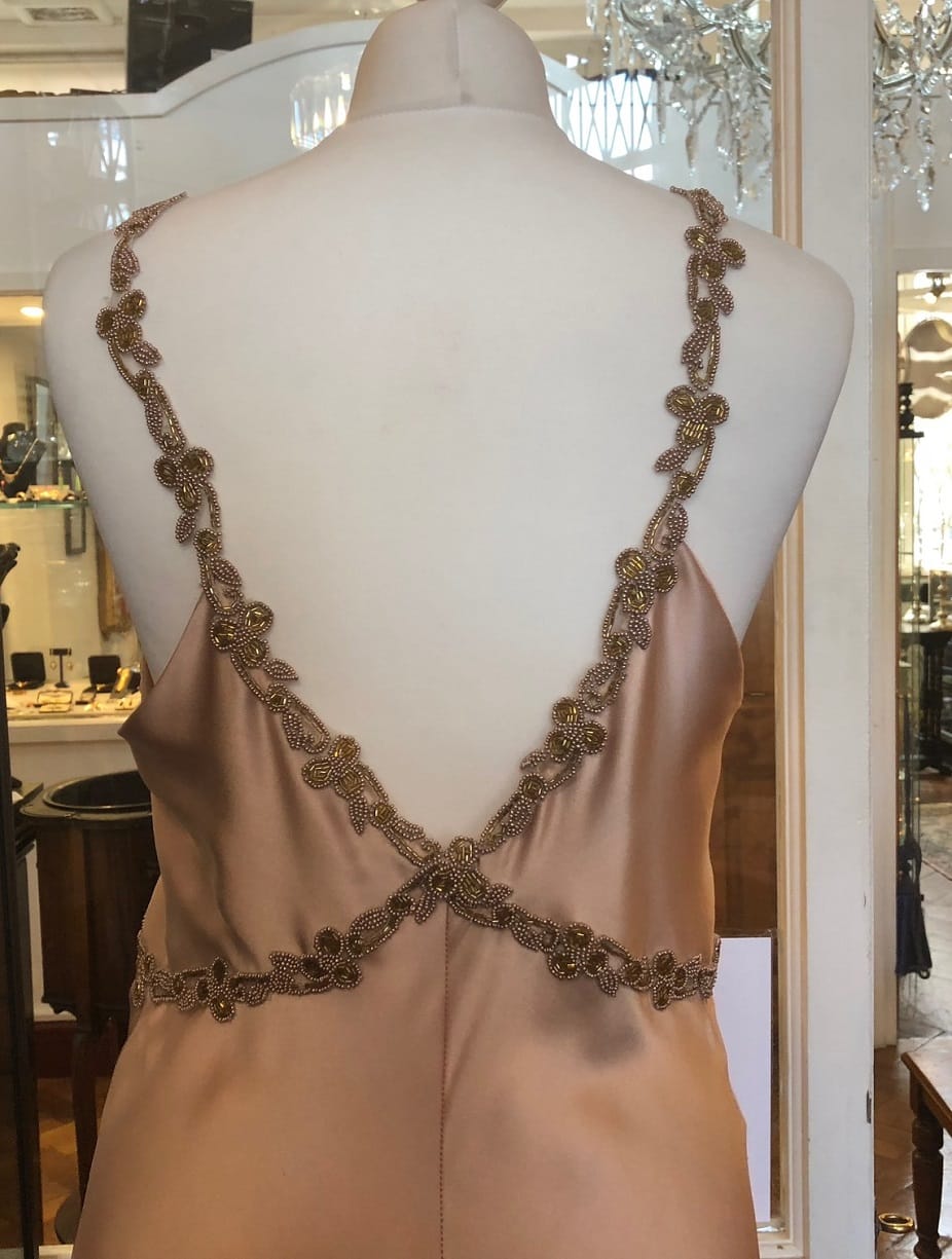 A stunning, elegant long slip evening dress, deep embroidered v-neck in front with beads, stretchy fabric, a beautiful shape and a superb fallout behind. This dress is custom made from couture vintage fabric and lace. A wonderful fallout in the bottom. Designed, cut and sew in UK, it is a beautiful piece.