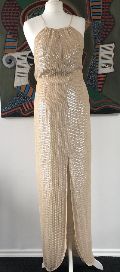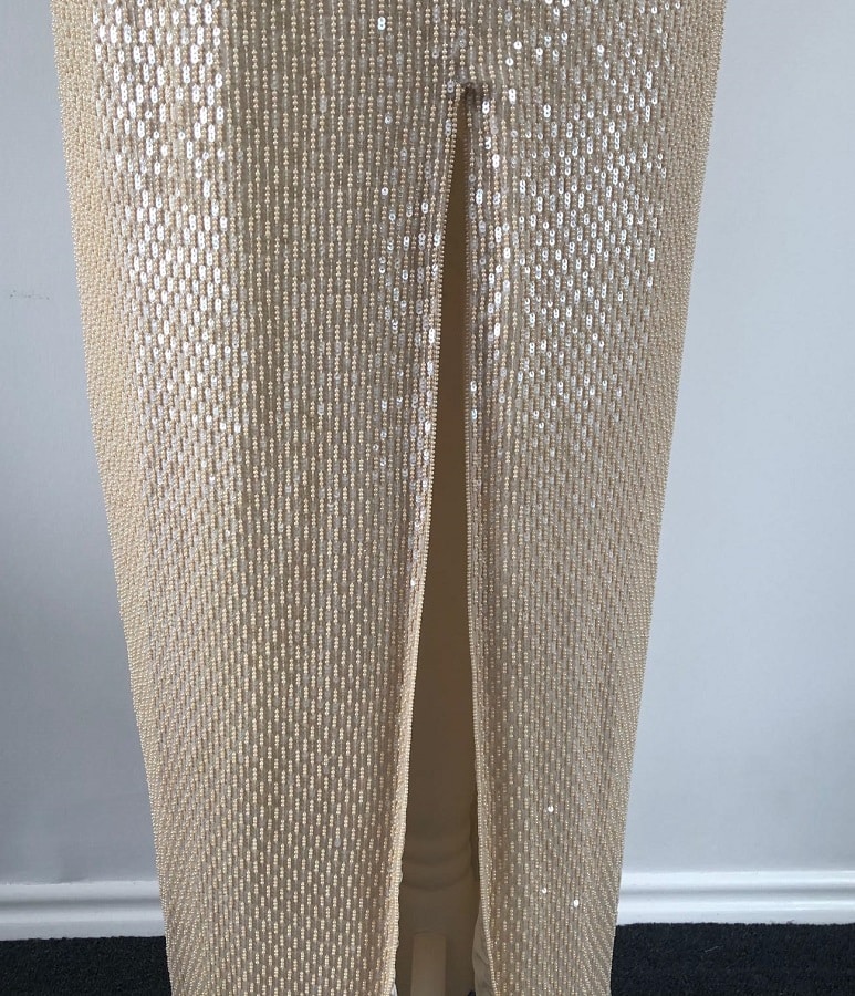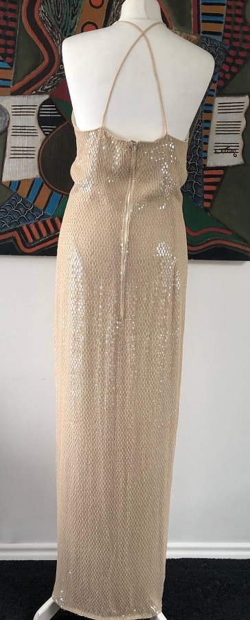 A glamour striking couture evening vintage gown from Escada. Long cream-beige elegant beautifully shining sleeveless dress with sequins, thin shoulder straps on the front that cross in the back for a glamorous look. The depth of the front can be adjusted by the shoulder straps to adjust higher or lower for a deeper cleavage. There is a long open slit in the front with lower rounded hedges. The dress closes with a rear zip and is fully lined with silk. Perfect for a cocktail, wedding or parties.