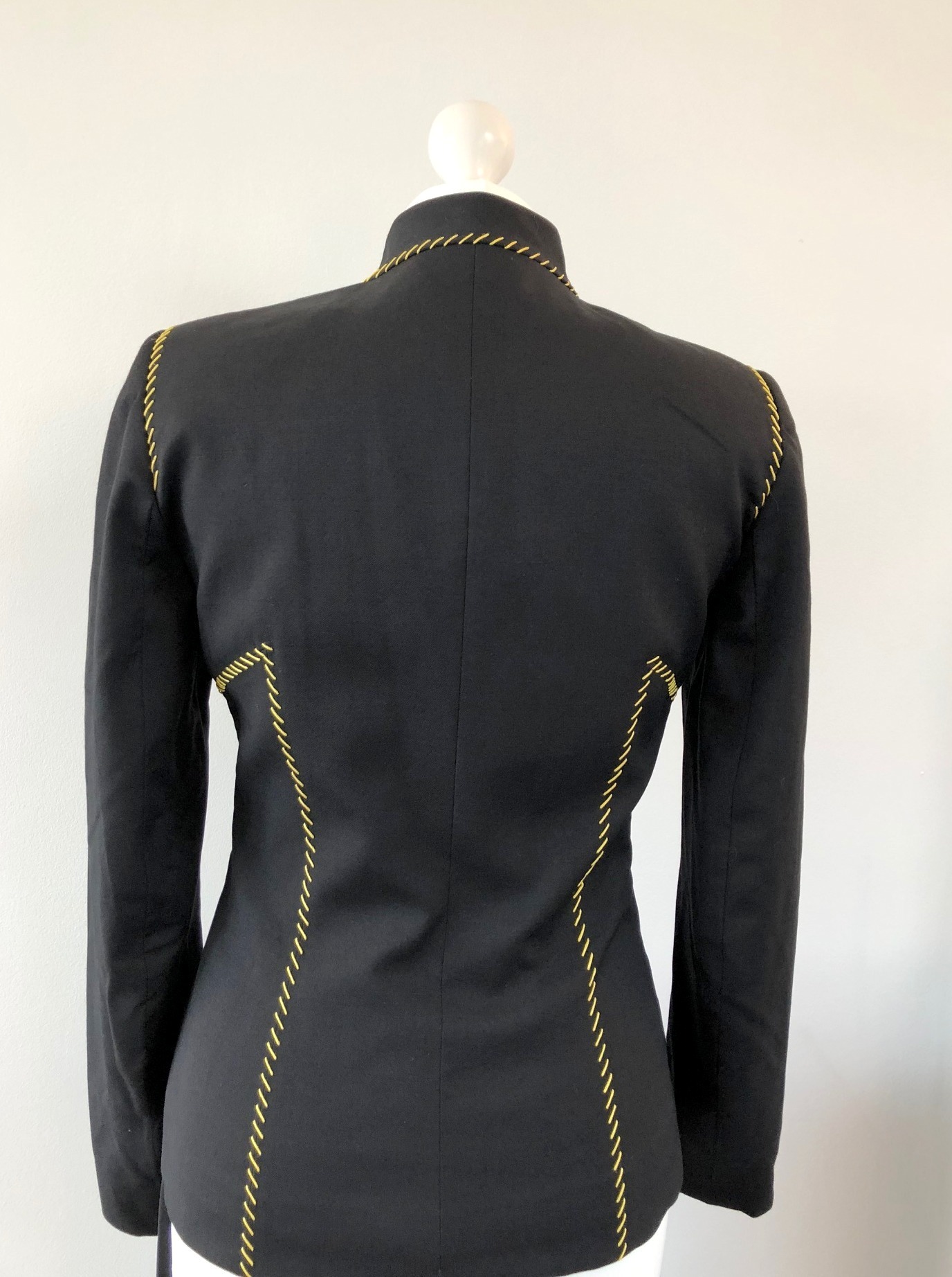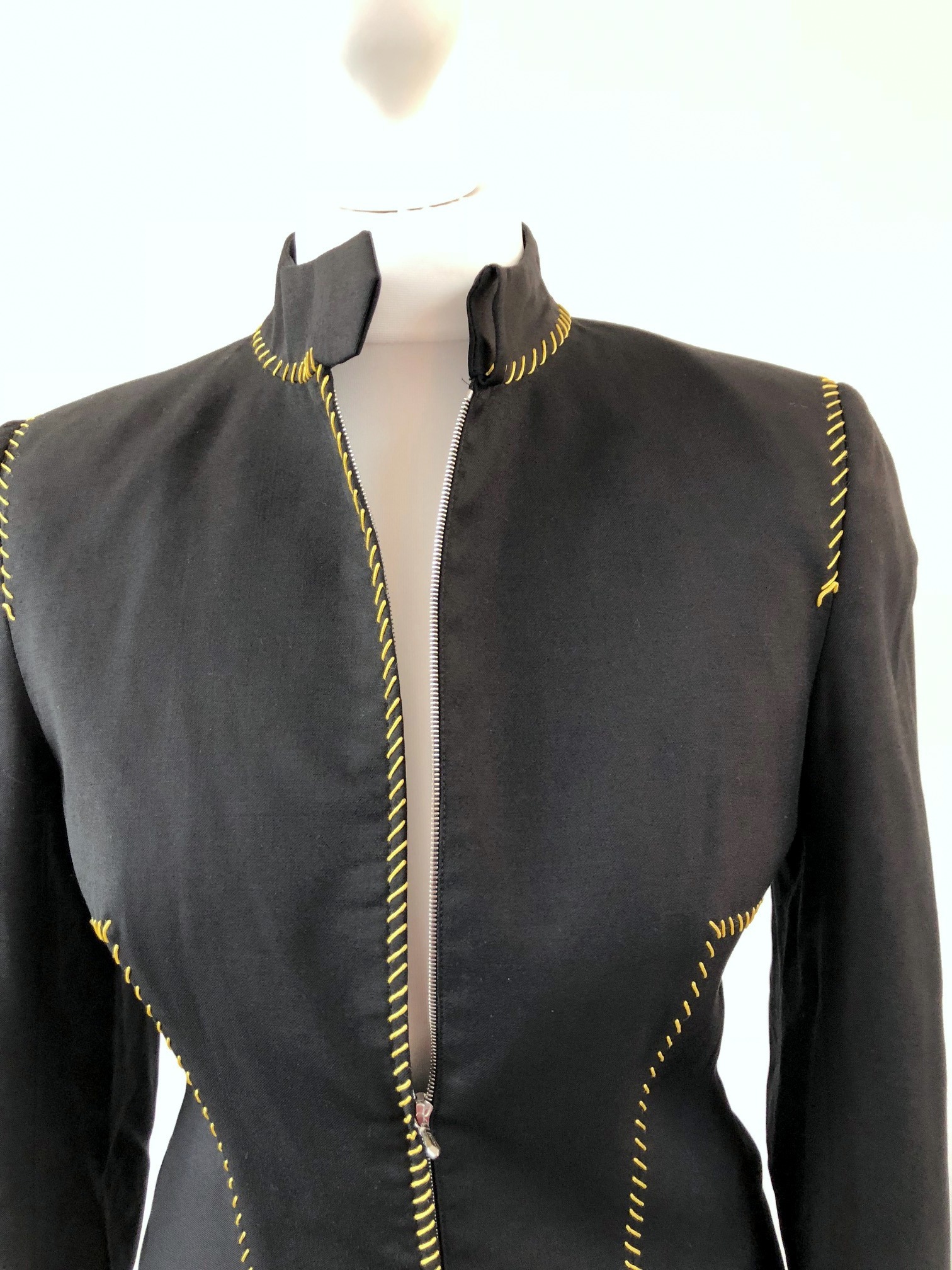 Givenchy Couture Paris, made in France, a beautiful and rare vintage piece, avenger style, black and yellow thread cotton stitching jacket and trouser suits. Fitted jacket with high collar, yellow thread cotton stitching in front and behind. High waist pants with matching fitted belt, zip in front, yellow thread cotton stitching behind.