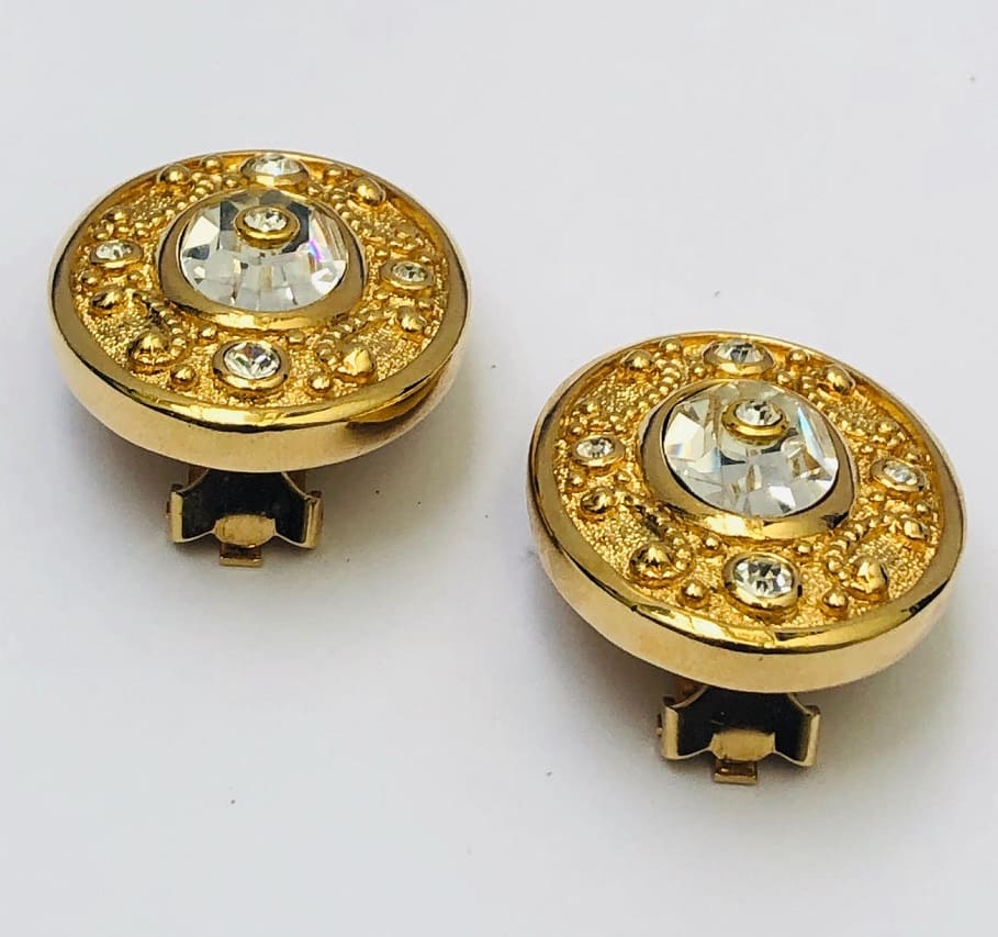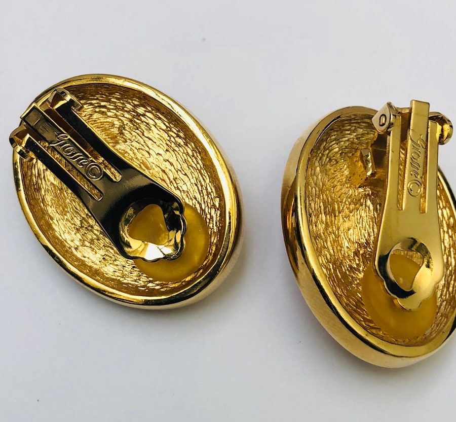 A lovely pair of vintage 1980s oval clip-on earrings from Grossé Germany. A perfect oval size, gold tone set with various sizes of crystal and motif with a large central cut style diamond in Swarovski crystal. These earrings are like new, never worn. In the 1950s Christian Dior was so impressed by the quality of Grossé work that in 1955 Christian Dior decided to use Grossé workshop-atelier in Germany to produce their jewellery. Since the 1950s Up until over the next 50 years Grossé was responsible for the production of Christian Dior Bijoux and had the right to sell them and sent out numerous masterpieces all over the world. Even in the history of Dior, such a long term license cooperation was unprecedented…