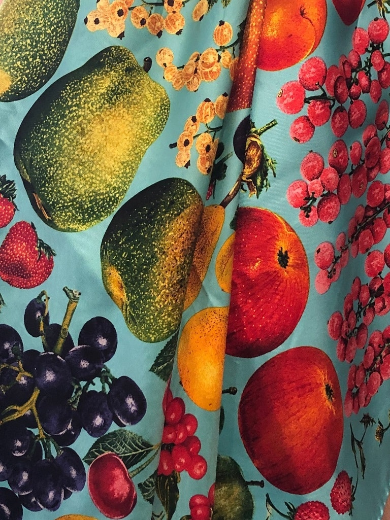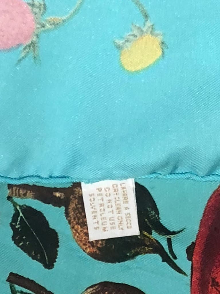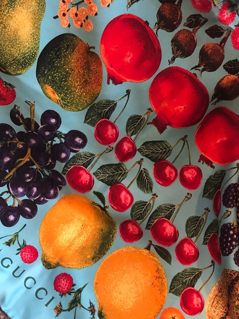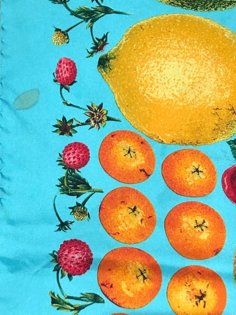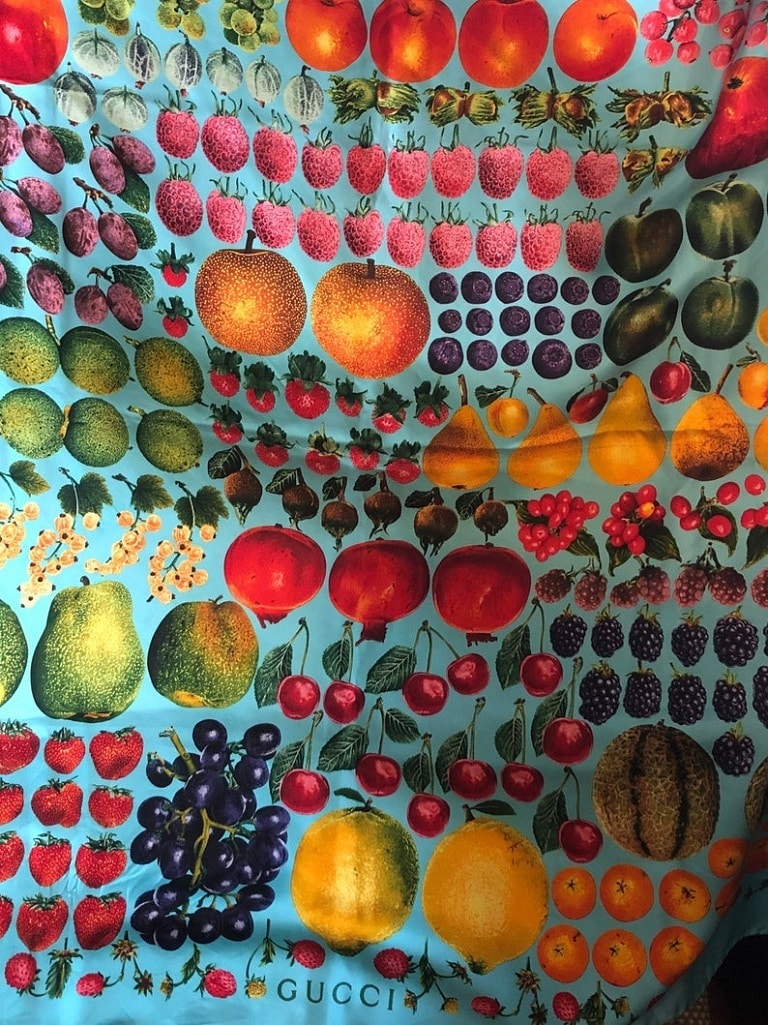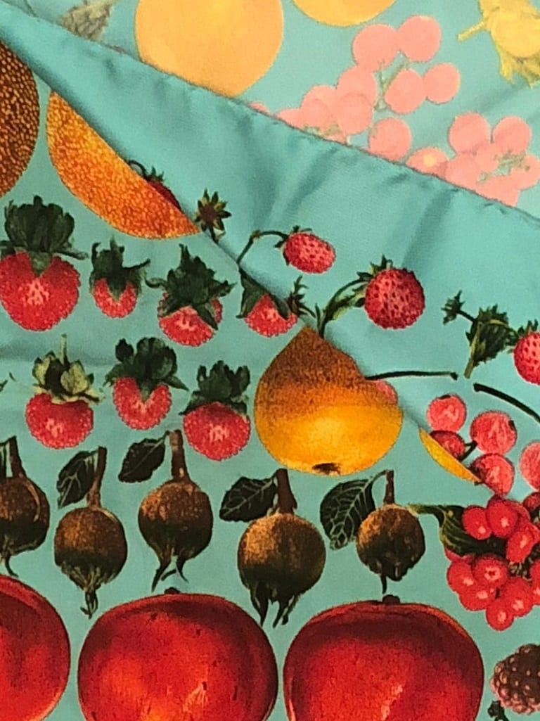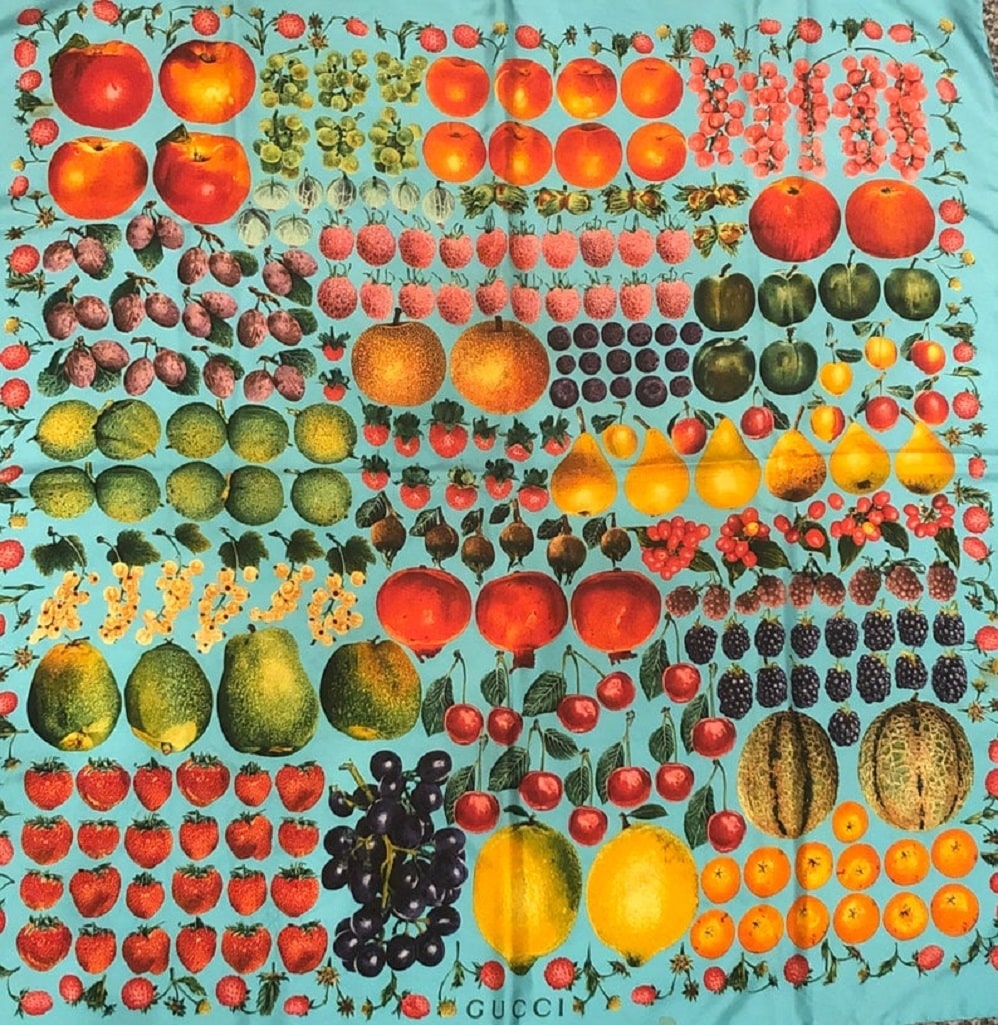 Very rare, stunning Gucci vintage blue vibrant and colorful fruits theme scarf. Light blue background with a selection of colourful fruits, gooseberries, melons, pomegranate, pears, cherries, blueberries, raspberries, strawberries etc…A collectible piece, ‘Must-have’.