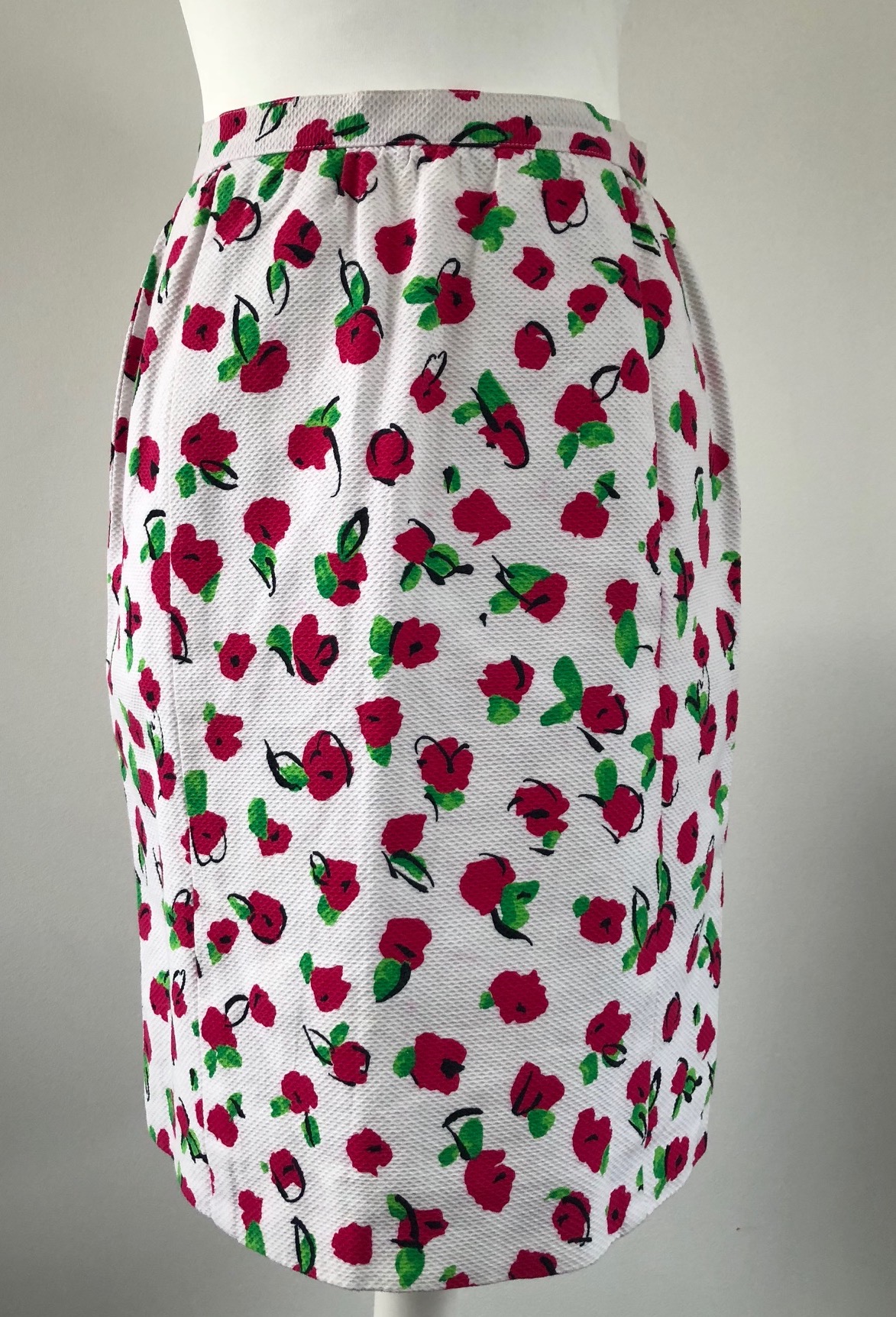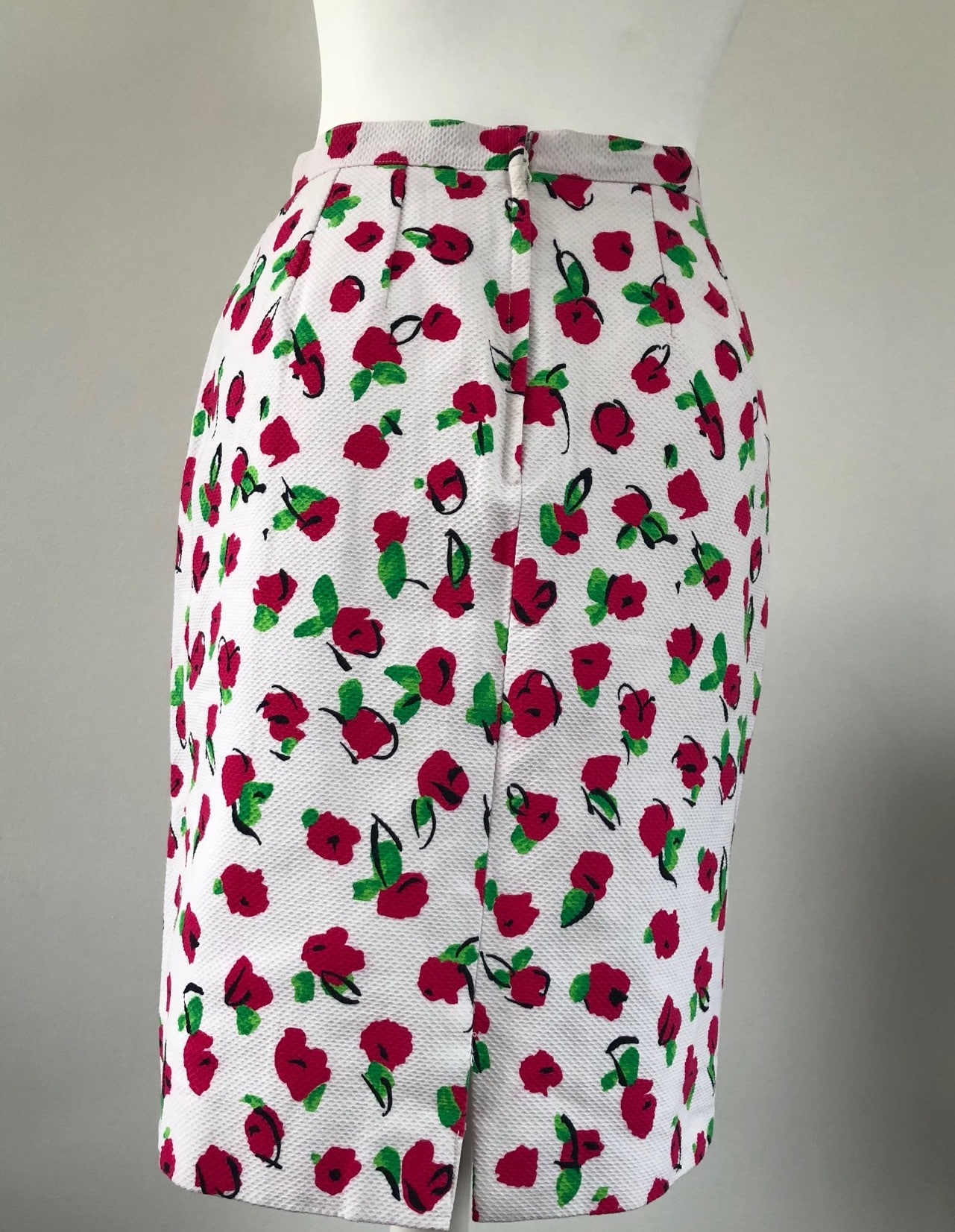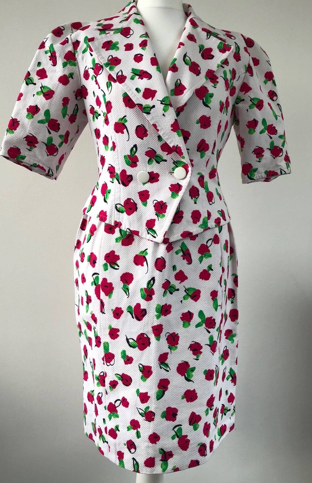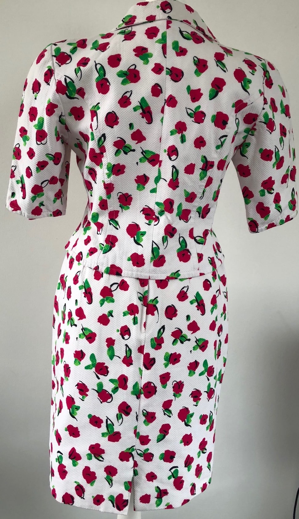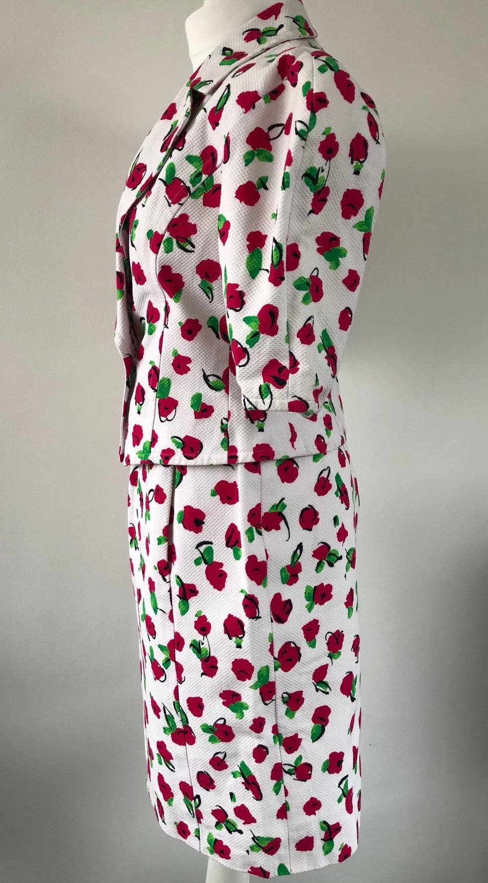 A beautiful and chic vintage skirt suit by Guy Laroche. White and red flowery quilted cropped geometric jacket and a fitted skirt. A very fresh and elegant classic vintage look for any occasion. Beautiful workmanship and stitching, so Frenchy! Closes with two beautiful white buttons in front and a zip behind. Amazing fabric, feel and touch, 100% cotton fabric, the jacket and skirt are fully lined, it is a small 40 (will suit a 38). The HERMES Vintage Clutch Black RIO and the PIERRE CARDIN Leather Heels Sandals Gold Lily in the photos are available for sale under HANDBAGS and SHOES.
