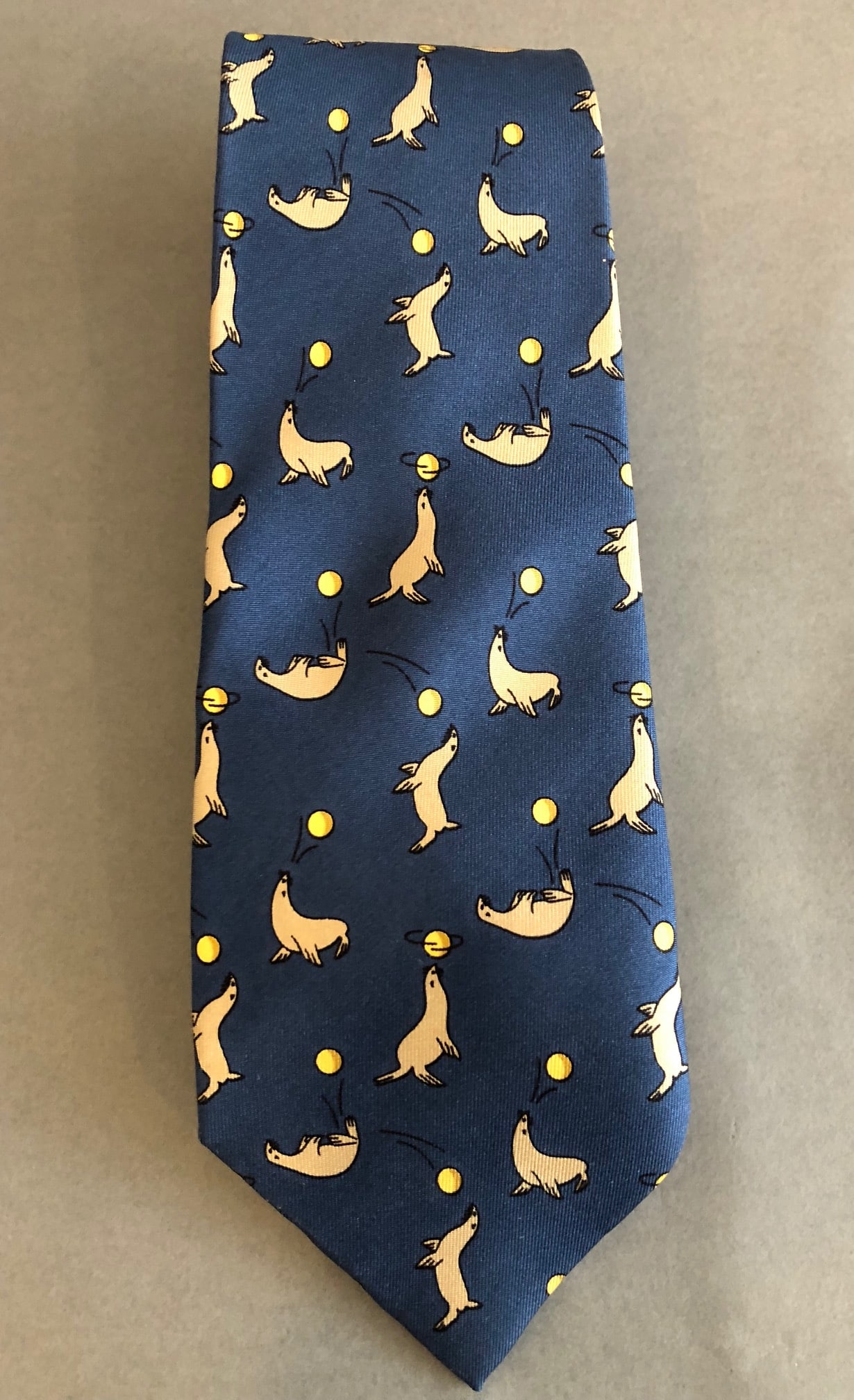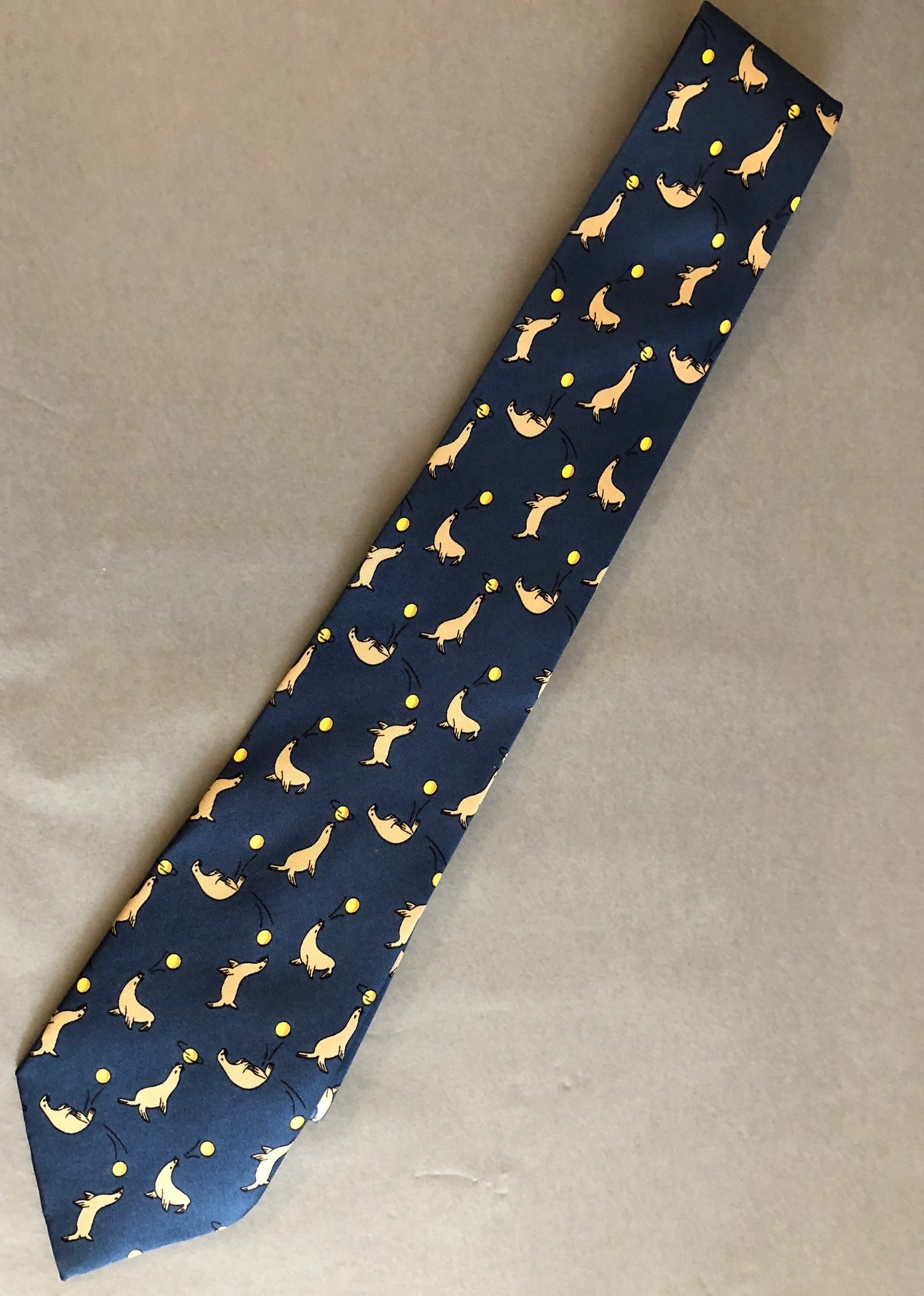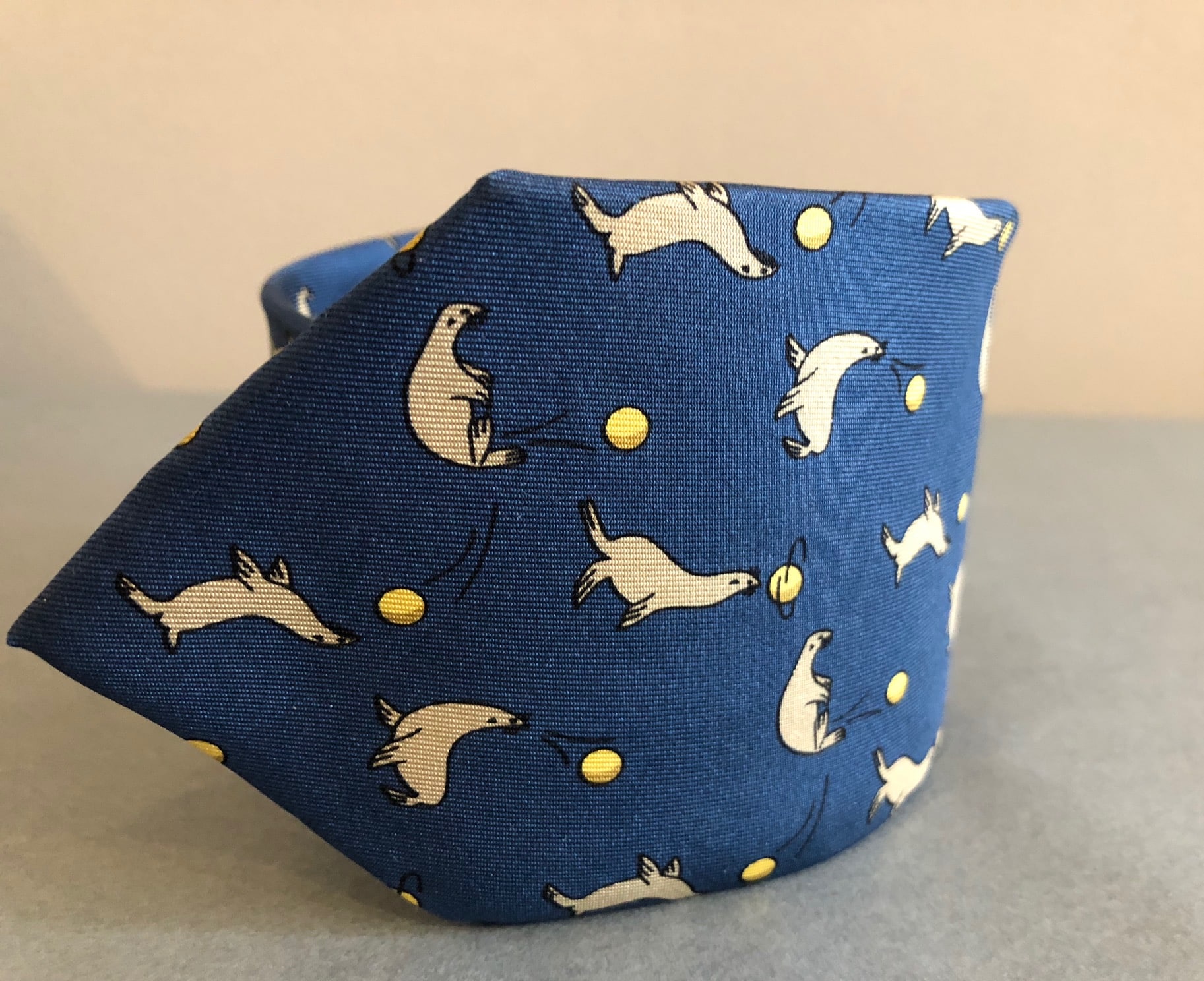 This stunning Hermès tie is 100% in silk material in a blue colour tone. Designed in a slim contemporary style, graphic print throughout body. Detailed with sea lions and balls in light brown and yellow tones.