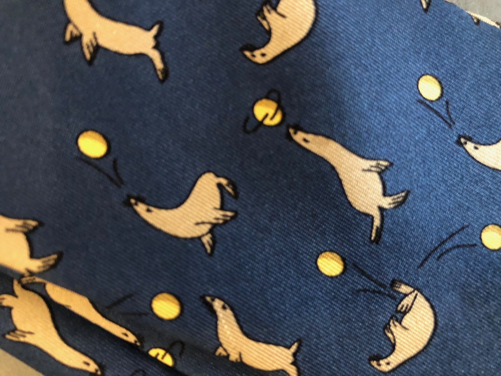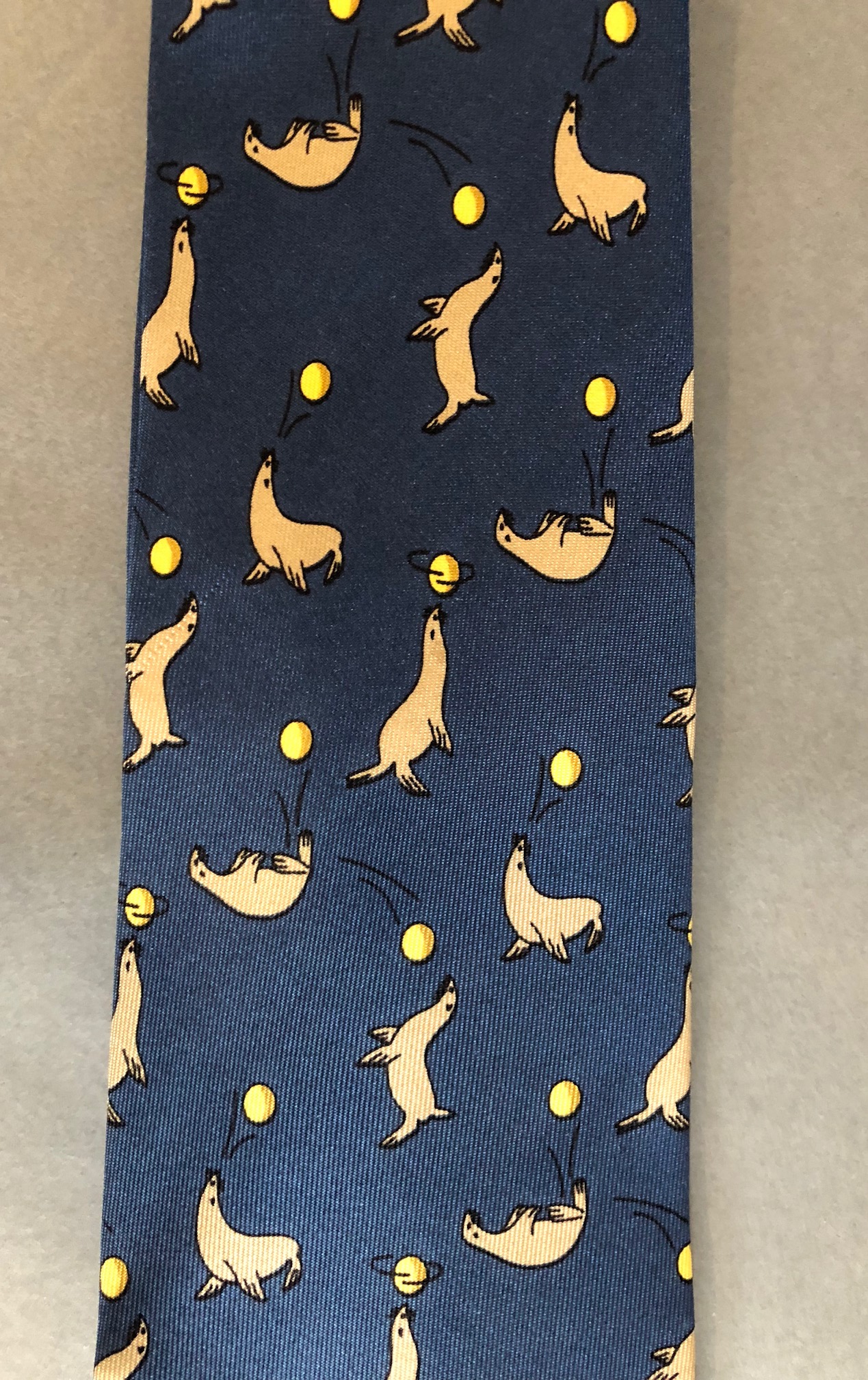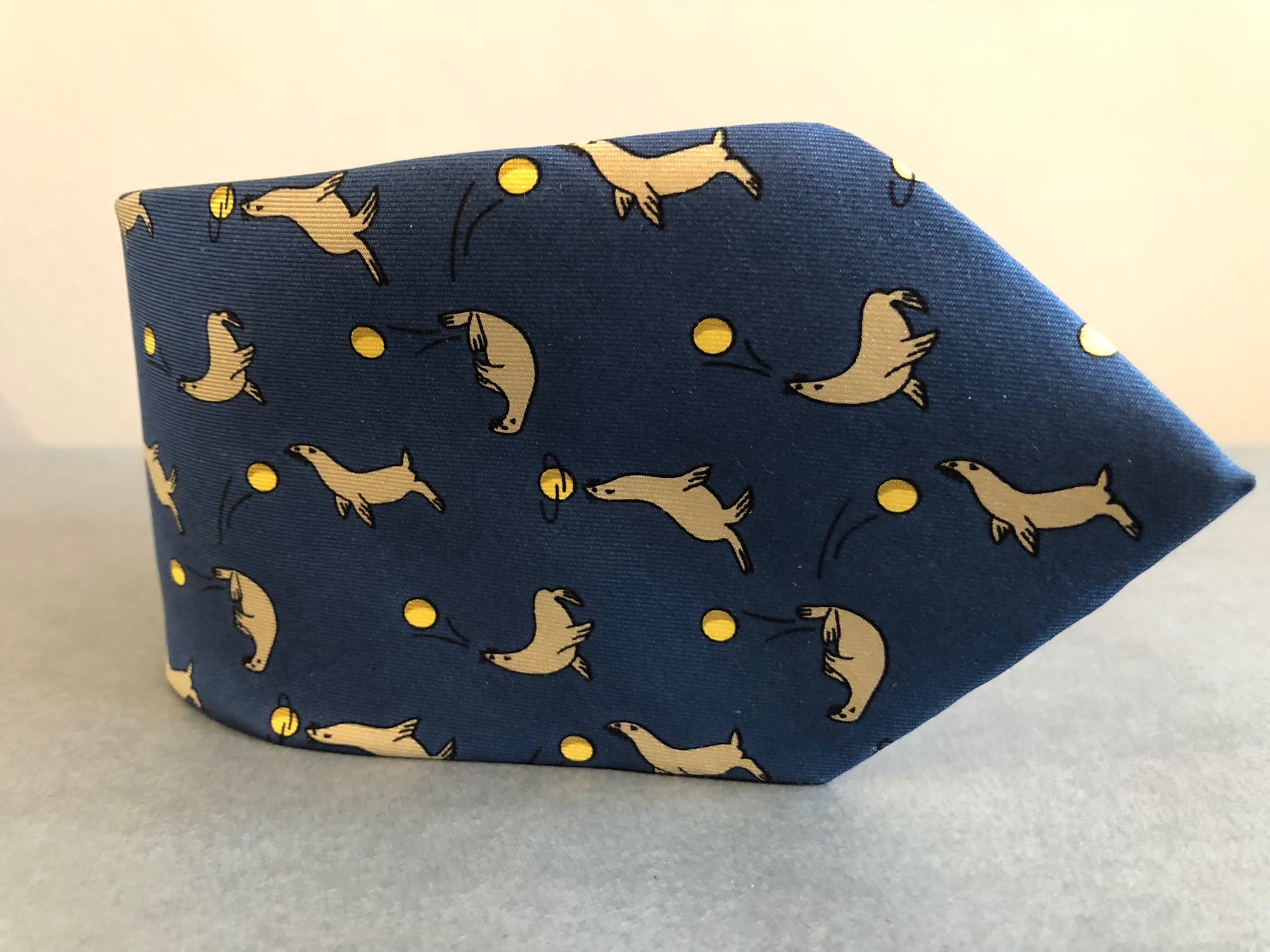 This stunning Hermès tie is 100% in silk material in a blue colour tone. Designed in a slim contemporary style, graphic print throughout body. Detailed with sea lions and balls in light brown and yellow tones.