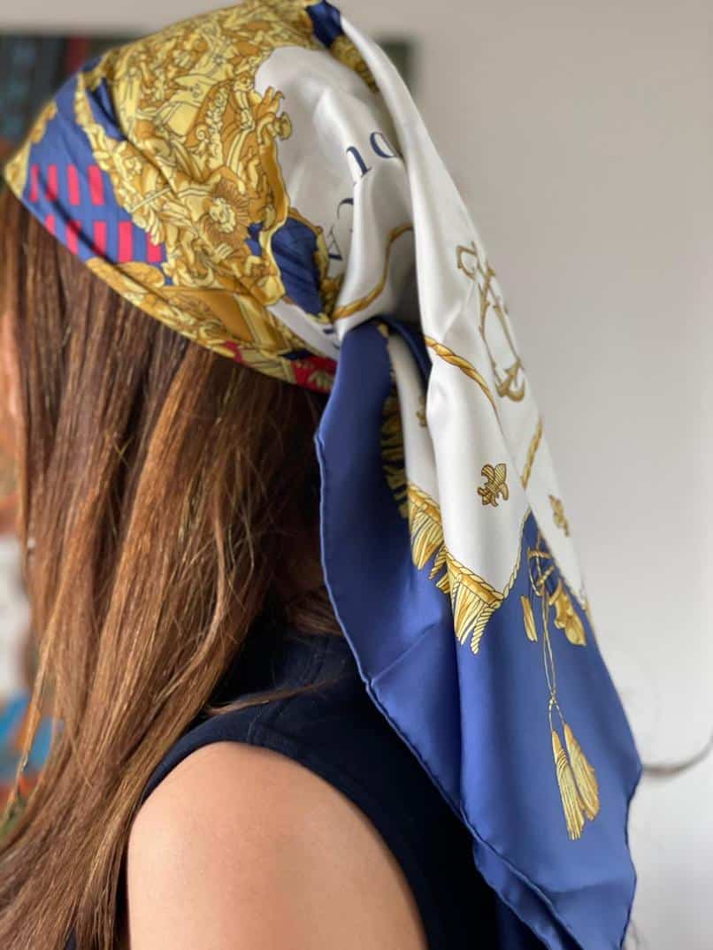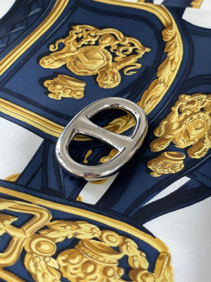 An iconic Hermès vintage Hermès scarf ring, chaine d’ancre design in silver and palladium plated.This essential Hermès accessory complements any outfit. It can be worn in many ways as per photos – around your neck , or at your waist ! Styled in the photos with a Hermès Grand Apparat, Réale la Galère and Brides de Gala Navy Blue scarves.