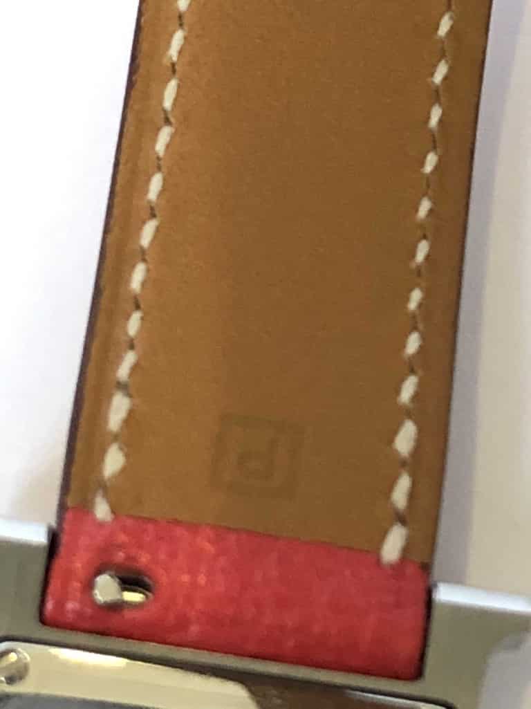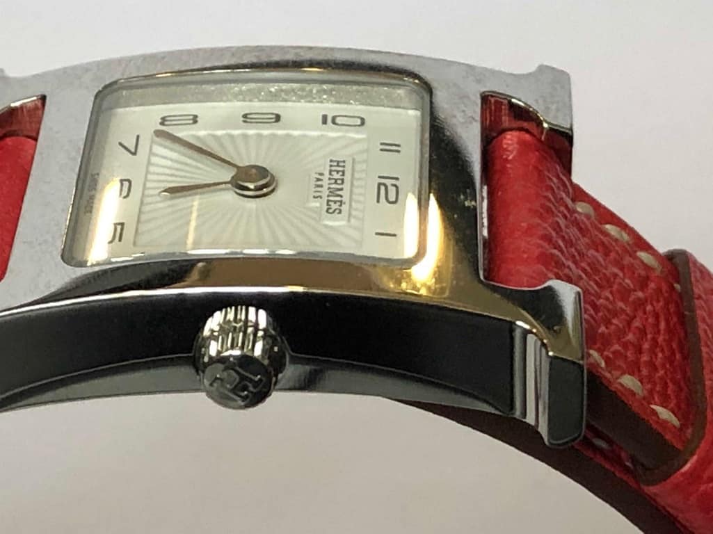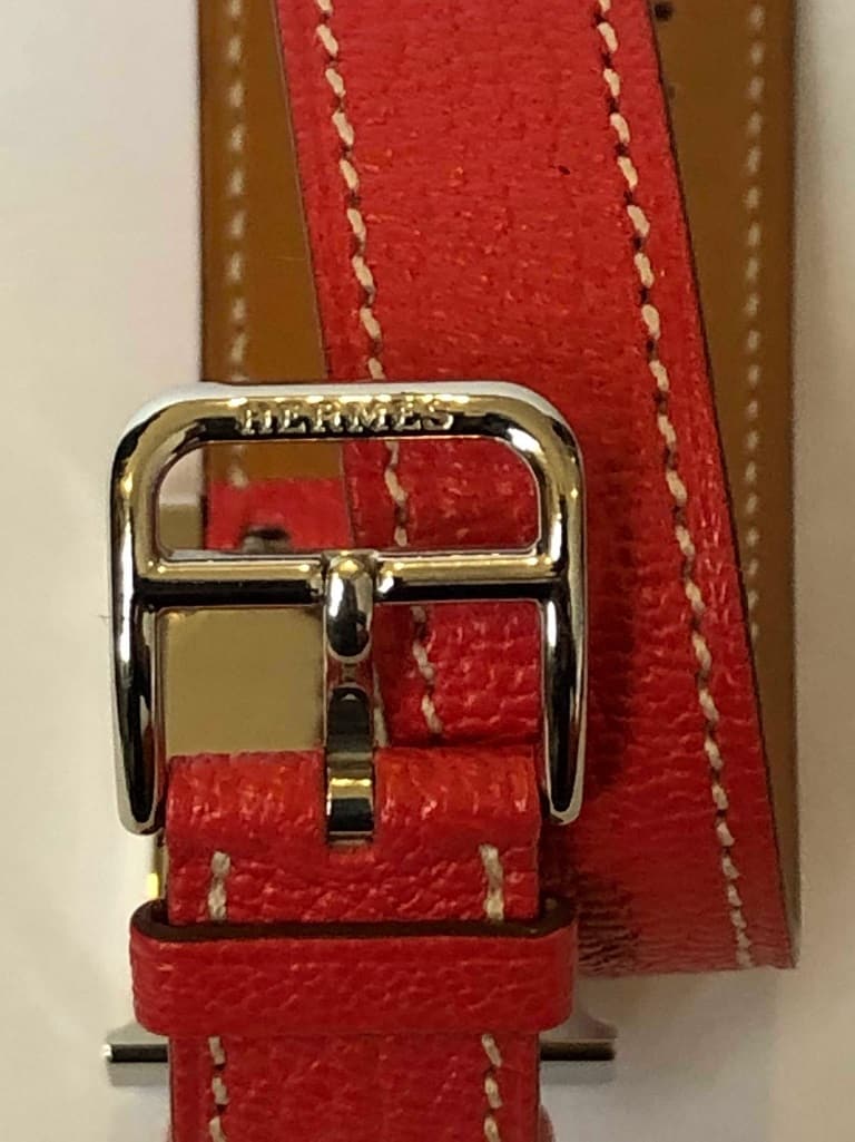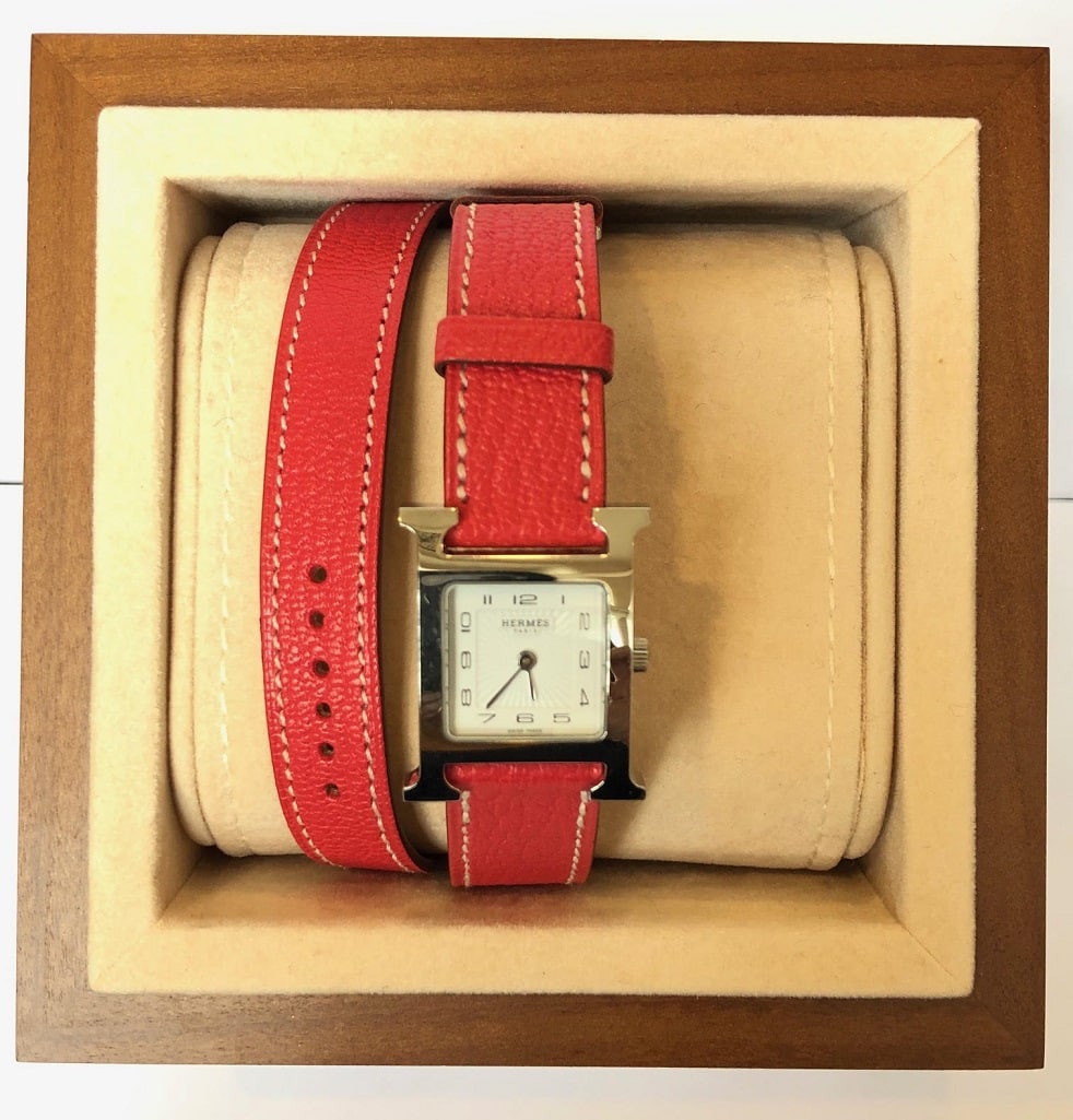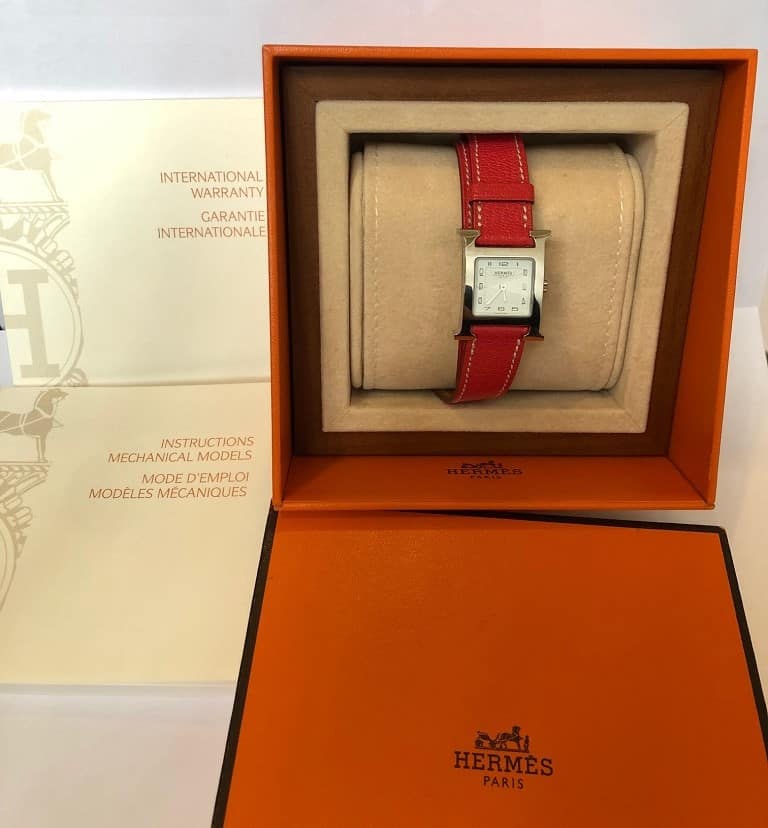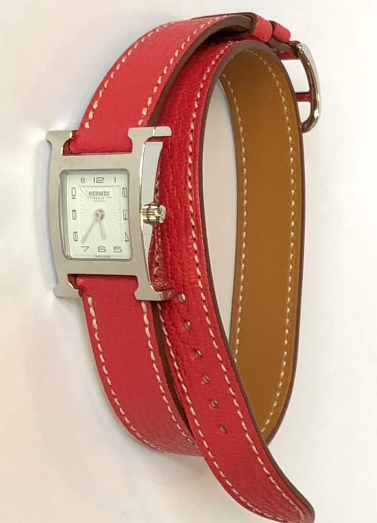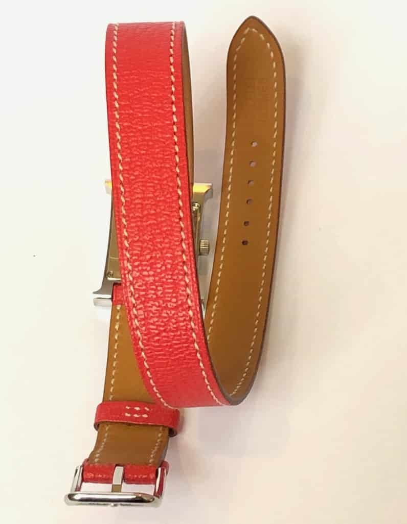 in brown, red a very elegant Hermès stainless steel watch, long double wrap red smooth calfskin leather bracelet interchangeable strap system. Anti-reflective sapphire crystal case, white and sun pattern dial with hours and minutes hands. Swiss quartz mechanical self-winding movements, water resistance: 3 ATM/ 30m and tongue buckle closure.