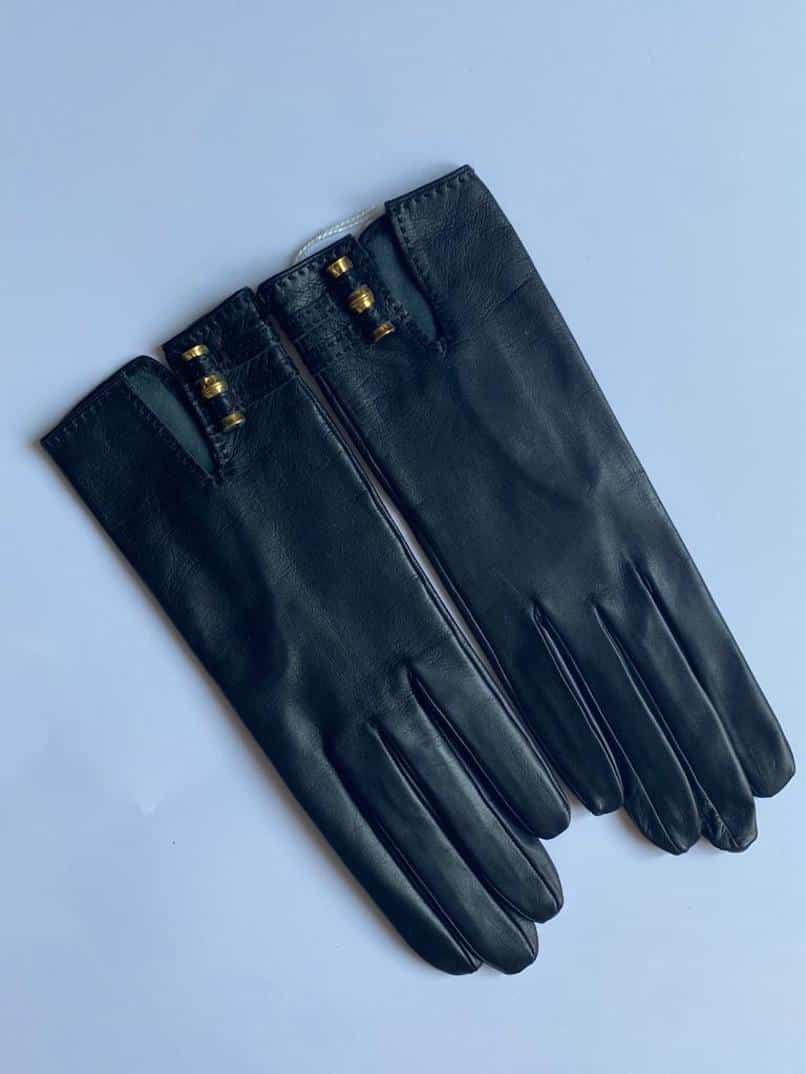 An elegant pair of vintage Hermès gloves 24 Fbg St Honoré. Handcrafted in leather lambskin with gold tone detailed wrist. Lining in silk, it is a very small size.