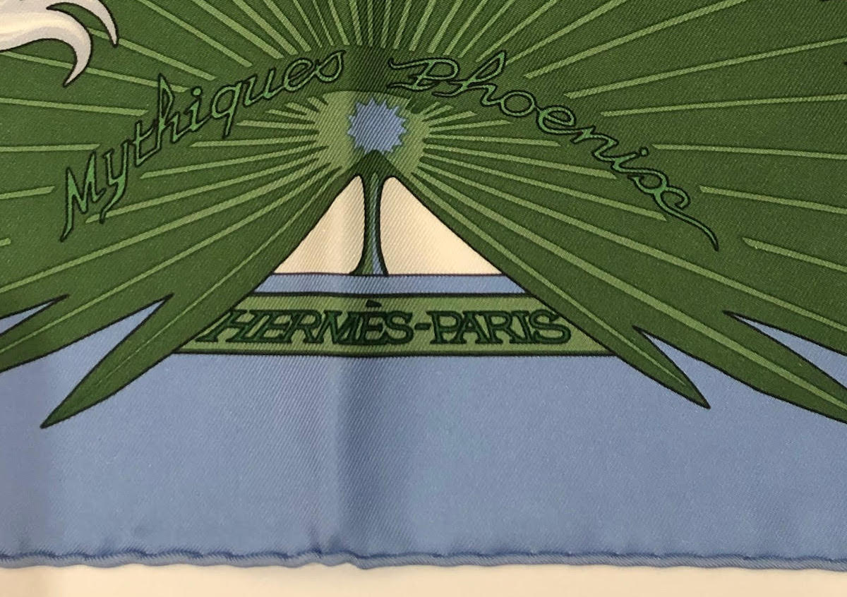 A stunning mythical Hermès scarf Mythiques Phoenix in pristine condition, unworn w/box. A collector, ‘Must-Have’! Superb colour tone of Blue/Green/Cream/Gray/Black, off-white background, pale blue edges-border. This scarf was designed By Laurence ‘Toutsy’ Bourthoumieux in 2014. Mythiques Phoenix Symbol – Hermès ‘Histoires de carrés’: In the blazing magnificence of its plumage the phoenix triumphant rises from the ashes this mythical, startlingly beautiful birds lives several hundreds of years before being consumed in a nest of branches perfumed with myrrh and incense only to be renewed in birth. The Greeks associated its name with that of the tree that sheltered the birth of Apollo, God of light. For the Ancient Greeks, it was the date palm that symbolised fertility and longevity. Myths possess the wonderful gift of enabling us to travel in time and space and his scarf, which makes itself the messenger, encircles the bird with leave and the fruit of date palms.