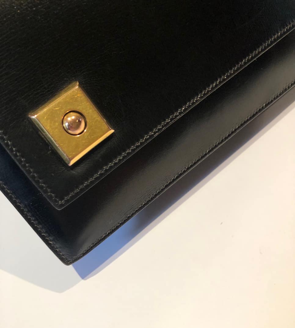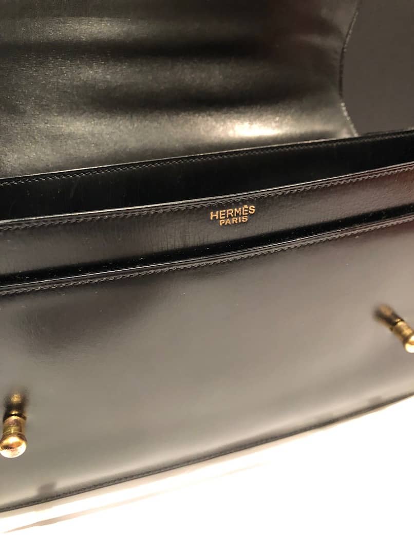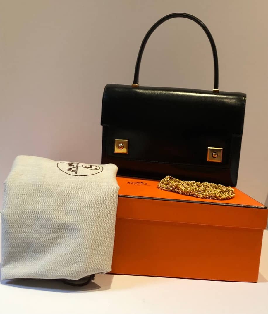 A classic Hermès vintage box leather 1968 Piano clasp handbag, in exceptional condition. This beautiful piano bag is handcrafted from black box leather with 18K gold plated hardware. It opens with two front clasp fastening push buttons called ‘Piano clasp’. It is a well structured rectangular bag with one single rounded handle and fold over flap with three compartments, one internal pocket closes with a stud button. Could be worn in different ways by attaching from inside of the bag a leather or chain strap or any scarf to create a crossbody shoulder bag. A French vintage links chain (64 cm) is offered with the bag to use it as a crossbody bag. A French vintage links chain (64 cm) is offered with the bag to use it as a crossbody bag. Styled with a HERMÈS Din Tini Yä Zuë Hermès Silk Scarf Rose Indien/Orange/Rouge H W/Box By Ezequiel Vincente Jose 2011 for sale separately under Accessories, scarves.