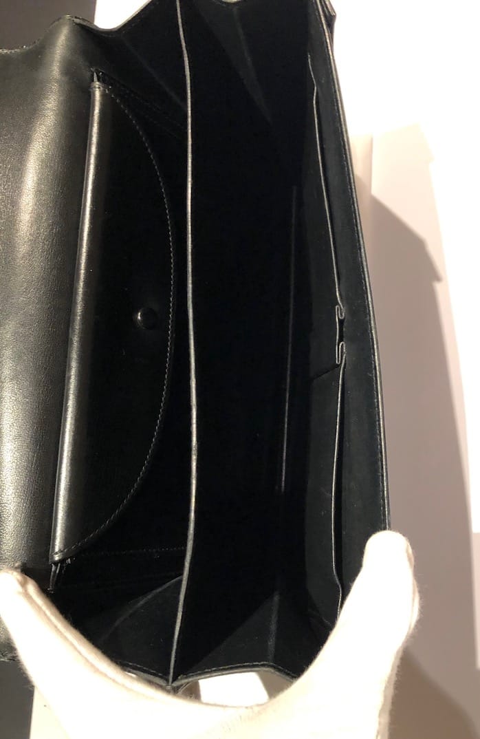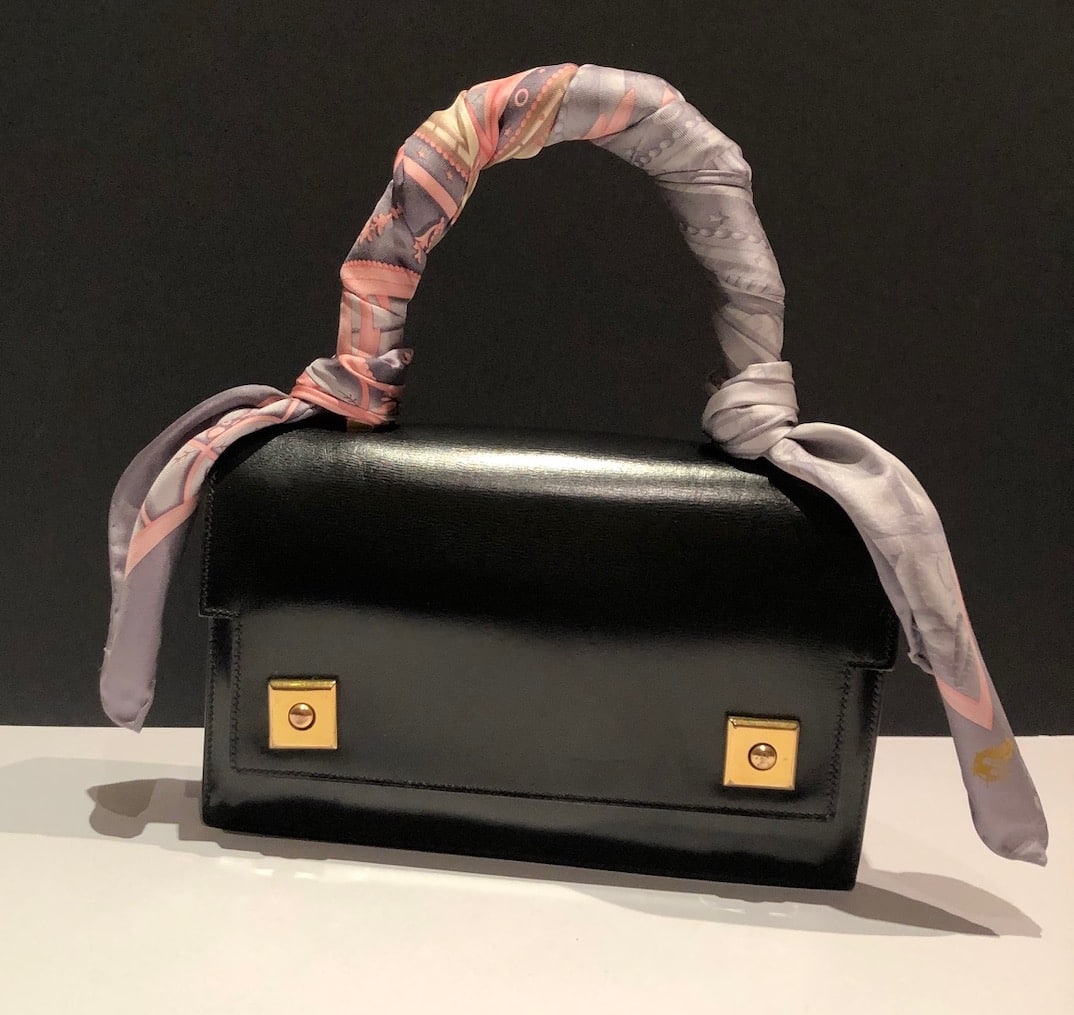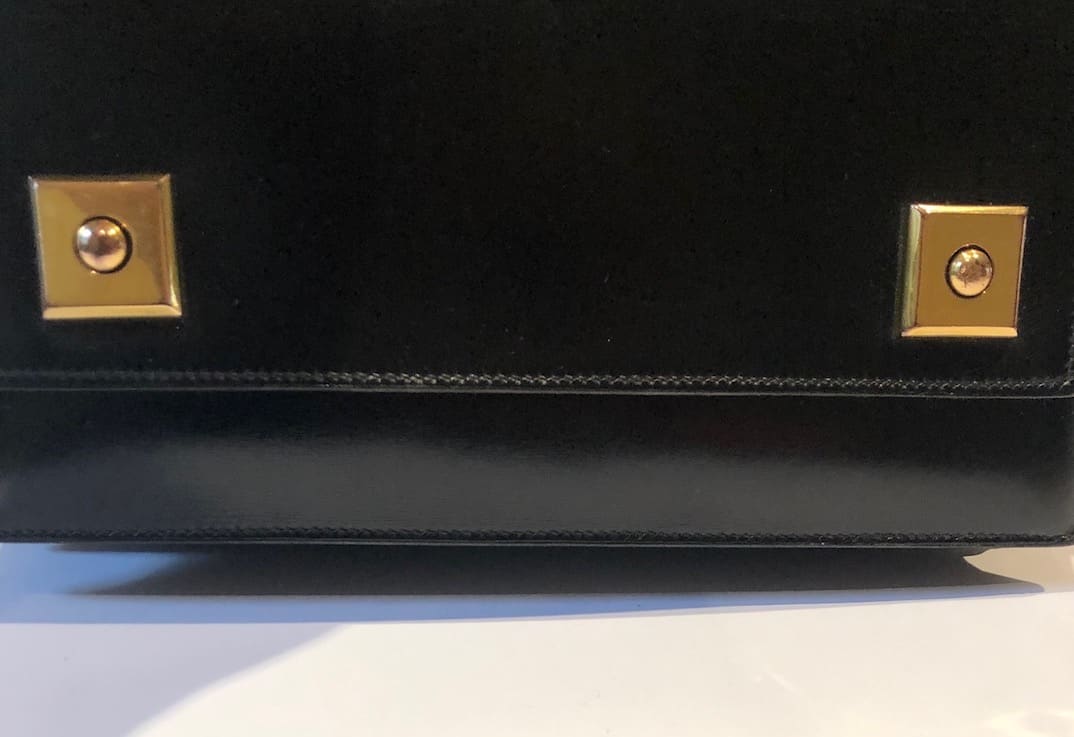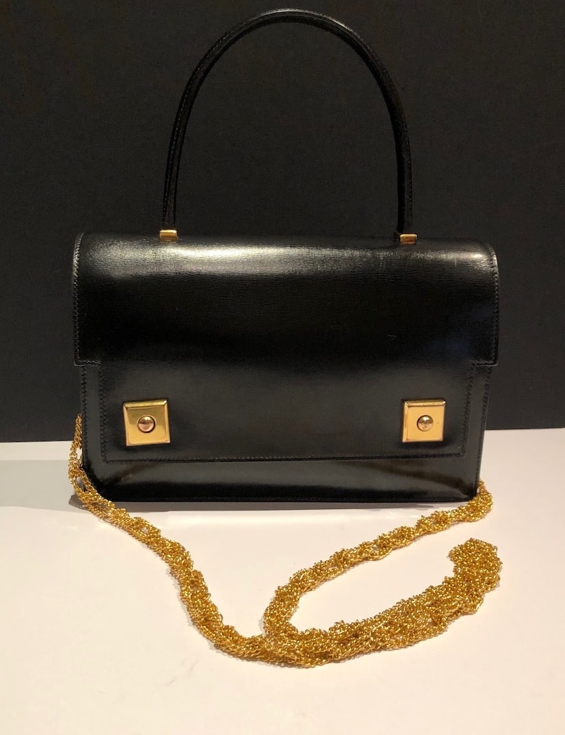 A classic Hermès vintage box leather 1968 Piano clasp handbag, in exceptional condition. This beautiful piano bag is handcrafted from black box leather with 18K gold plated hardware. It opens with two front clasp fastening push buttons called ‘Piano clasp’. It is a well structured rectangular bag with one single rounded handle and fold over flap with three compartments, one internal pocket closes with a stud button. Could be worn in different ways by attaching from inside of the bag a leather or chain strap or any scarf to create a crossbody shoulder bag. A French vintage links chain (64 cm) is offered with the bag to use it as a crossbody bag. A French vintage links chain (64 cm) is offered with the bag to use it as a crossbody bag. Styled with a HERMÈS Din Tini Yä Zuë Hermès Silk Scarf Rose Indien/Orange/Rouge H W/Box By Ezequiel Vincente Jose 2011 for sale separately under Accessories, scarves.