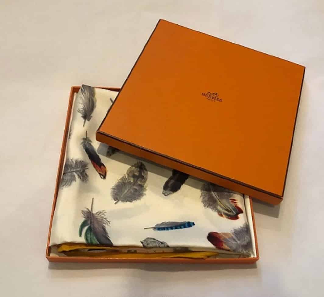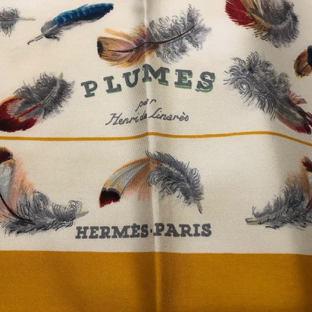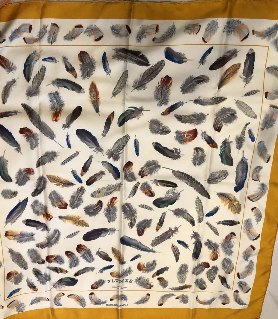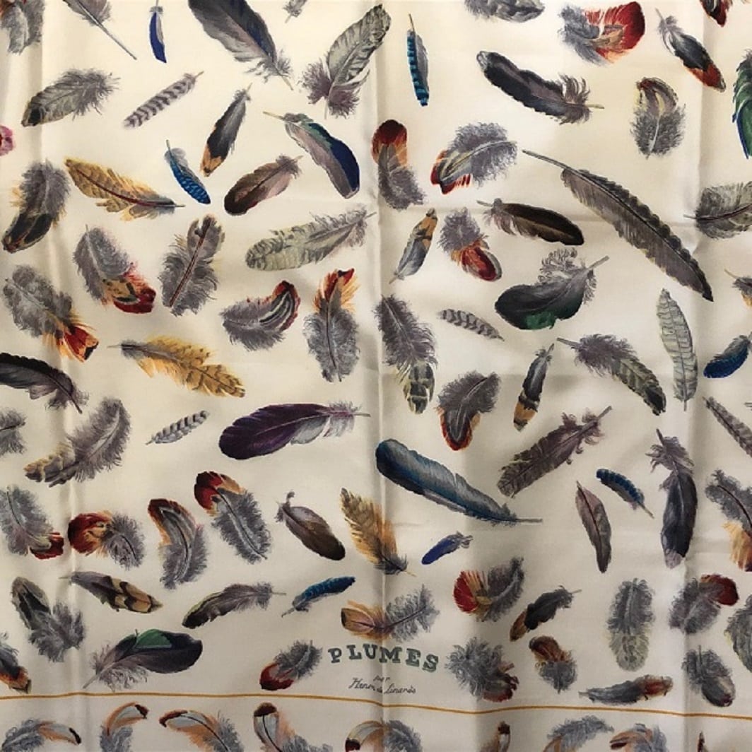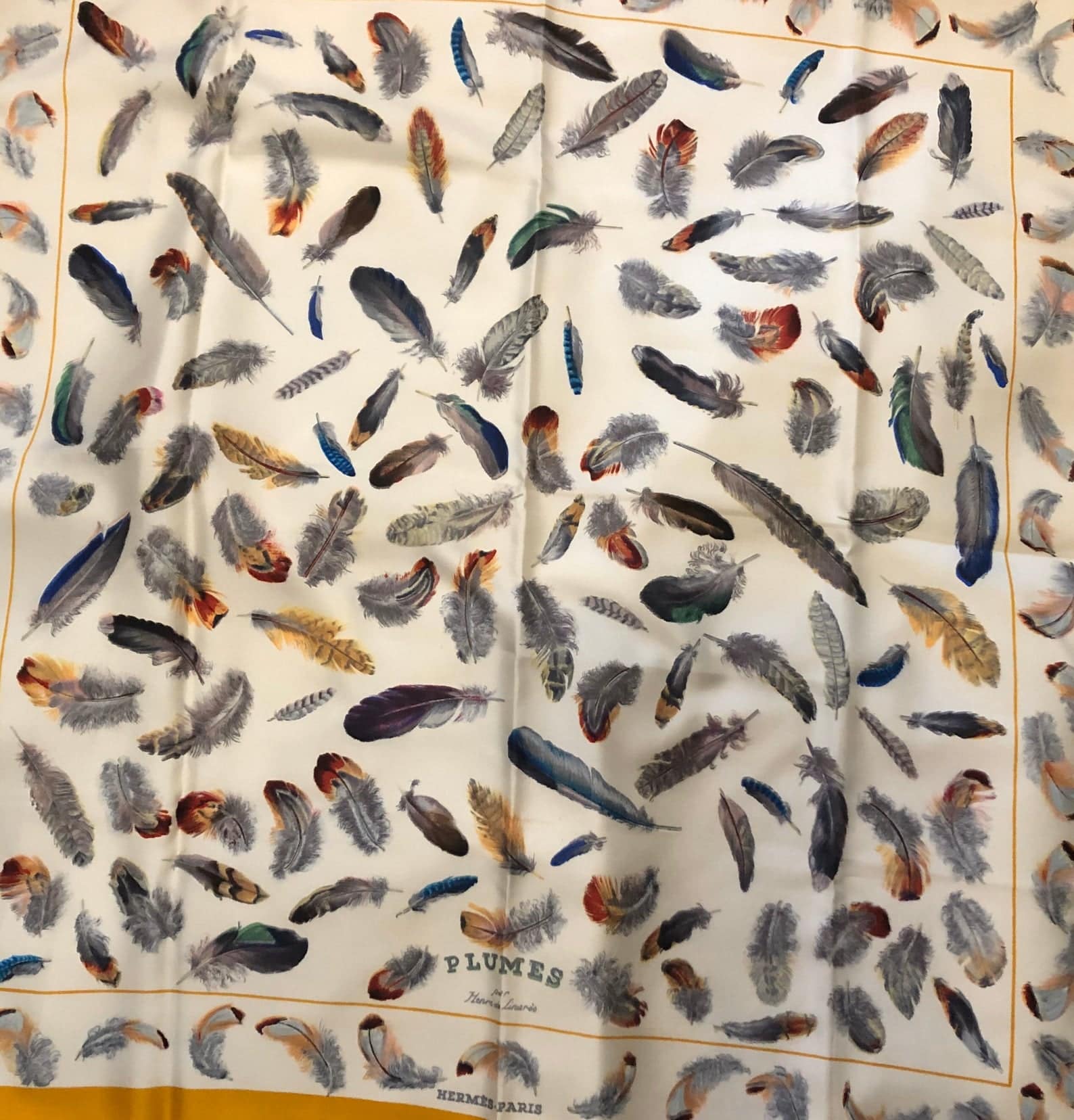 This is an amazing Plumes scarf, a 1999 issue and in excellent condition with original box. This amazing scarf was originally issued in 1953 and designed by Henri de Linarès. Beautiful colourful feathers-plumes floating on a off-white background. So chic and elegant, highly collectible piece that can be worn as intended or framed as a piece of art