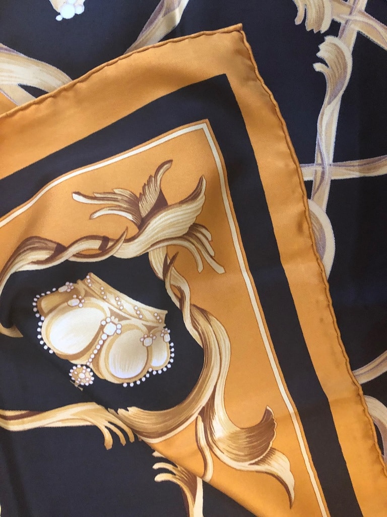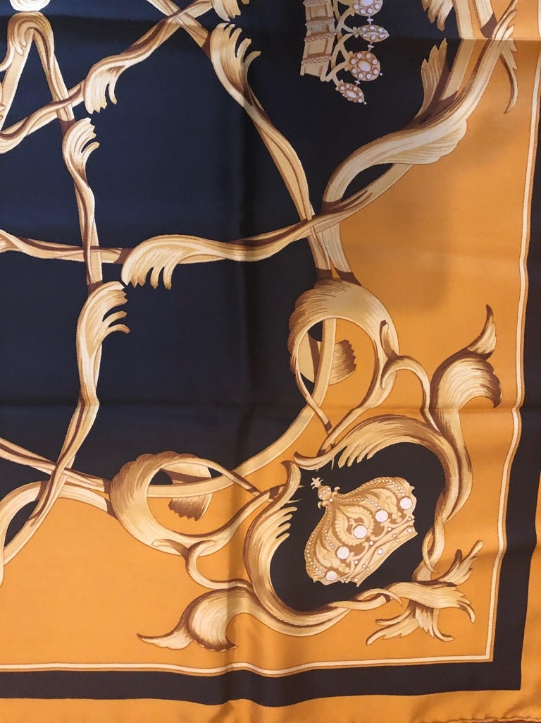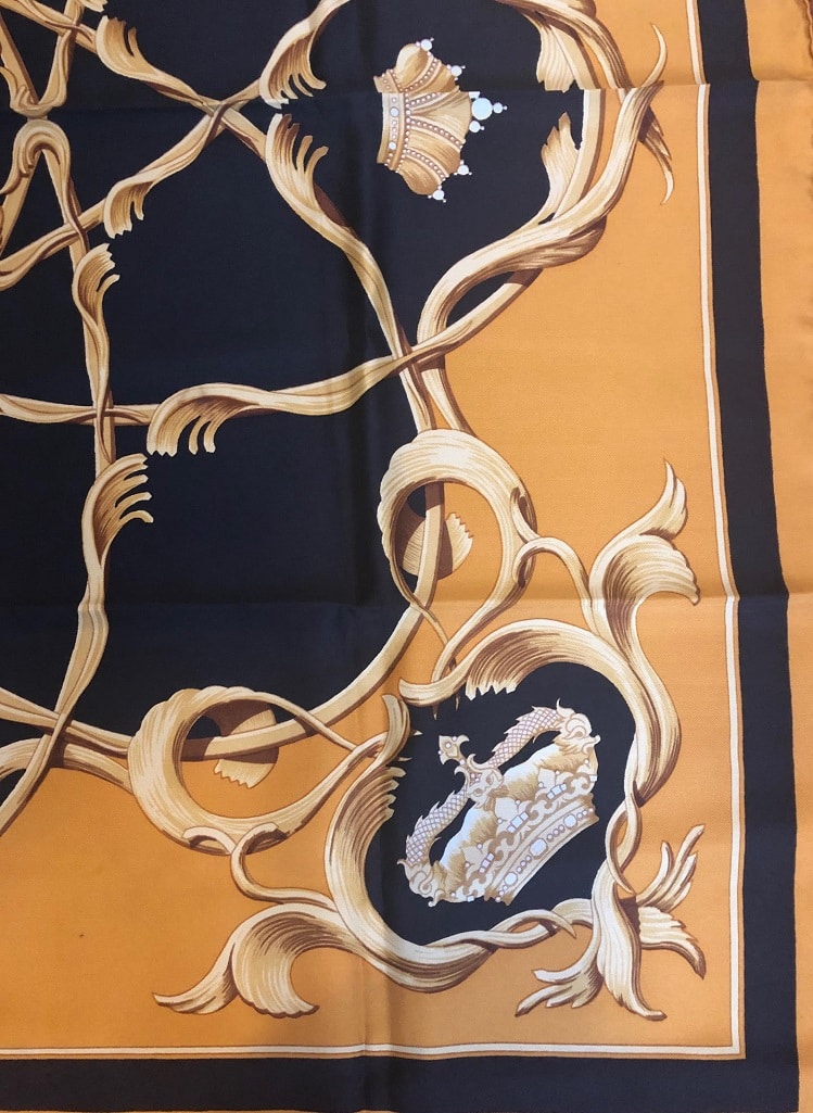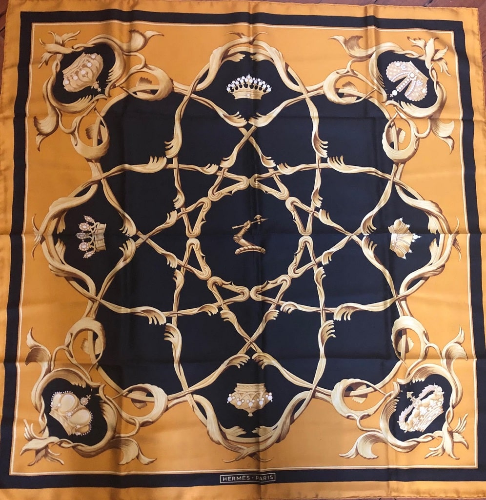 HERMES Rare Crowns Couronnes Silk Scarf in Dark Yellow Gold & Black Circa 1969.