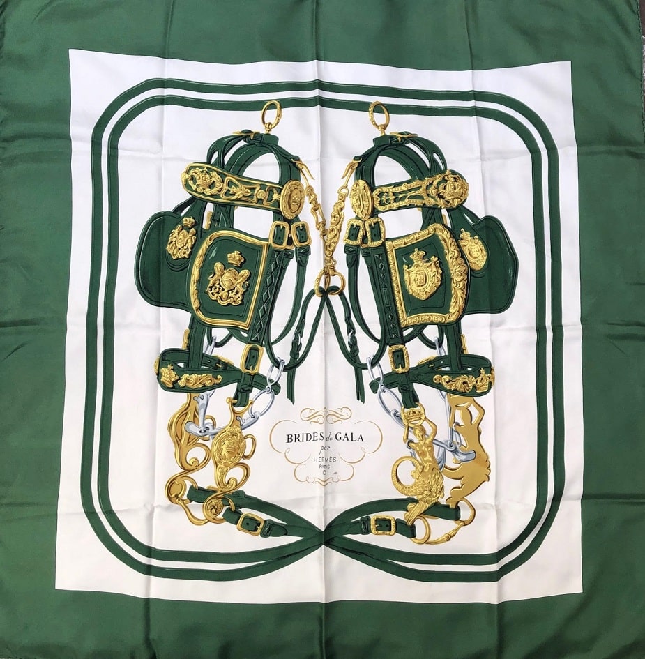 A beautiful Hermès Brides de Gala racing green scarf. This scarf was designed by Hugo Grygkar and first issued in 1957. Large racing green colour border, green and gold with a soft off-white background with horsebit equestrian design. It is a beautiful classic and dramatic design ‘Must-Have an investment piece’. One of the Queen favourite Hermès headscarf, Queen’s Diamond Jubilee: Her Majesty’s best accessories in practical, yet chic, fashion for decades. This essential Hermès accessory complements any outfit. It can be worn in many ways – around your neck, as a top, at your waist or as a headscarf!