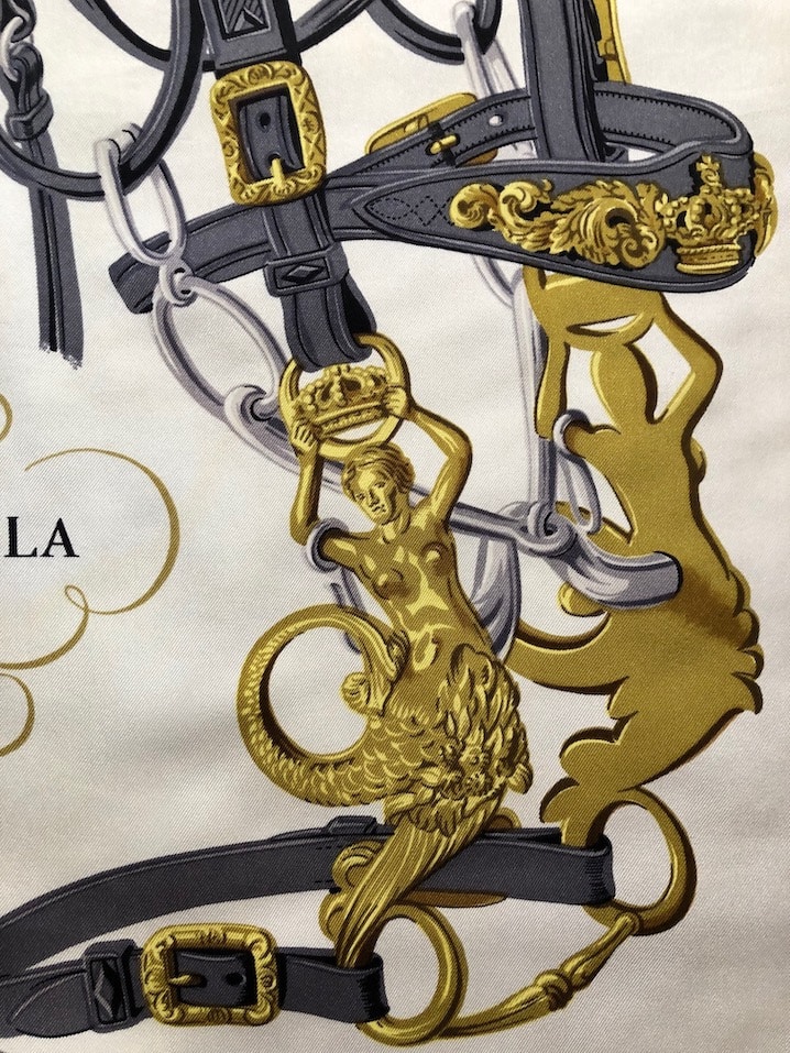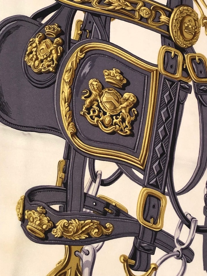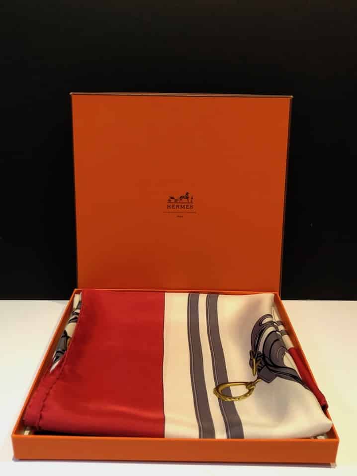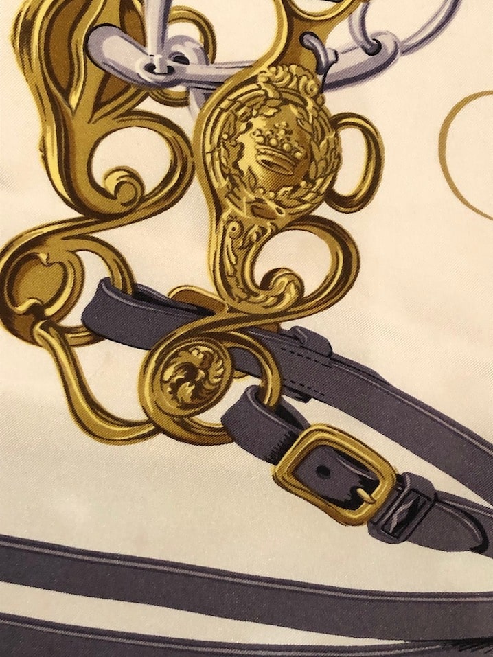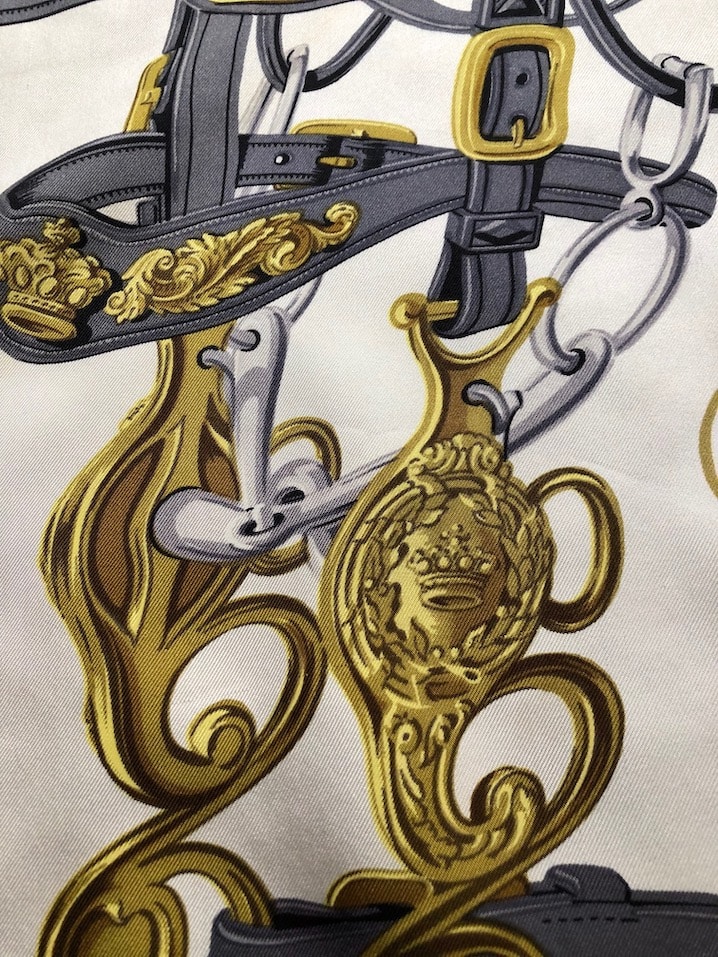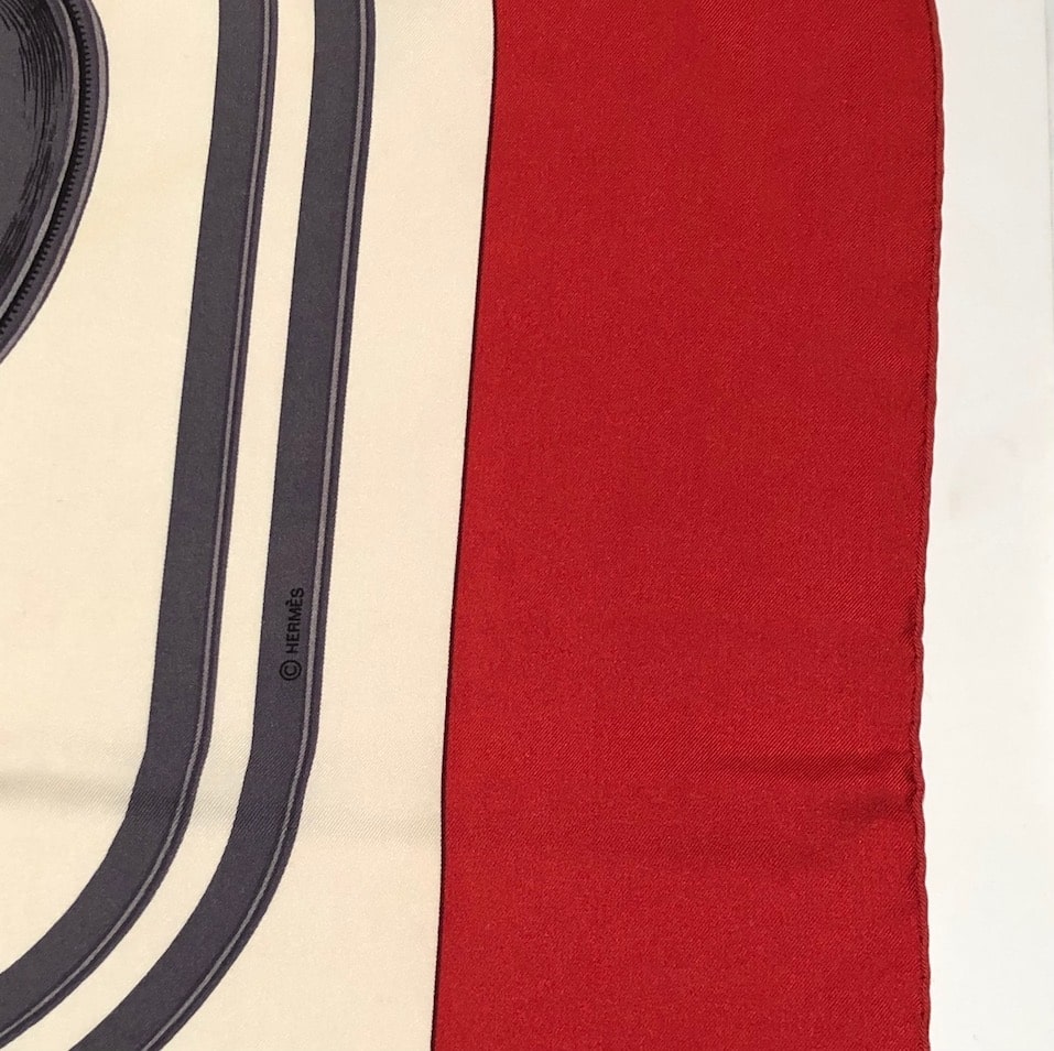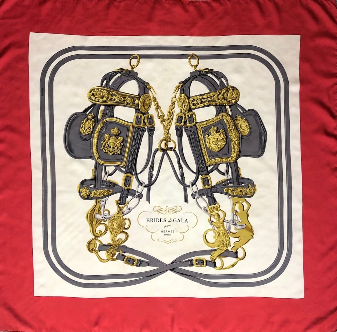 A beautiful Hermès Brides de Gala red-grey-gold scarf. This scarf was designed by Hugo Grygkar and first issued in 1957. Large red border, grey and gold with a soft off-white background with horsebit equestrian design. It is a beautiful classic and dramatic design. ‘Must-Have an investment piece’. One of the Queen favourite Hermès headscarf as per copyright photo, Queen’s Diamond Jubilee: Her Majesty’s best accessories in practical, yet chic, fashion for decades. A Must-Have, investment piece to hold. This essential Hermès accessory complements any outfit. It can be worn in many ways – around your neck, as a top, at your waist or as a headscarf! Styled in the photos with a Hermès Chaine d’Ancre Scarf Ring and a Grand Apparat Hermès scarf.