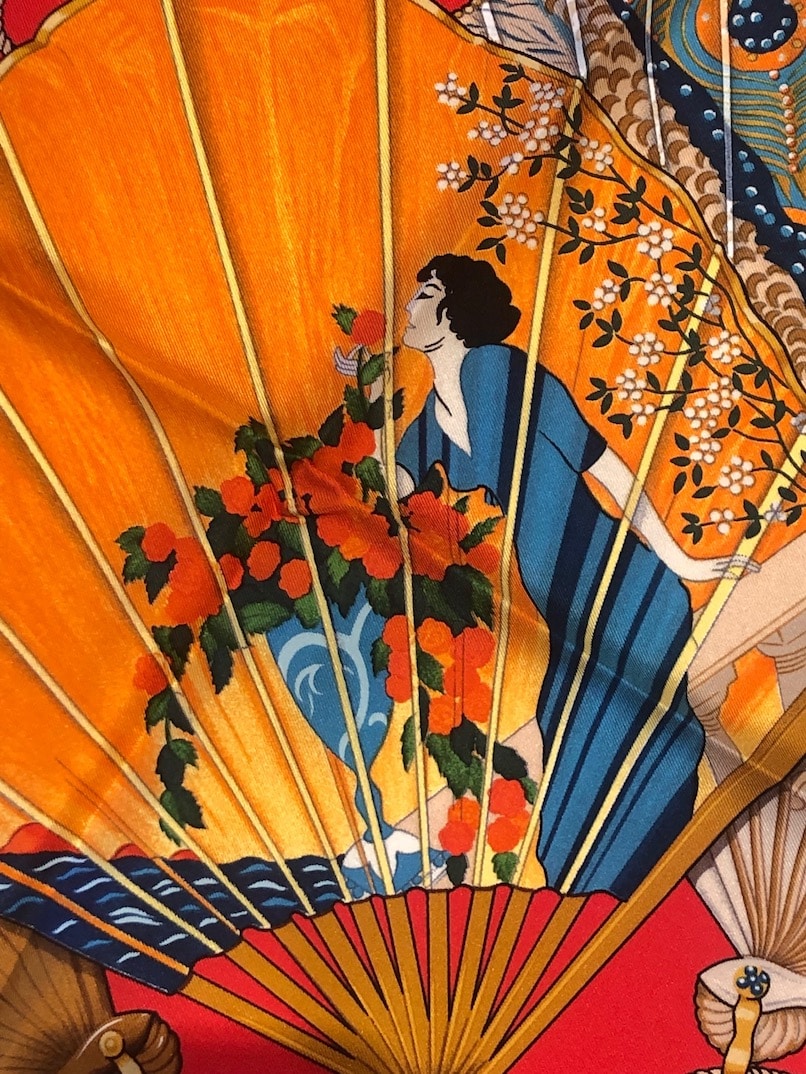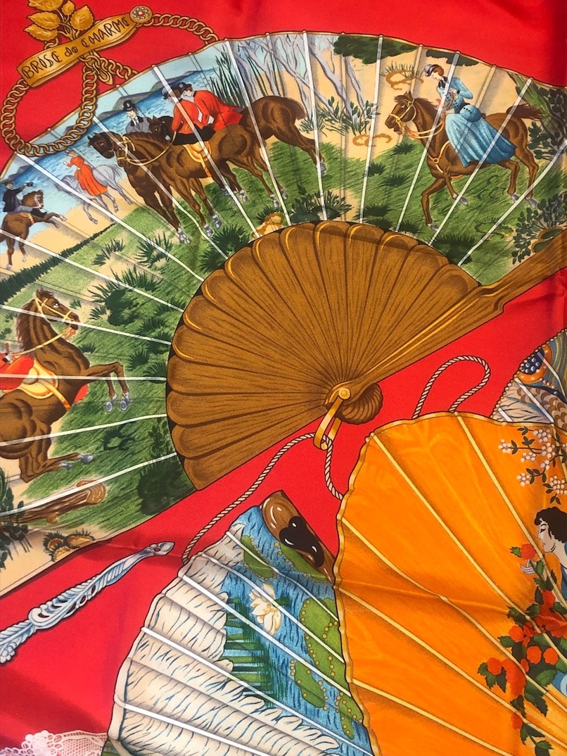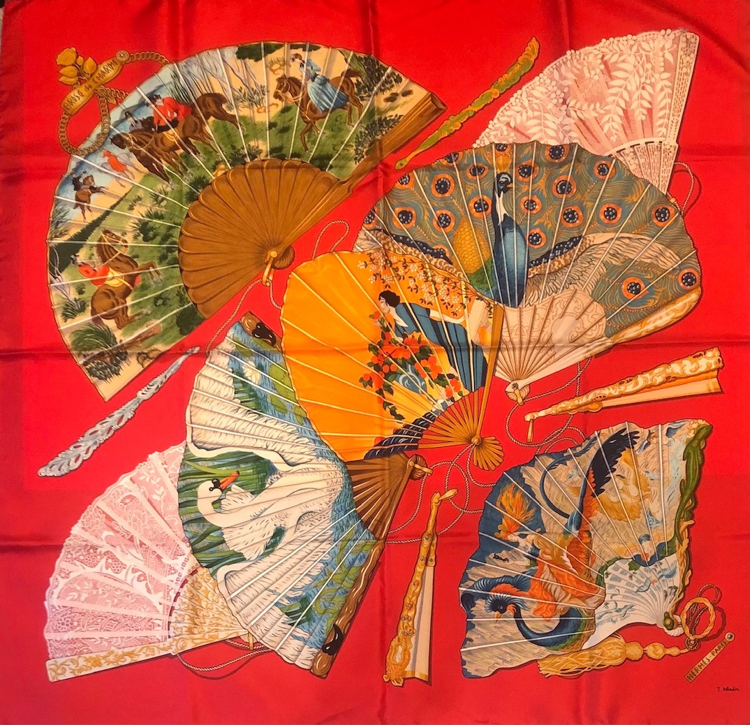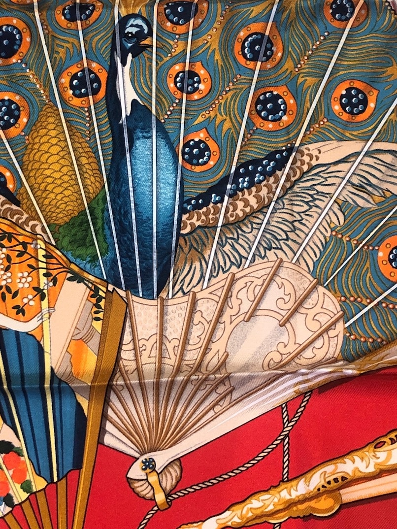 A spectacular Hermès vintage Brise de Charme, as new, never worn. It was designed by Julia Abadie in 1985, original issue. This scarf features a fan motif with open and closed fans in a multicoloured design with lace, swan, horses and a colourful peacock. Stunning colour and a versatile design by Madame Abadie. Madame Abadie designed several scarves for Hermès and this one is without doubt one of my favourite. ‘Must Have’ this Hermès vintage scarf.