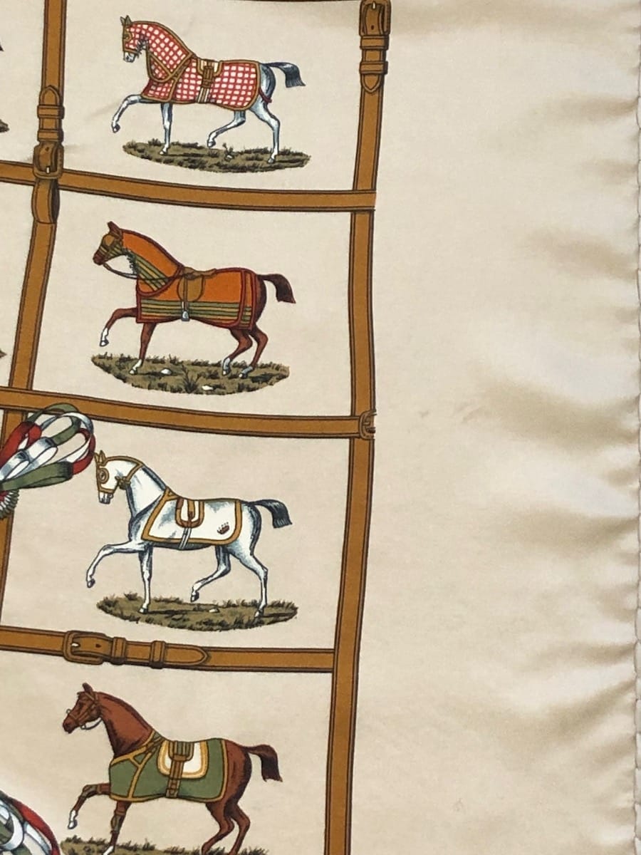 An emblematic Hermès design, beautiful horses, a RARE first issue ‘Couvertures et Tenues du Jour’ with box. This scarf was design by Jacques Eudel in 1974 and this is the first issue. This design with multiple equestrian horses has never been reissued. However in 2006, Hermès reissued a special issue commemorating the FEI World Equestrian Games, which were held in Aachen, Germany from August 20th to September 3rd, 2006. The design has slightly changed, a medal was added in the middle in which it is written ‘Couvertures et tenues de jour – pour l’écurie l’attente et la présentation. The design represents a multiple horses covered with a blanket marked with the design and colour of each owner and adapted to each event of the day: the stable, the wait, the presentation… Must-Have’ a collectible rare scarf.