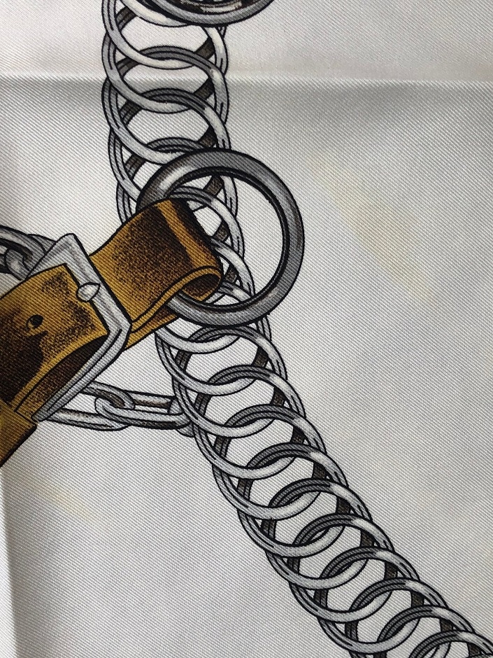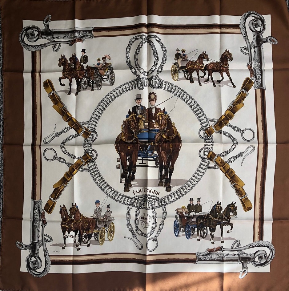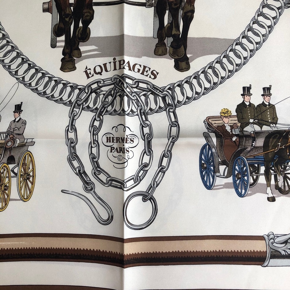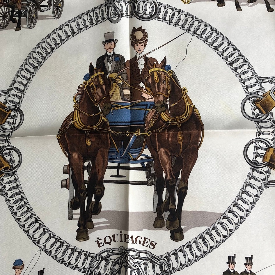 This is a beautiful classic, vintage Hermès equestrian Equipages scarf. Philippe Ledoux is one of Hermès favourite artist, this scarf was first issued in 1973. Representing magnificent various transportation riding scenes centered with a large chain circle with a carriage and a crew.