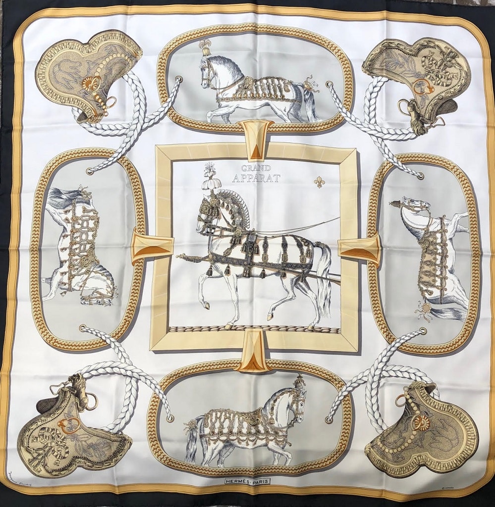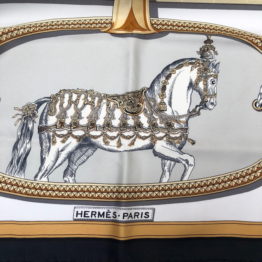 A sublime vintage Hermès Grand Apparat silk scarf with splendid dressage horses. This scarf was designed by Jacques Eudel in 1962, various reissues. Black and gold border, soft colour scheme, black, grey and gold, four oval frames with the dressage horses ready for parade.