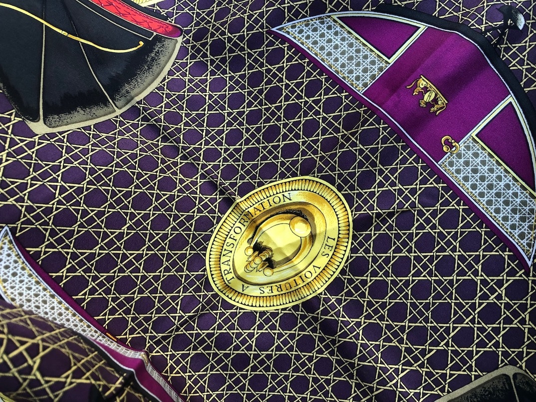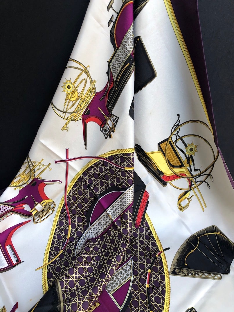 A colourful vintage early issue Hermès Silk Scarf ‘Les Voitures à Transformation I’ with box. This scarf was design by Francoise de la Perrière in 1965 and this is the first early issue – reedited in 2017 Les Voitures à Transformation II. It is a beautiful and a rare design with purple border, off-white background with a mix of gold, red, black and purple colour. The pattern depicts beautiful carriages in different processing stages. Must-Have’ a collectible piece.