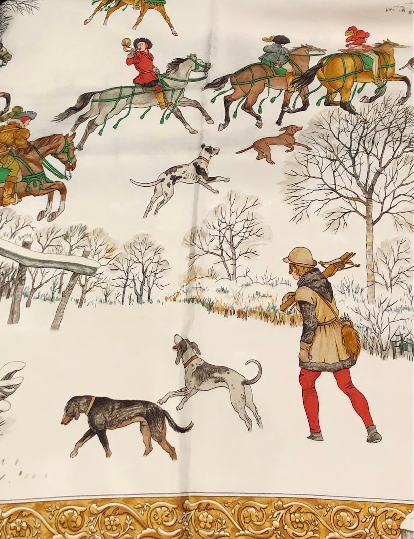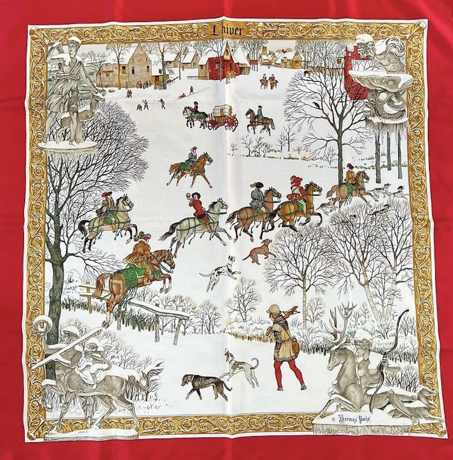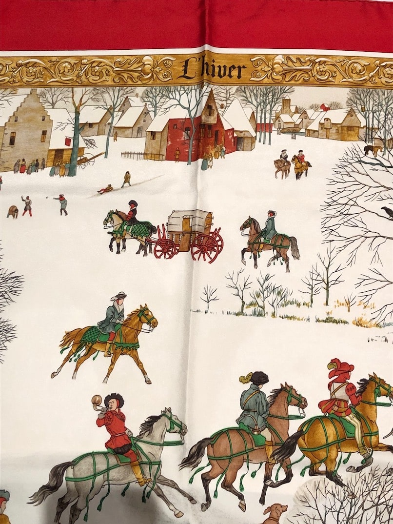 A magnificent Hermès winter scarf. This scarf was designed by Ledoux in 1968 and this is an original issue. Depicting a beautiful wintery village scene with several characters, horse riders, manticore, dogs and people playing in the snow… Red border with off white background with multicoloured.