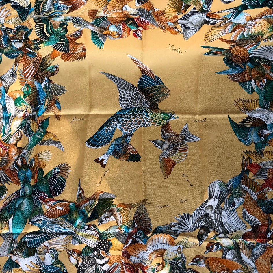 A grandiose Hermès l’Intrus silk scarf in a majestic gold colour. This scarf was designed by Antoine de Jacquelot and first issued in 1996. This magnificent scarf represents various variety of birds and at the center a majestic falcon ‘the intruder’ surrounded by a flury of various birds variety from Kestrel, Turkish Turtle Dove, Black Mesange, Swallow, Kingfisher…The artist wrote with care all of the names of each birds all around the border. Exquisite soft neutrals colour punctuated by rich greens, reds, grey colour tone.