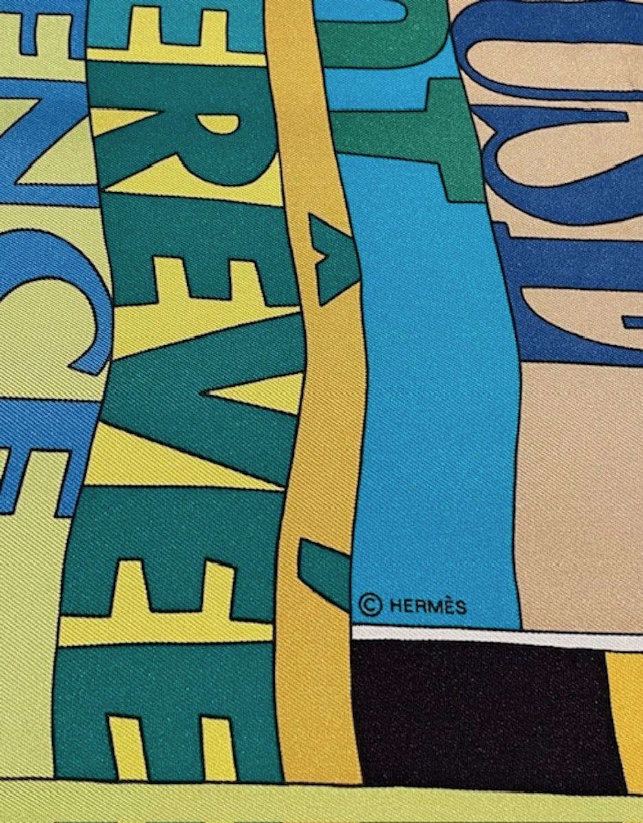 This stunning Hermès silk scarf “Mots de Soie” from 2011 is new, never worn. This scarf is designed by Virginie Jamin for Hermès in 2011. Green border with stunning multi coloured tone with various green, blue, gold, brown. The silk word is translated in different languages with different fonts and sizes. A ‘Must-Have’ Hermès collector scarf in your wardrobe and or a perfect gift for any occasion.