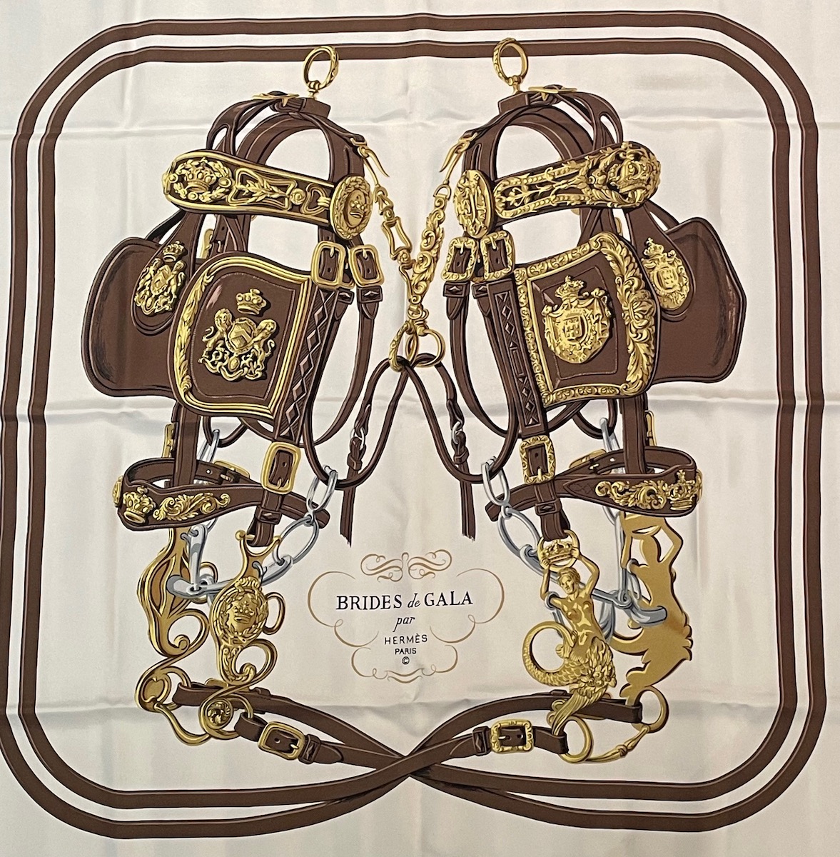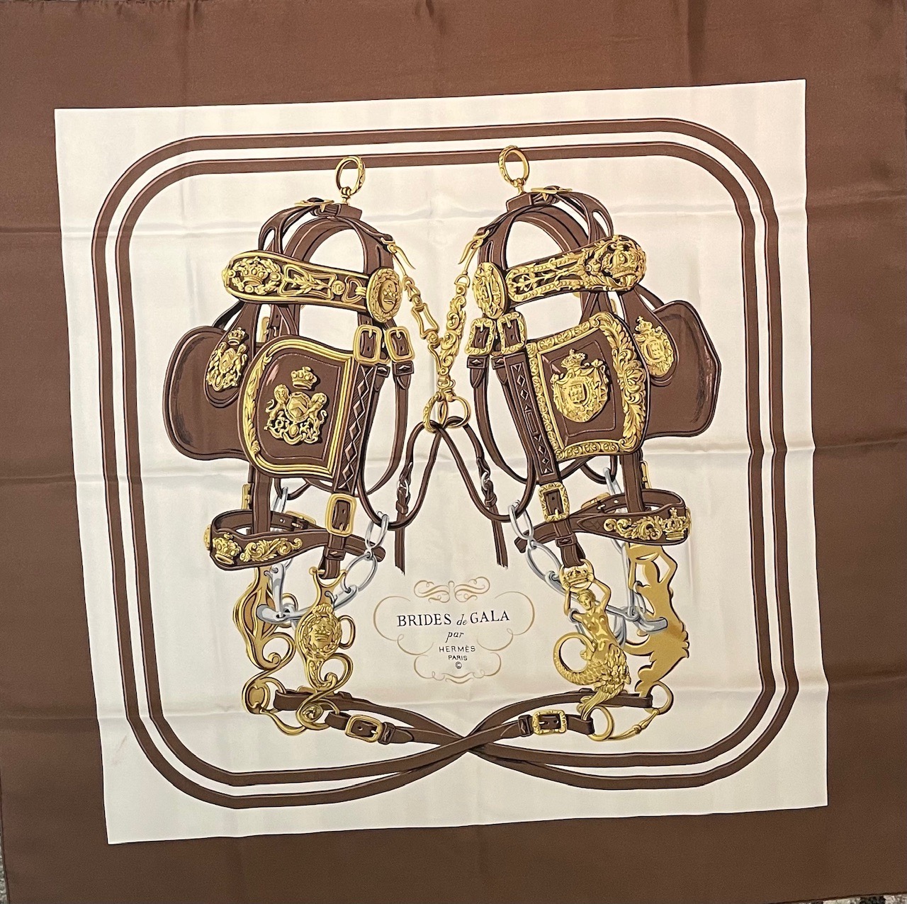 HERMÈS Vintage Silk Scarf BRIDES DE GALA Brown By Hugo Grygkar C.1990s W/Box