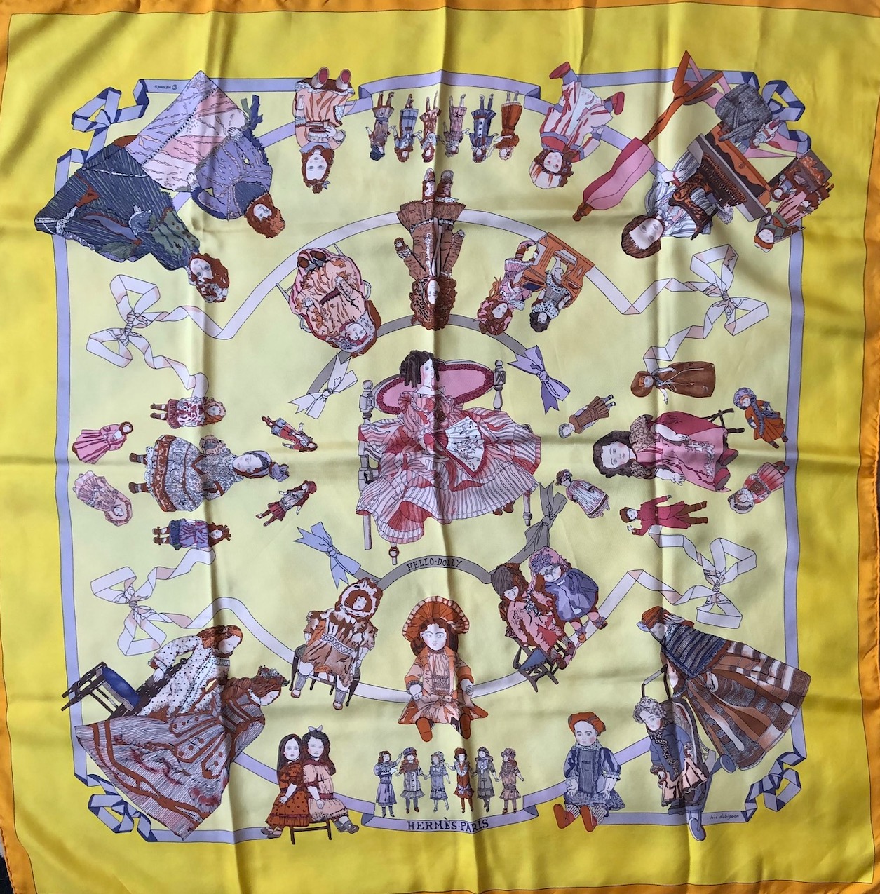 A very rare highly collectible vintage Hermès scarf Hello Dolly. A vibrant multi Doll’s scarf with orange border, pale yellow background with multi colour doll’s. This scarf was designed by Loïc Dubigeon in 1990 and this is the first issue with the copyright. A ‘Must-Have’ Hermès vintage collectible scarf in your wardrobe, an ideal gift, complete with box.