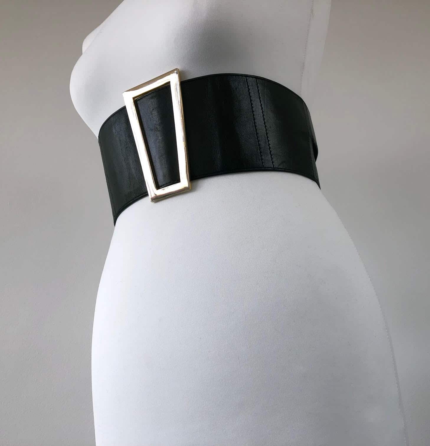 A very sexy vintage Karl Lagerfeld leather corset waist black belt with stitching to enhance your shape. A beautiful adjustable belt with an oversize amazing geometric buckle with two rear twin straps with buckles fastening behind. Very comfortable and suitable for your normal or casual wear and this Lagerfeld corset belt will transform any outfit jeans, skirt and dresses. It is a very feminine belt and perfect for any look or occasion.