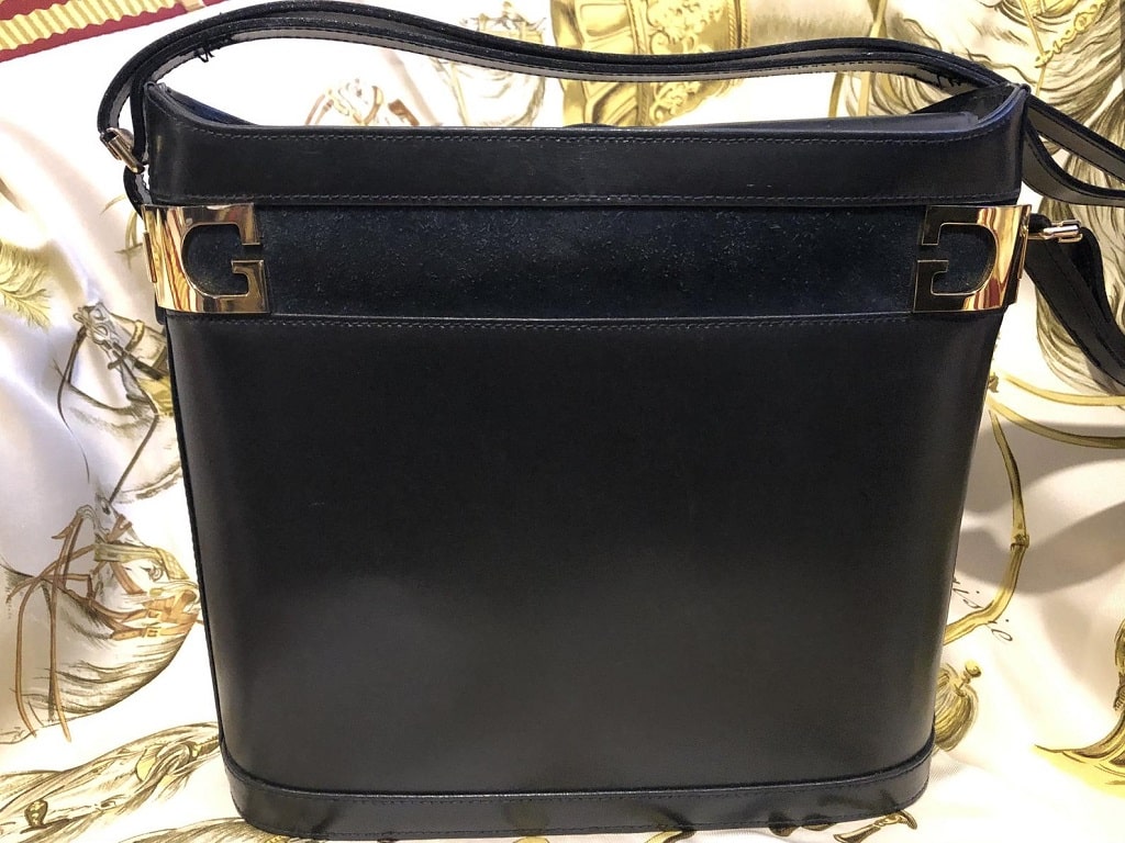 Very elegant, vintage bucket bag, beautiful patina. Handcrafted in Italy with Italian calf leather box. The bag has a rare unusual shape, styled with a horizontal navy blue suede stripe-band with gold-tone hardware. A single leather shoulder strap with gold-tone hardware. Hidden gold-tone stud closure from the top. One zip interior pocket. Amazing craftsmanship work.