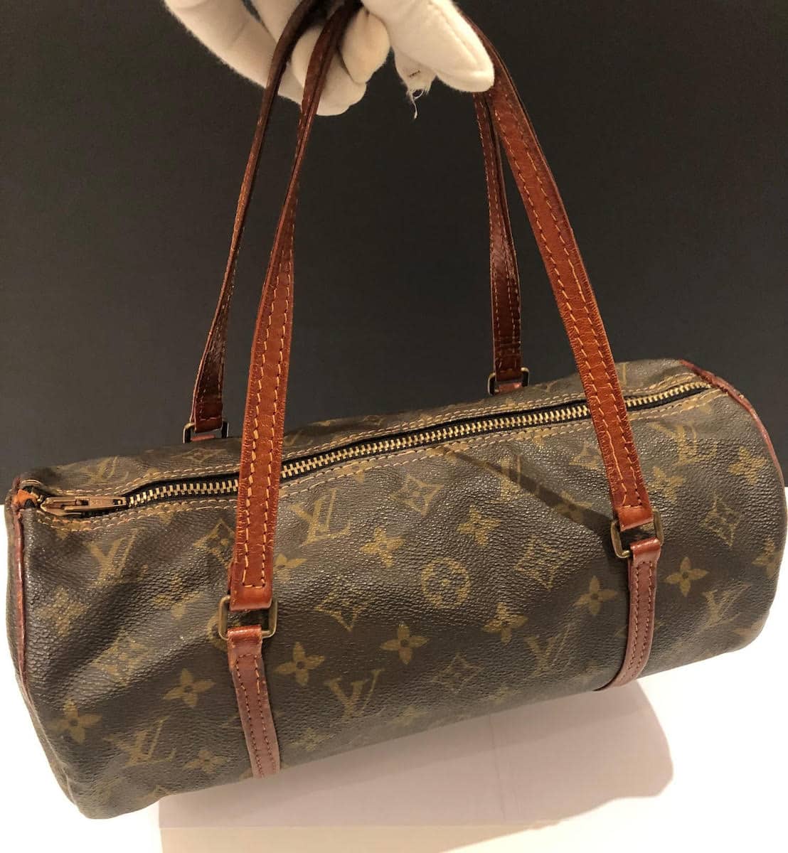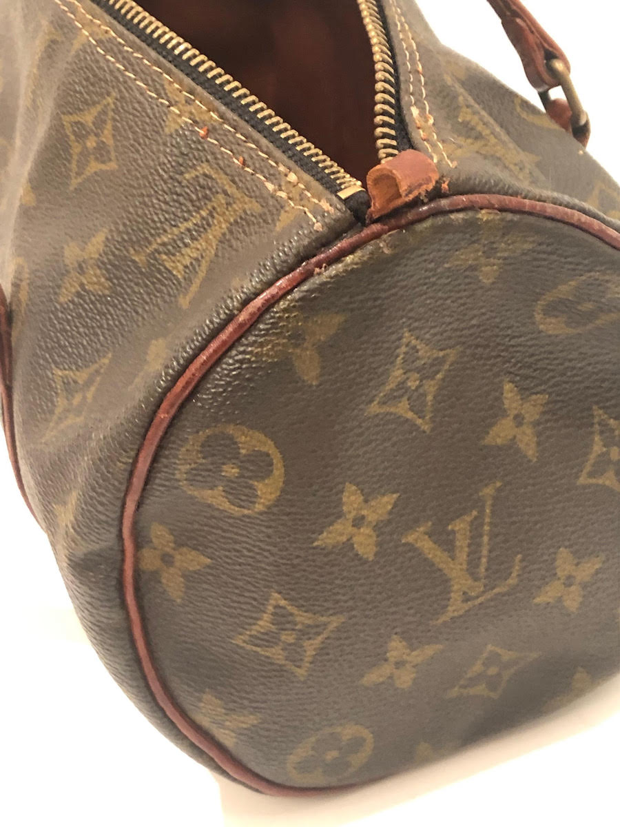 A truly vintage 1970s Louis Vuitton Papillon 30 brown bag. Considering it’s old age this LV bag has kept a beautiful leather patina with some sign of wear. The canvas monogram leather is still beautiful with no holes and no stains. Beautiful used handles leather patina. The gold tone hardware buckle a bit tarnish. The interior is lined in brown leather with no smell but it is stained, including pencil marks. Closing at the top with a full OPTI zip. This LV papillon does not have a Date Code stamped because it is a vintage piece and made in 1970s.