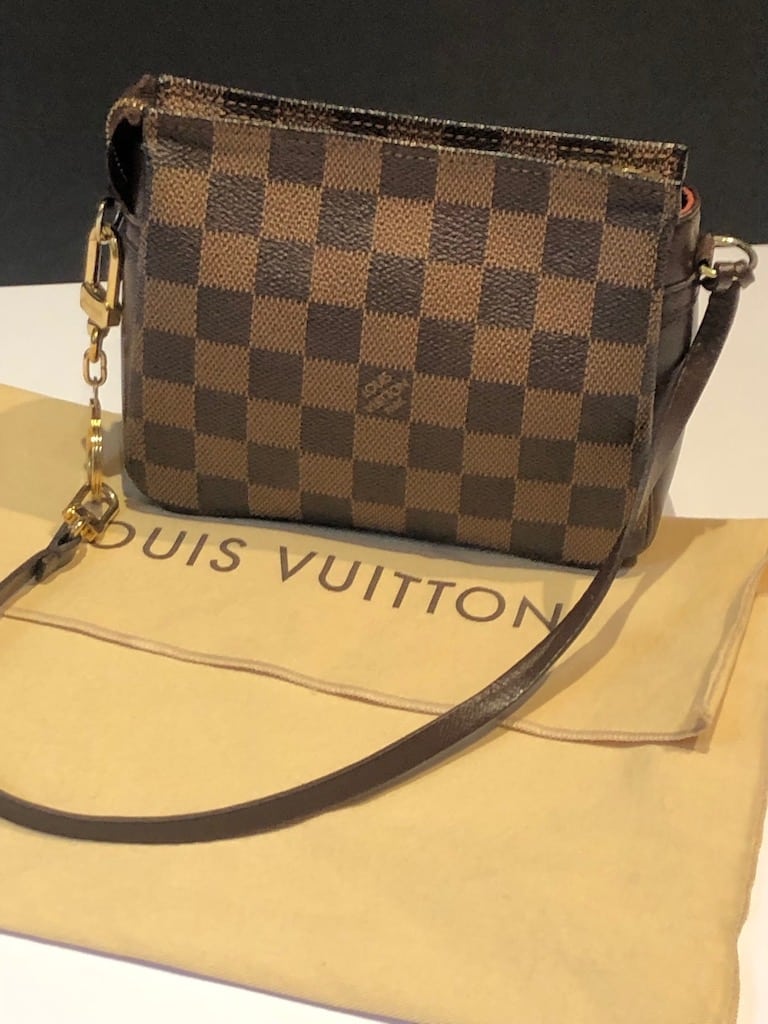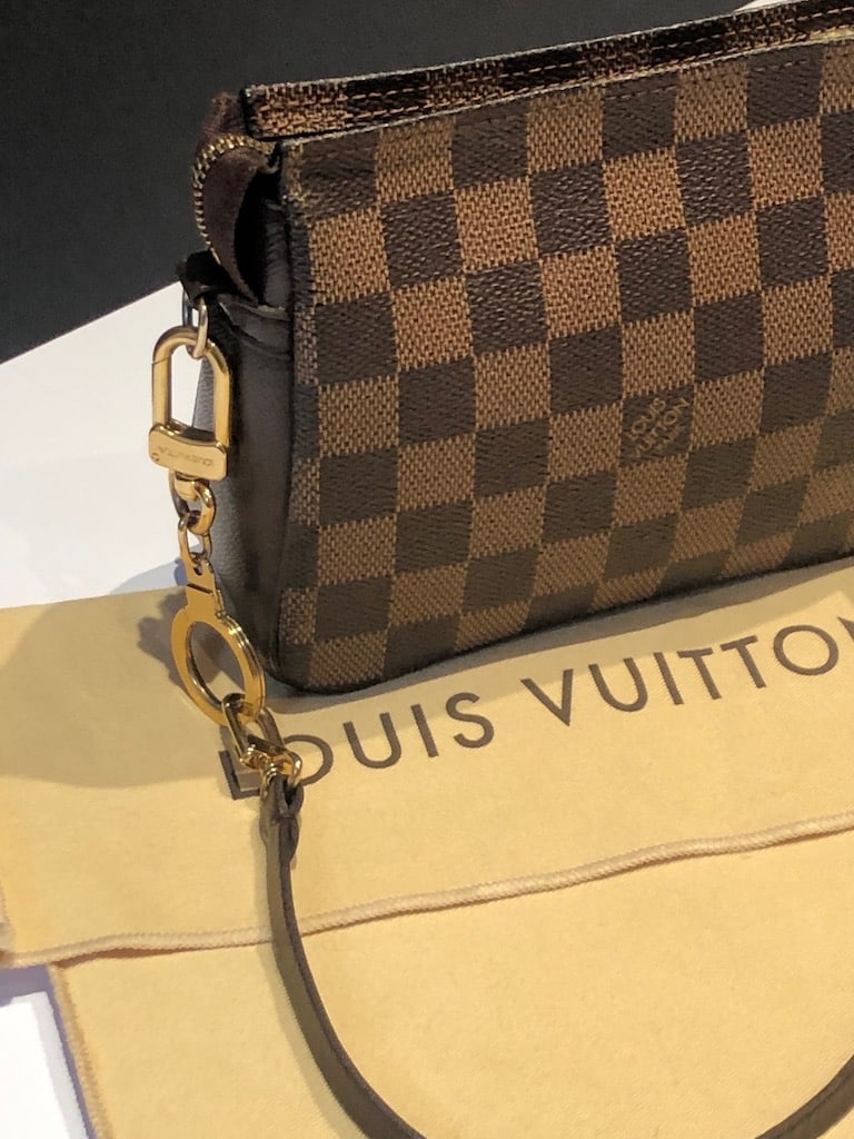 A very cute mini Louis Vuitton 2001 damier ebène canvas bag. It is sold with Louis Vuitton Anneau Keys-Clés gold Tone Key Ring for strap extension (usually sold separately). This beautiful LV mini bag it’s handcrafted in calf leather, lined with brown canvas fabric, full top zip with LV gold tag. One single handle with gold tone hardware. Easy to use on daily basis.