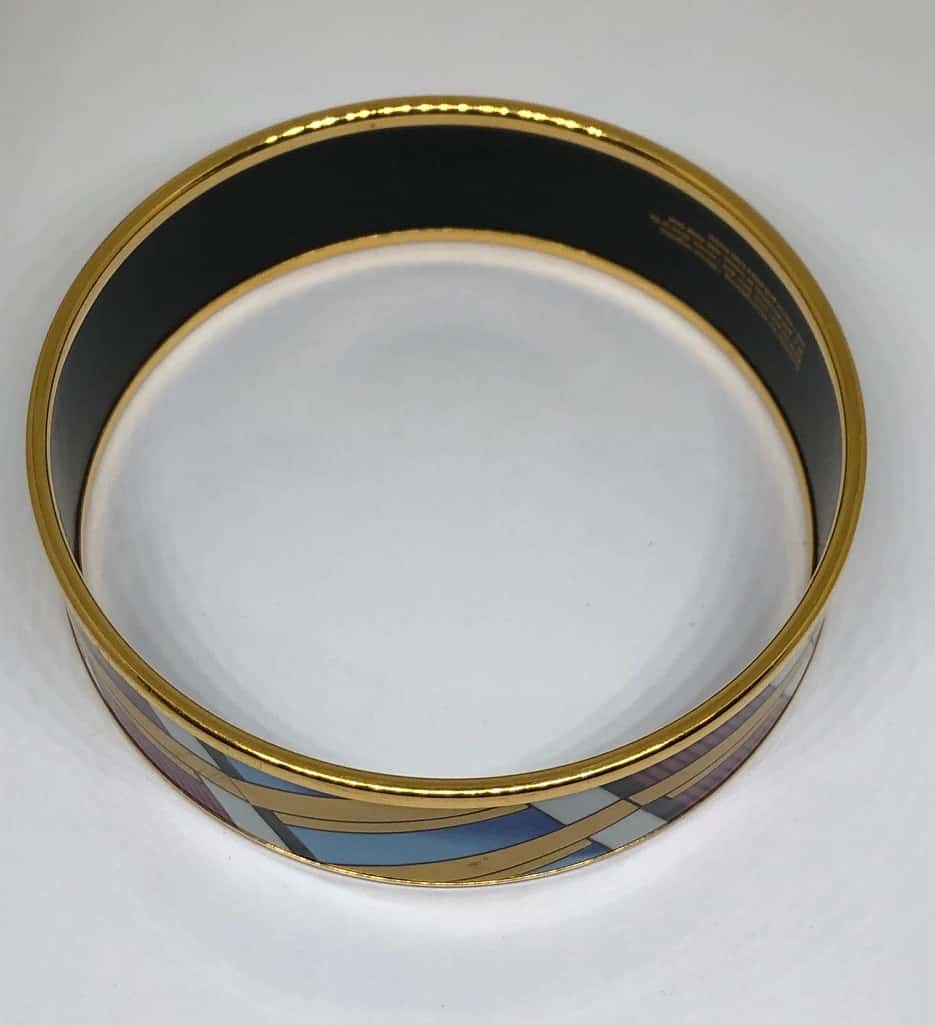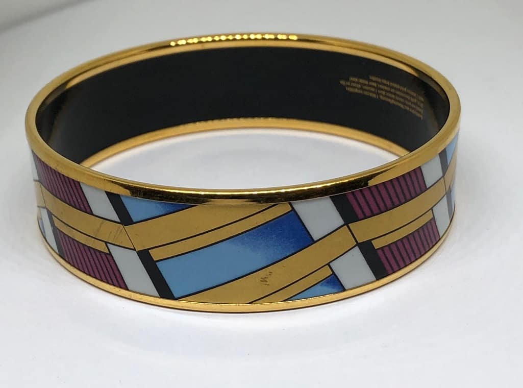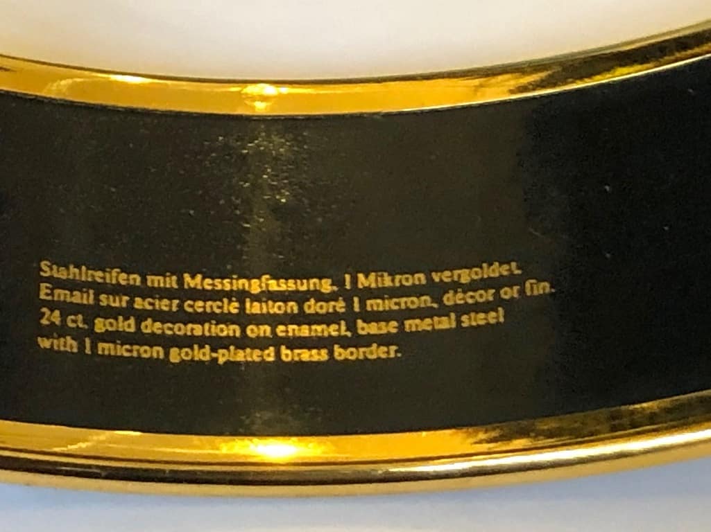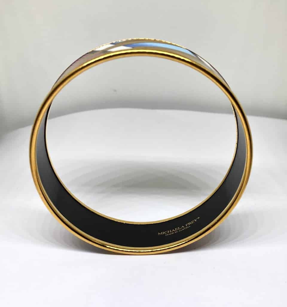 This is a beautiful multicoloured bangle 24ct gold decoration on enamel, base metal steel with 1 micron gold-plated brass border. It is designed by Michaela Frey and made in Austria in the same workshop that Hermes uses to make their enamel bracelet.