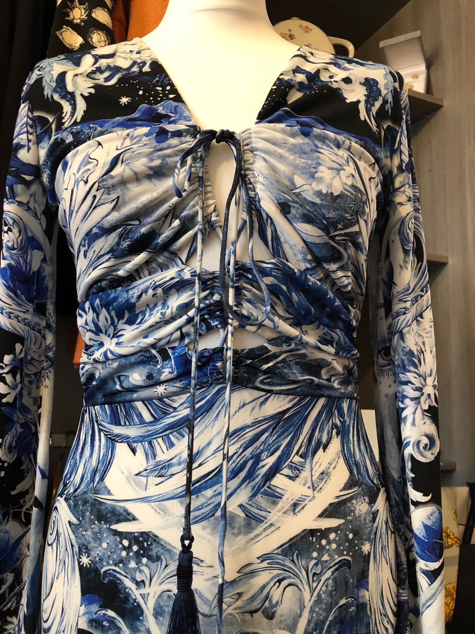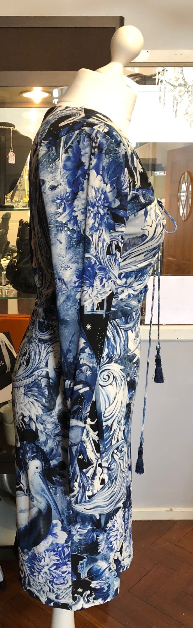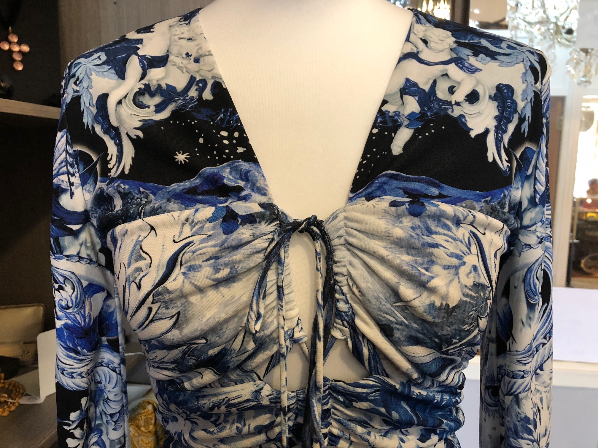 An elegant, comfortable sexy stretch lycra fabric dress, highlighting an exceptional design blue foliage ruched print, beautiful V-Neck with tassel and ribbons closure, long sleeves, an amazing fitted blue colour dress and design for day time or evening from Roberto Cavalli recent collection. This dress is brand new, worn once only.