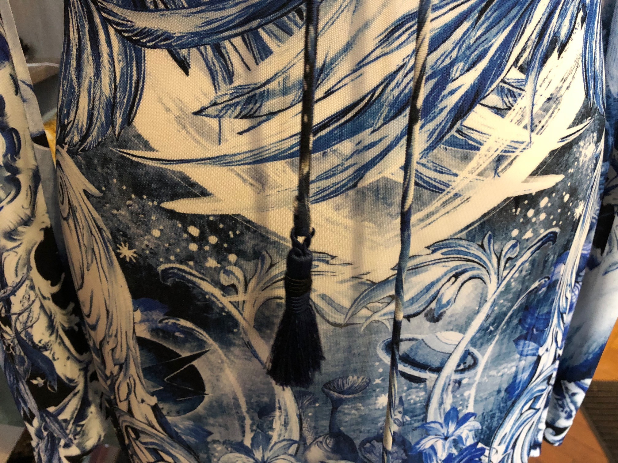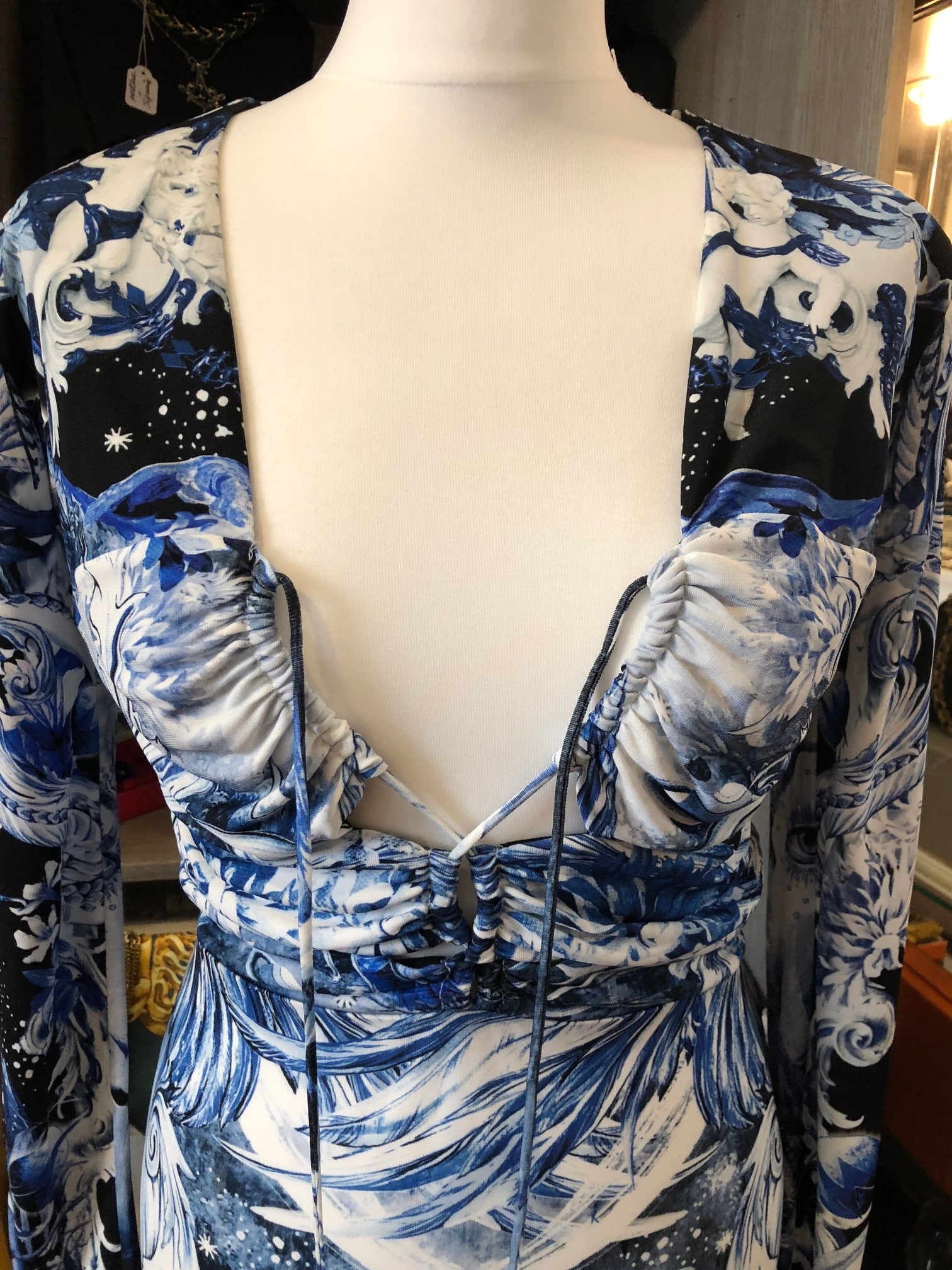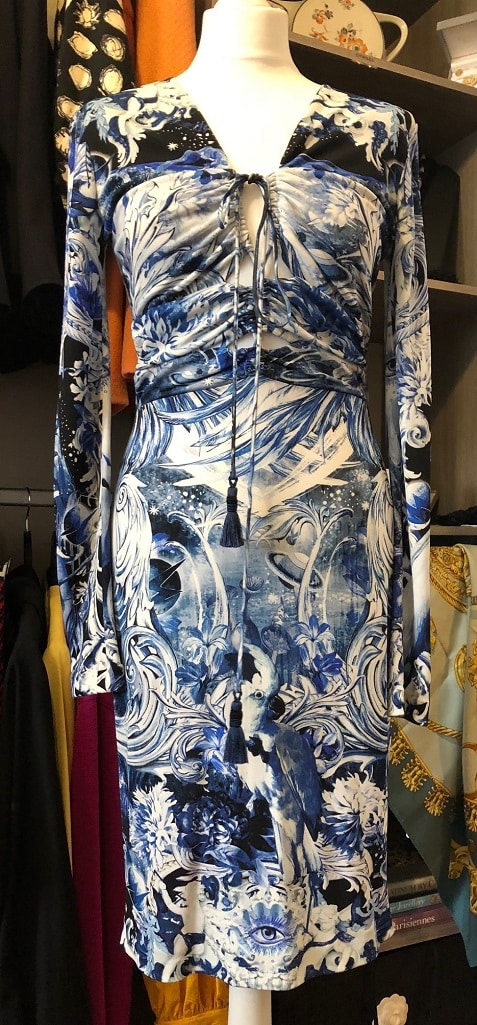 An elegant, comfortable sexy stretch lycra fabric dress, highlighting an exceptional design blue foliage ruched print, beautiful V-Neck with tassel and ribbons closure, long sleeves, an amazing fitted blue colour dress and design for day time or evening from Roberto Cavalli recent collection. This dress is brand new, worn once only.